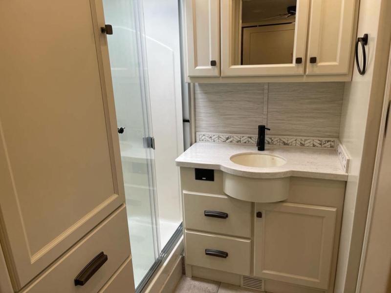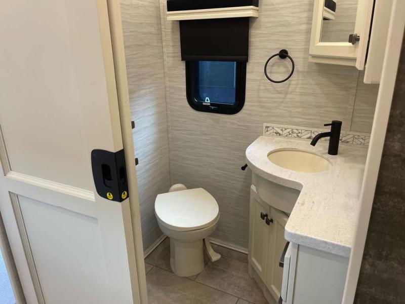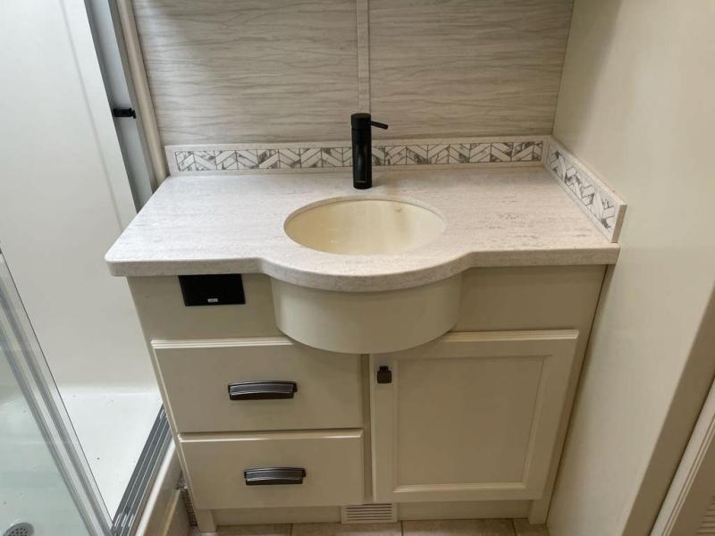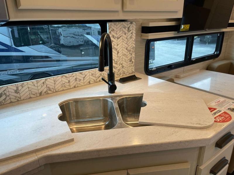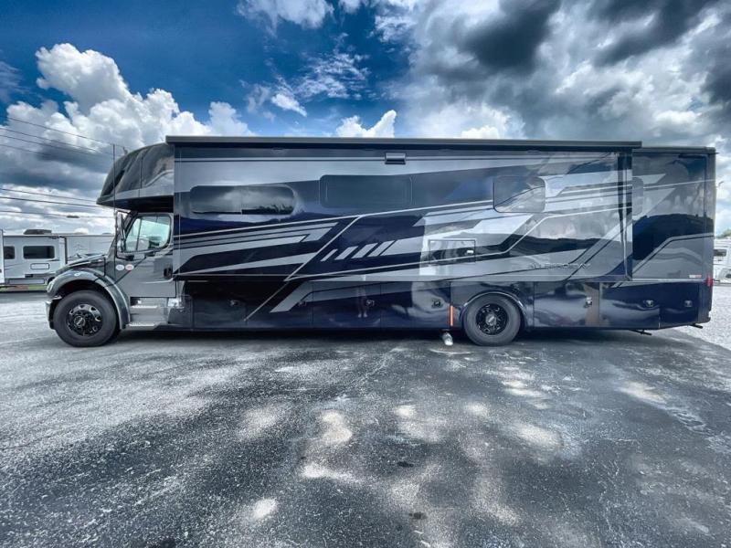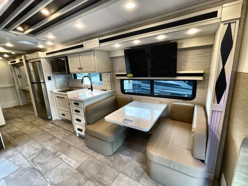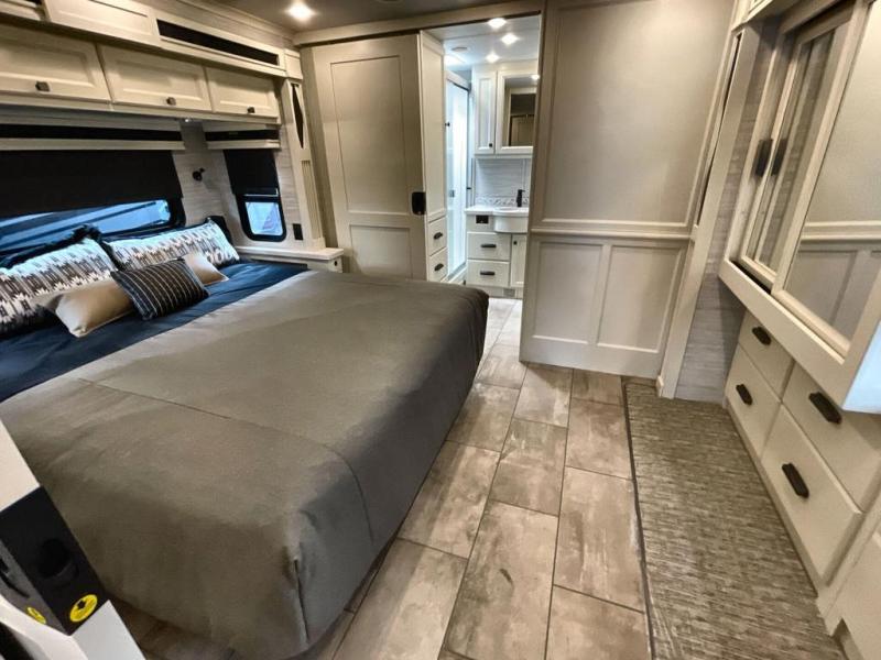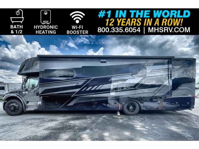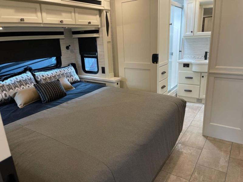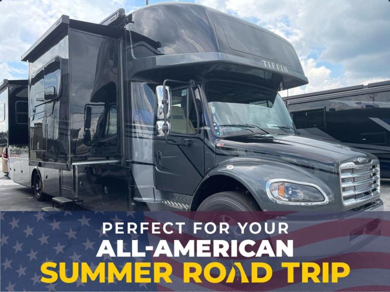 Each Allegro Bay Super C diesel coach by Tiffin Motorhomes sits on a durable Freightliner Custom S2RV chassis with an impressive 360 HP Cummins B6.7 engine for power you can feel. You will appreciate smooth handling thanks to the Trac-Tech full-time NoSPIN differential single rear axle and the automatic traction control. There is a manual release valve for the rear air suspension for added convenience, plus a 12,000 lb. towing capacity that will allow you to bring along the family car or even a horse trailer! This coach includes a Truma AquaGo Comfort instant water heater, AGM extended cycle house batteries, an 8.0 Onan Quiet Diesel generator, plus many more top of the line amenities. You will also love the new Generation 3 paint schemes, an exterior ladder, new matte finish tile flooring option, plus optional Starlink prep in the sewer bay that will give you the option to have internet while you're away from home!