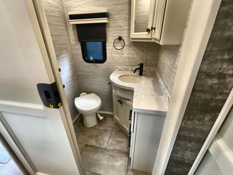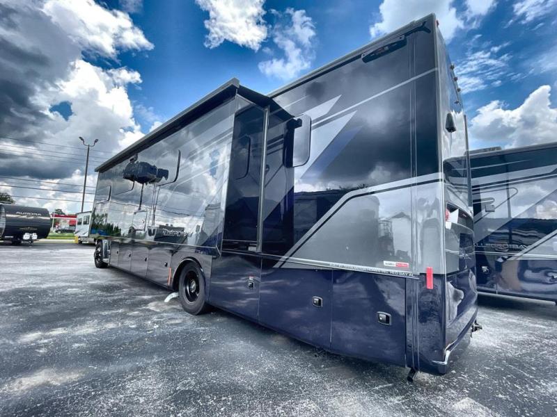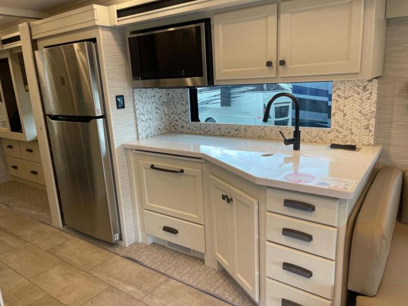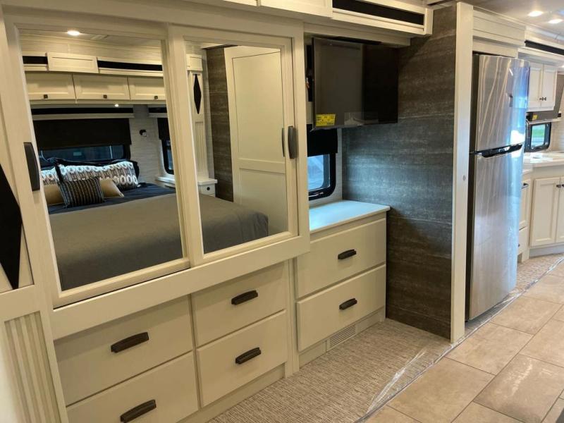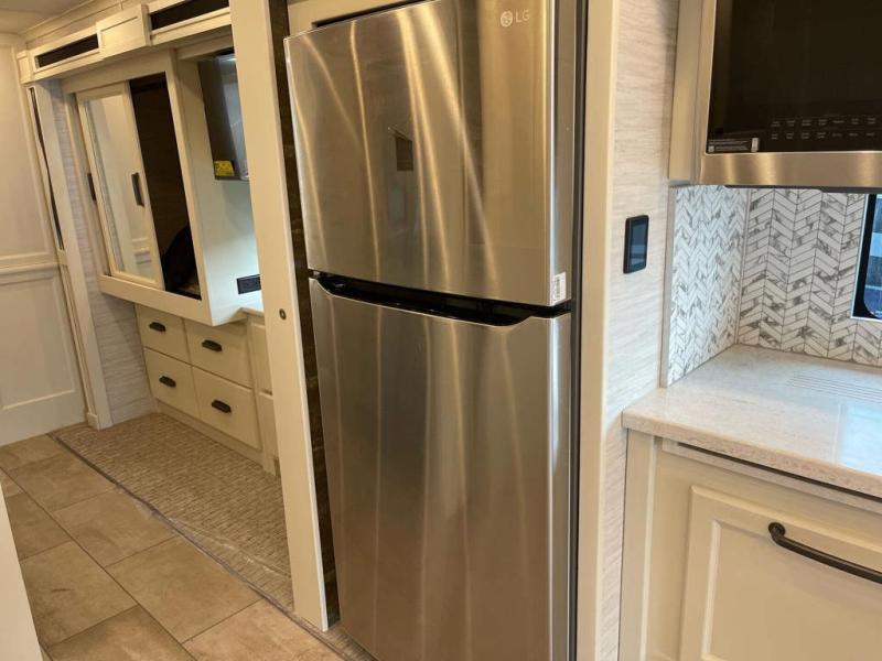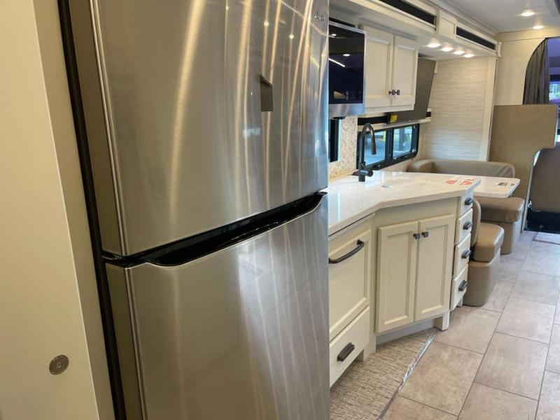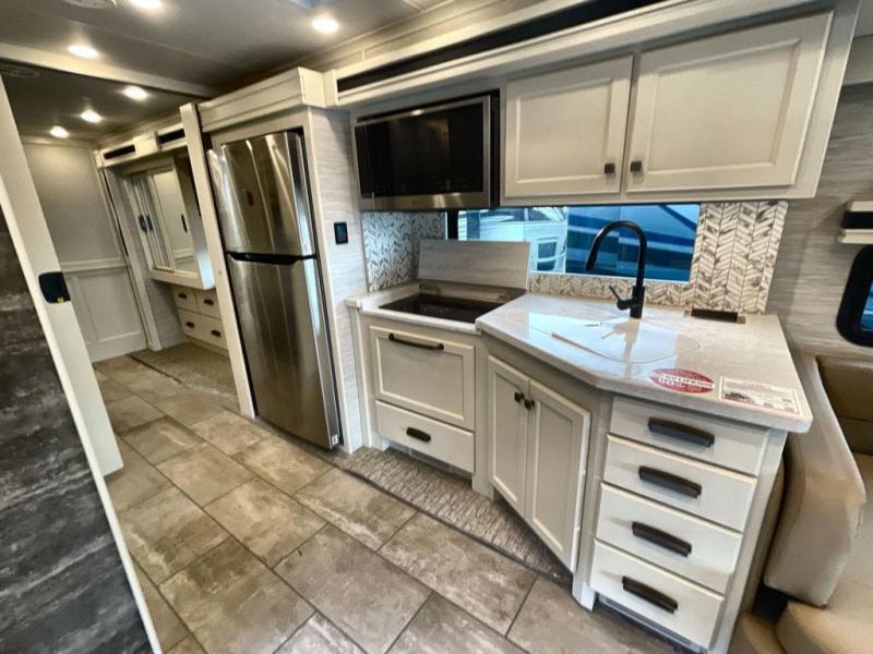 You're going to love the amount of space you having in this coach thanks to the full-wall slide and two additional slides. There is a bath and a half that is sure to come in handy when traveling with friends and family, plus sleeping space for six or seven. The master bedroom will feel just like home with its king bed, wardrobe with drawers below, plus a mounted TV! The booth dinette will provide a place to dine, and there is an air coil sofa bed with furniture mounted swivel tables for even more dining and sleeping space. This model includes a full kitchen with a three burner cooktop, a convection microwave, a counter extension, plus a stainless steel residential refrigerator for all your perishables. There are many options to choose from, including theater seating, a dinette bar, plus an optional stacked washer and dyer and more!