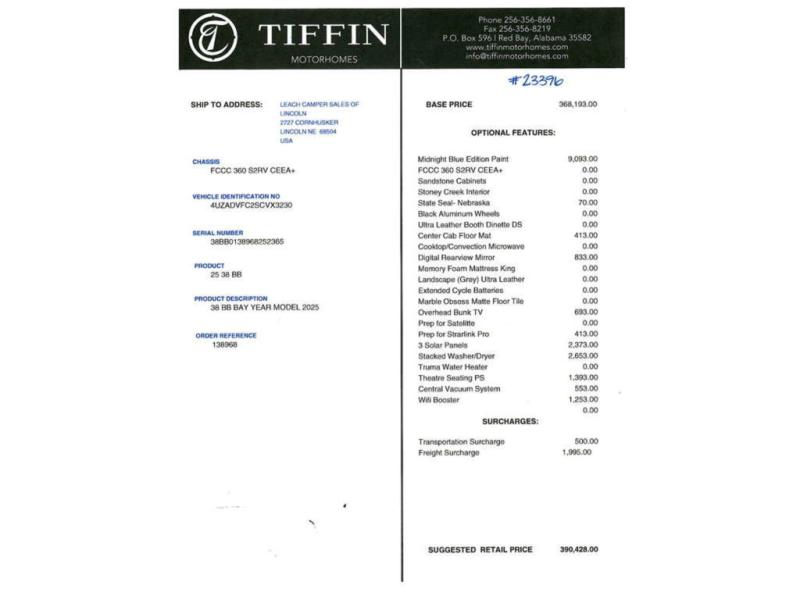 New 2025 Tiffin Motorhomes Allegro Bay 38 BB Motor Home Super C - Diesel