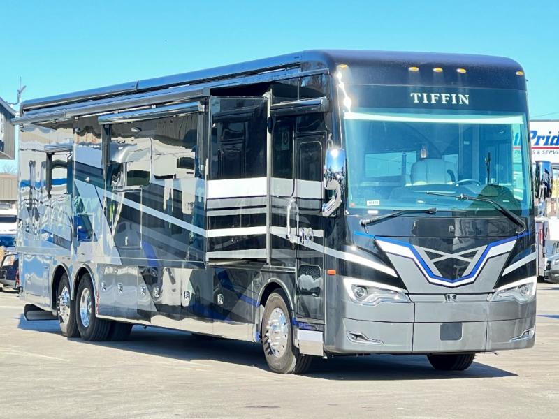 With any Allegro Bus Class A diesel coaches by Tiffin Motorhomes you will experience ultimate luxury, breakthrough technology, and unmatched power thanks to the 450 HP Cummins L9 engine. Each model sits upon a PowerGlide raised rail rear engine diesel chassis for a smooth ride, and you are sure to turn heads with the premium paint system. The captain's job is made easier than ever with the adaptive cruise control, the collision mitigation with forward warning and active braking, and the Valid LCD instrument cluster display with integrated leveling controls. This hydronic heating and electronic appliance-equipped coach features two Girard roof awnings, an Onan 10.0 kW generator, and three 15,000 BTU A/C units to keep you comfortable all year long. New and exciting features include a drawer-style dishwasher on each model, Gold Heat dual zones heated tile floors, a standard exterior ladder, Starlink Pro with a subscription, and more!