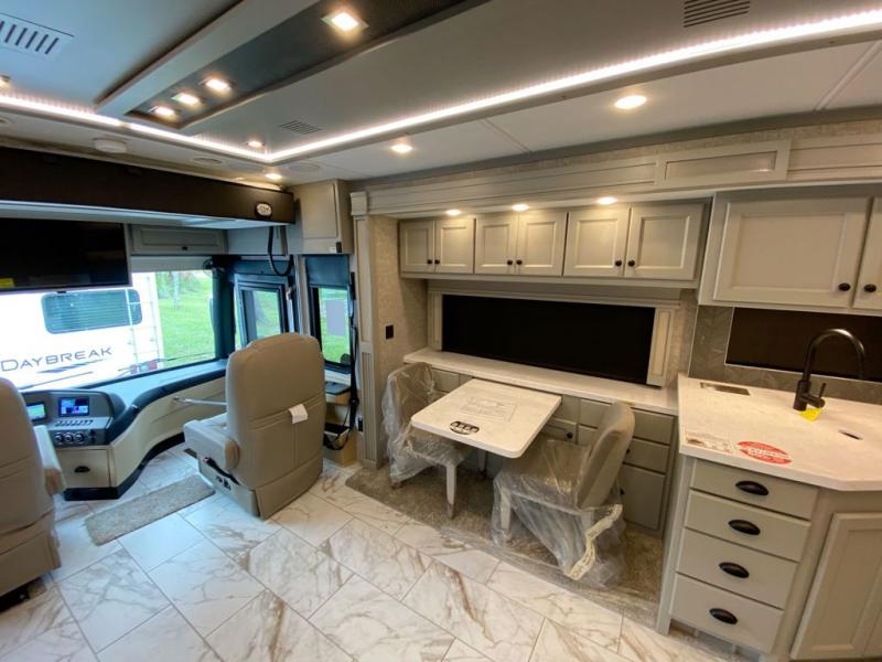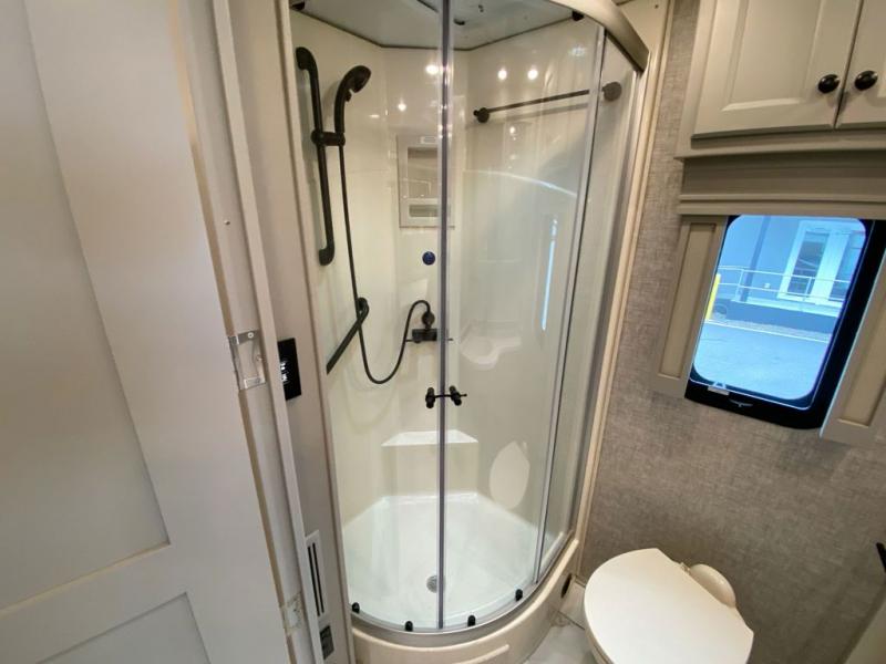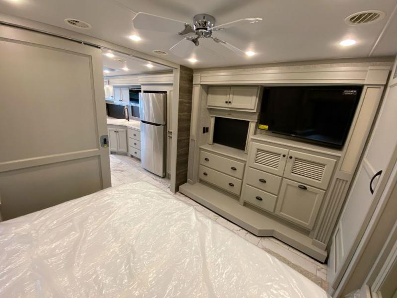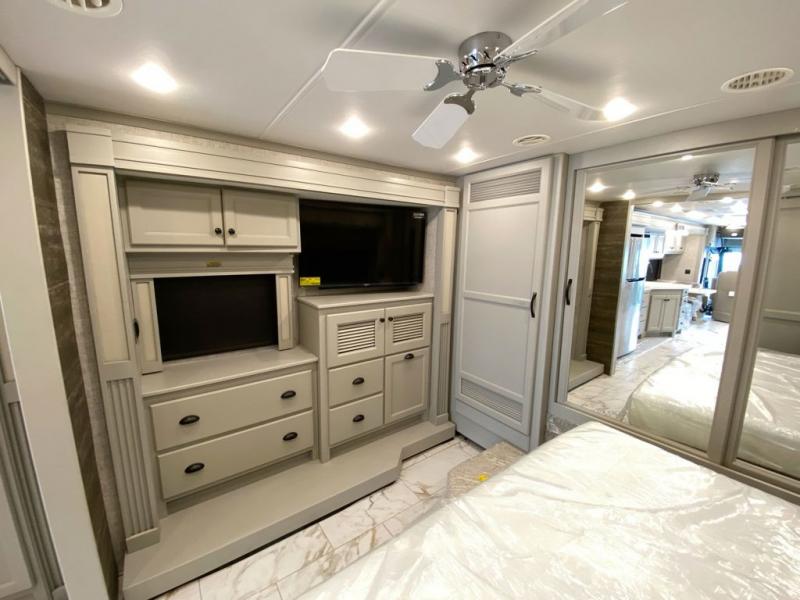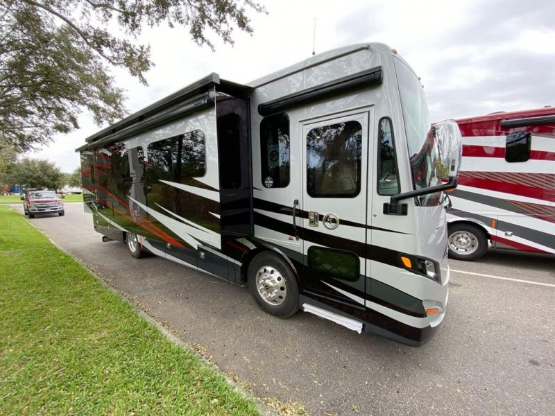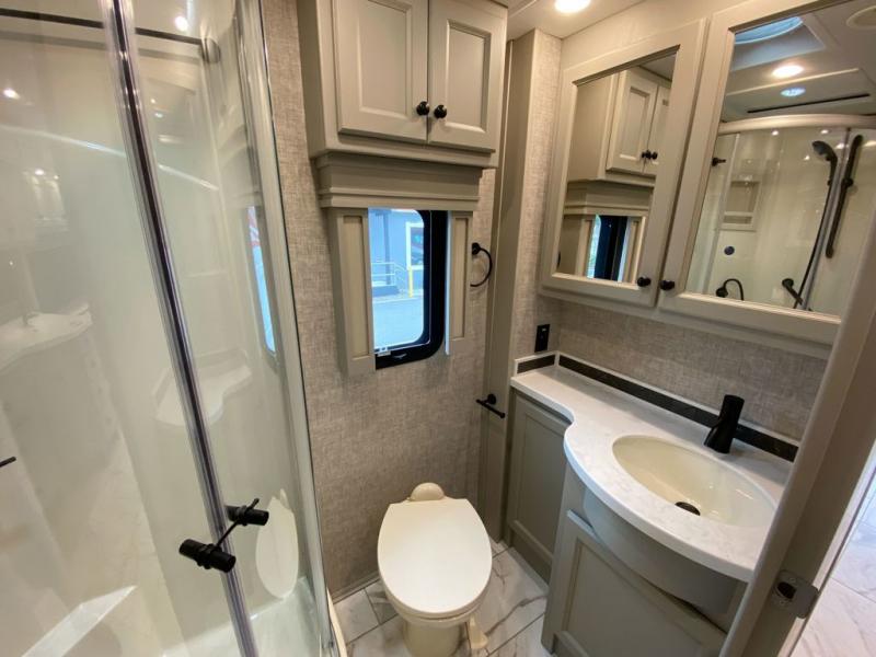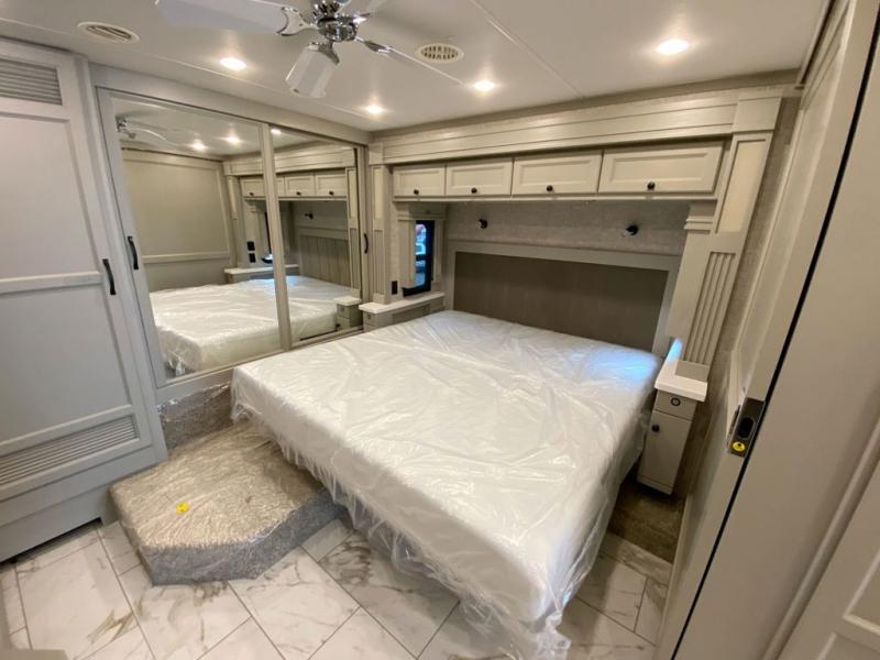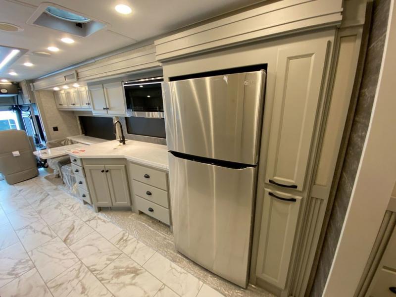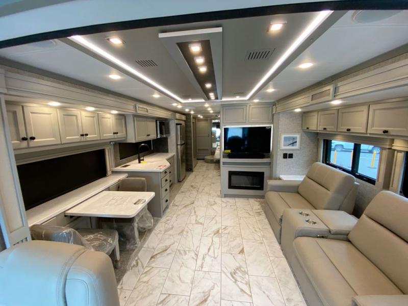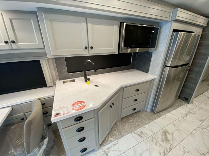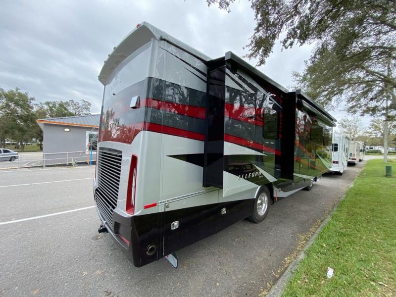 There are many, many reasons you'll instantly fall in love with this Allegro RED Class A diesel motorhome! You have three TVs including an exterior one to keep everyone entertained, and the kitchen is filled with tons of tools to create delicious meals, like a 1.7 cu. ft. smart convection microwave with air fry, 20 cu. ft. stainless steel residential refrigerator with top freezer, pantry, double-bowl sink, and panoramic galley window. You'll also be quite impressed with the full bathroom that has a one-piece fiberglass shower, roof vent fan, solid-surface vanity top, and a skylight and LED light in the shower. If you need more sleeping space in addition to the 72" x 80" king bed, air coil sofa bed, a booth dinette sleeper, you could switch out for three different seating choices, including an optional super sofa or U-shaped dinette!