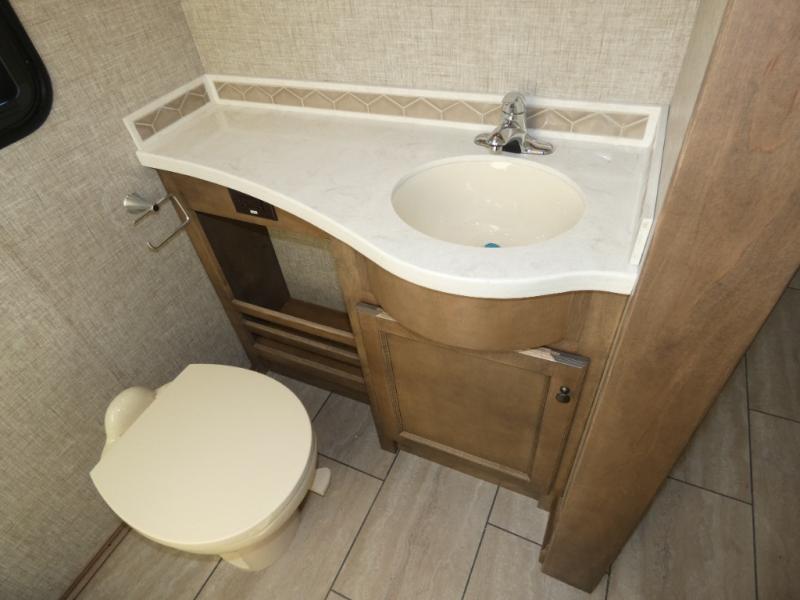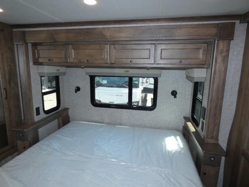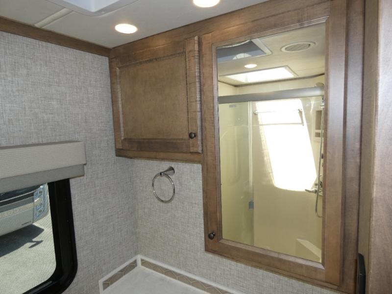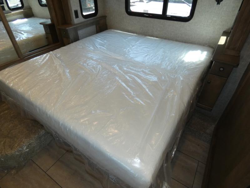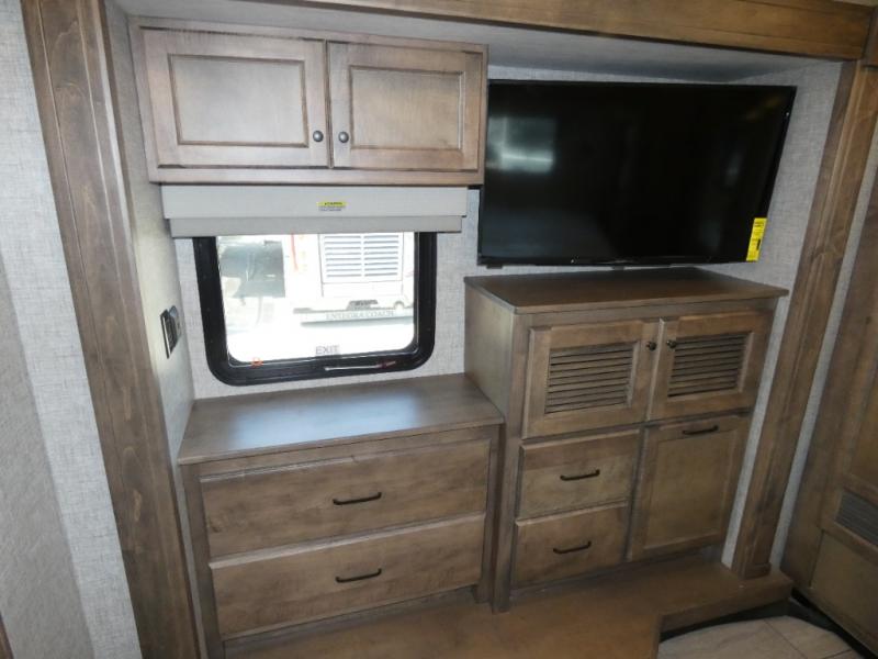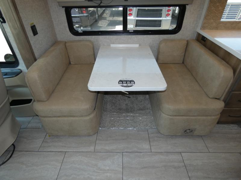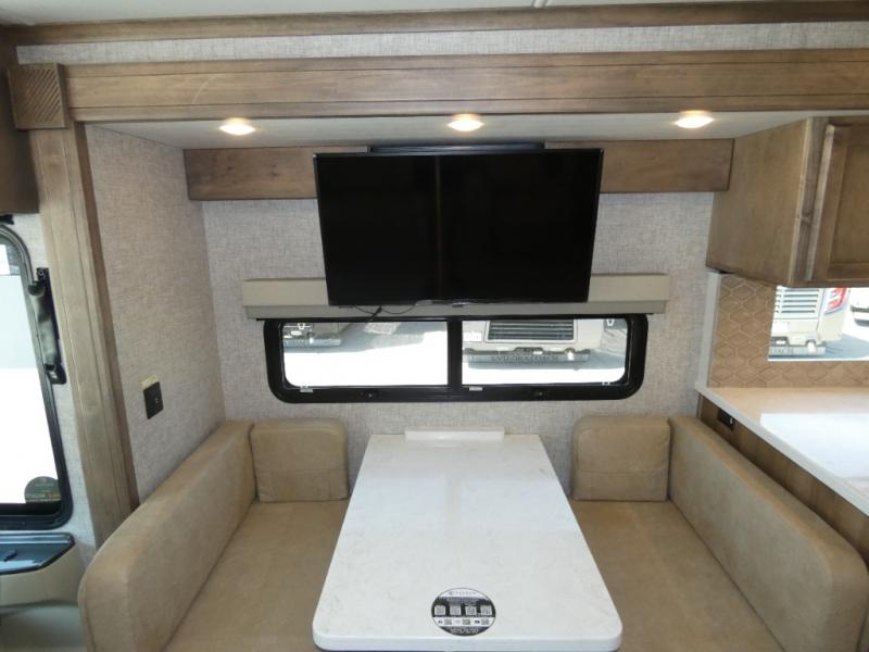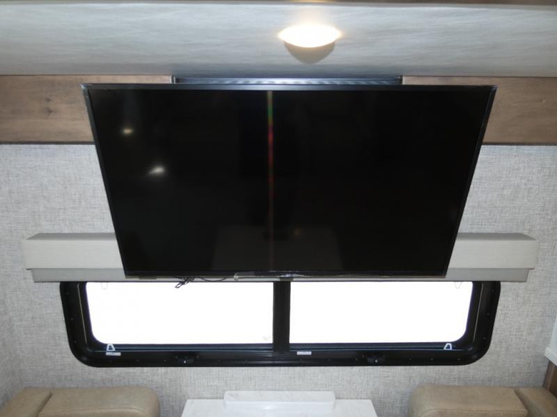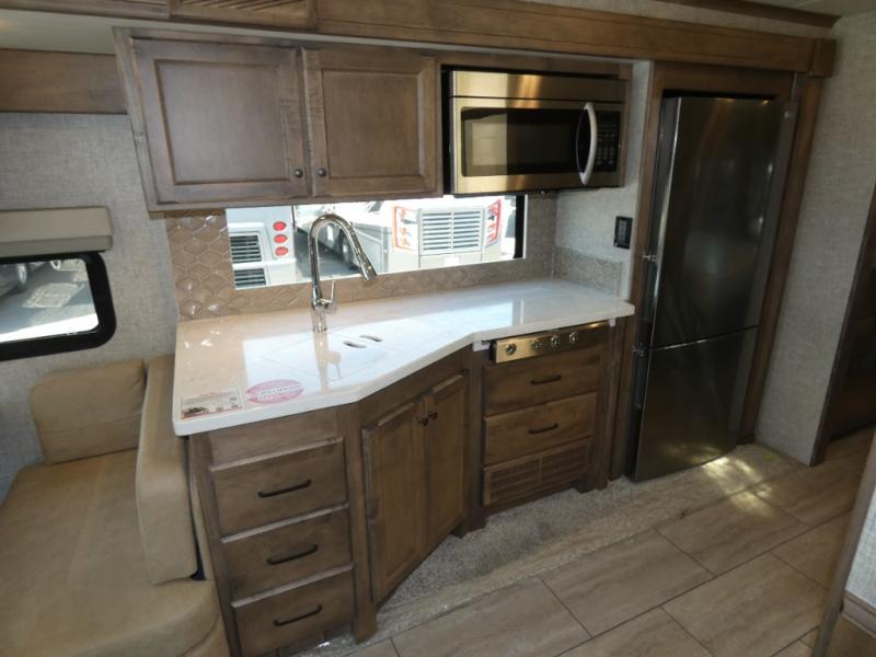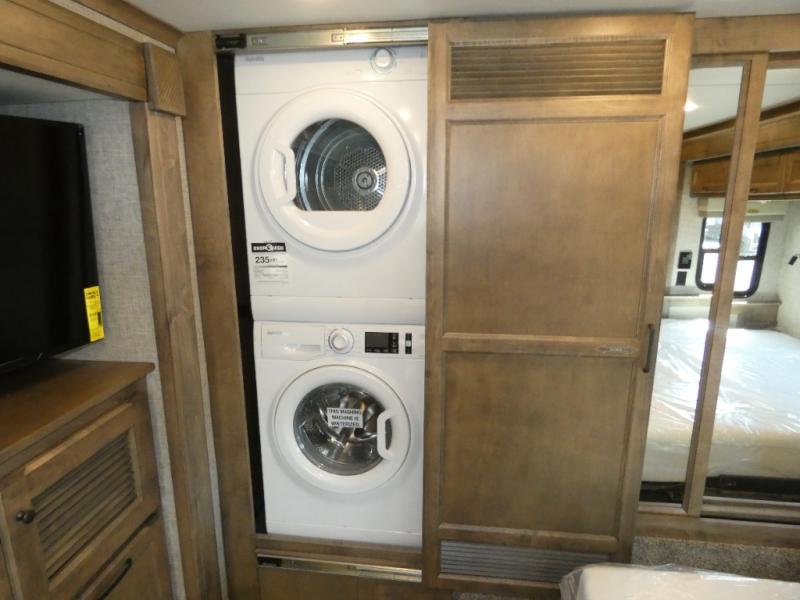 If you've been in the market for a coach with added interior space and at-home comforts, look no further than this Byway! The super sofa and booth dinette sleeper will provide cozy seating space plus additional sleeping spaces for your guests. The kitchen includes everything you need to prepare meals each day, including a 1.5 cu. ft. Smart convection microwave, task lighting, and a 18 cu. ft. residential refrigerator with a bottom freezer. The mid coach full bath lets you stay clean throughout each trip, and the rear private bedroom will be your own oasis at night. Here, you'll find a king bed slide out with nightstands on either side, a mounted TV, a spacious wardrobe, plus stacked washer/dryer prep if you want the option for easy wash days!