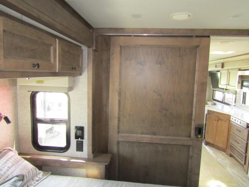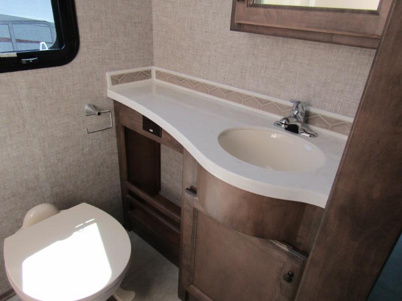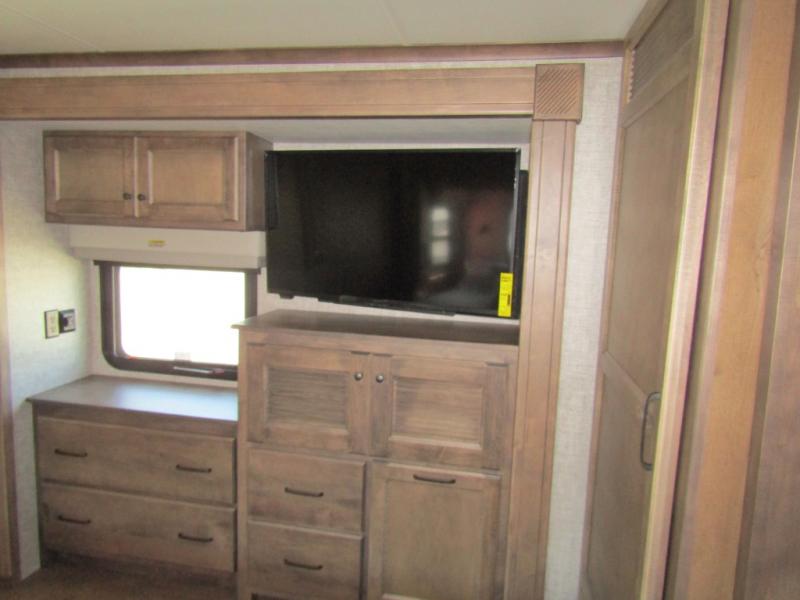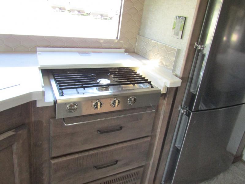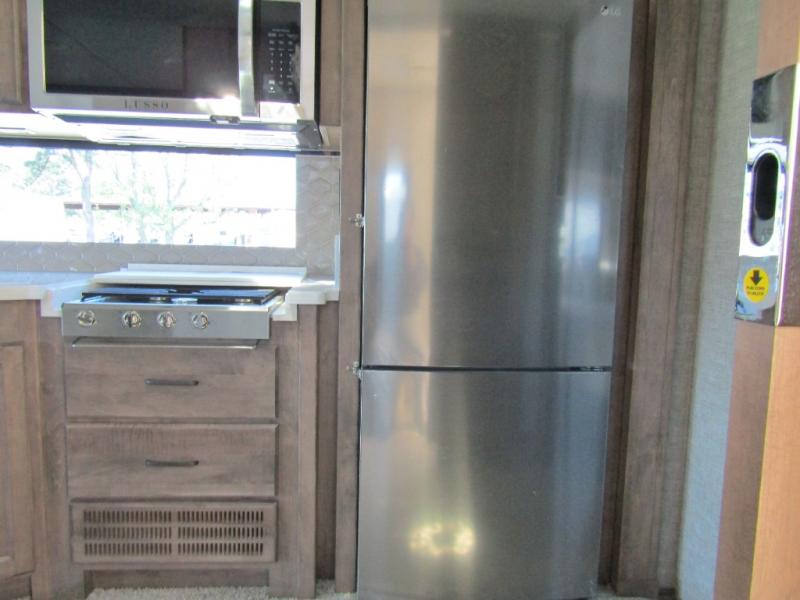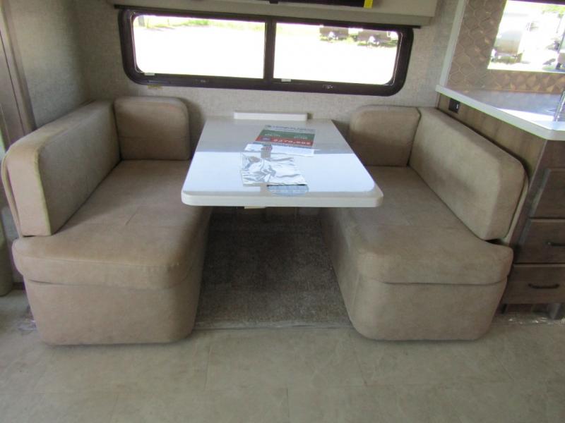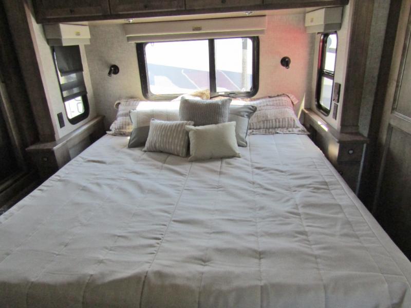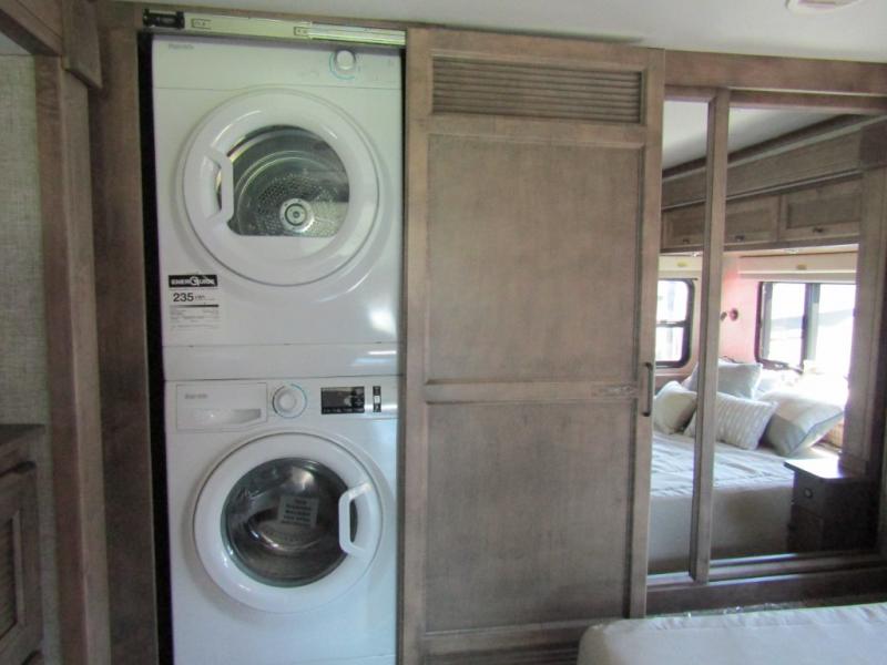 Spacious Living: Sleeper sofa on the driver’s side, memory foam king bed, stacked washer/dryer, and Ultra Leather Booth Dinette PS provide comfort for extended stays.