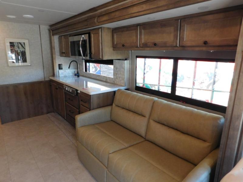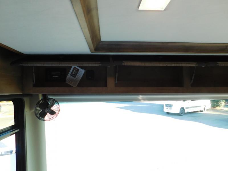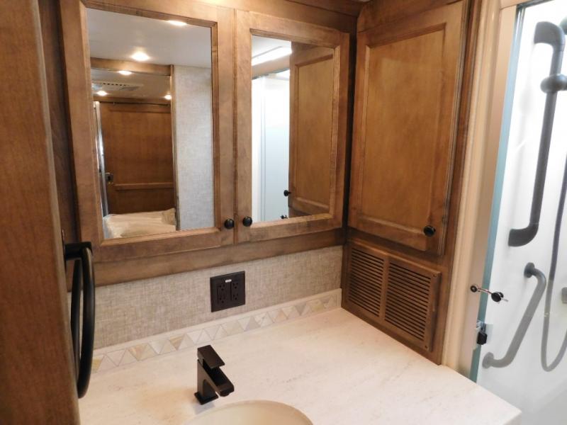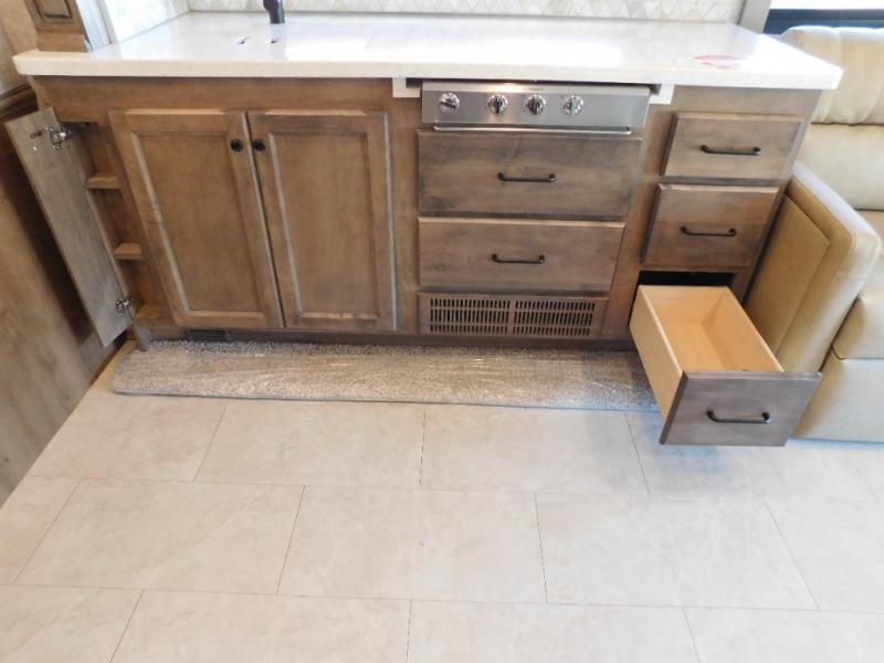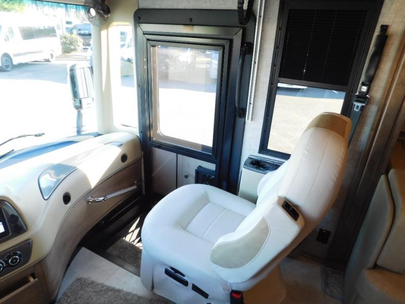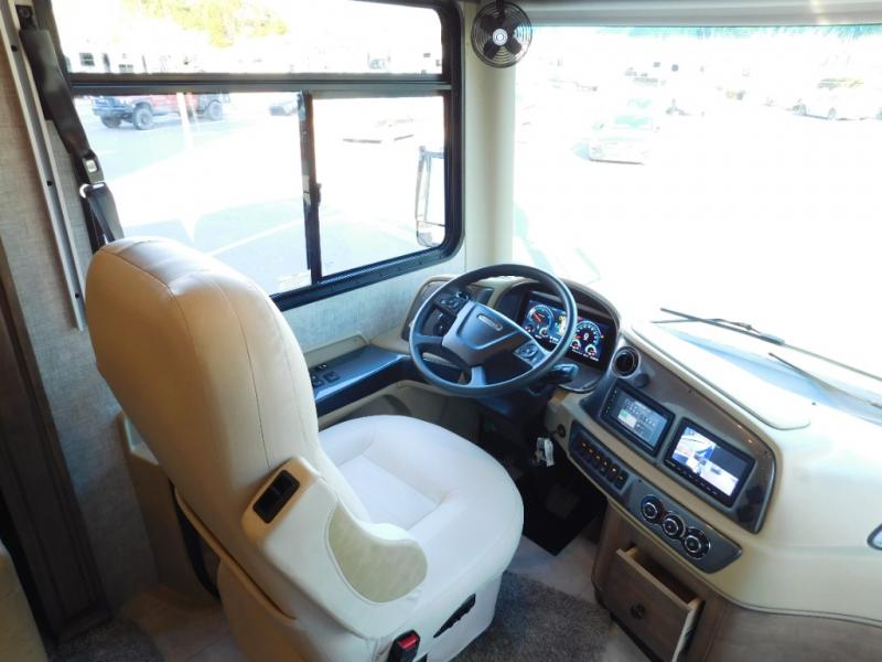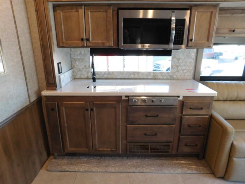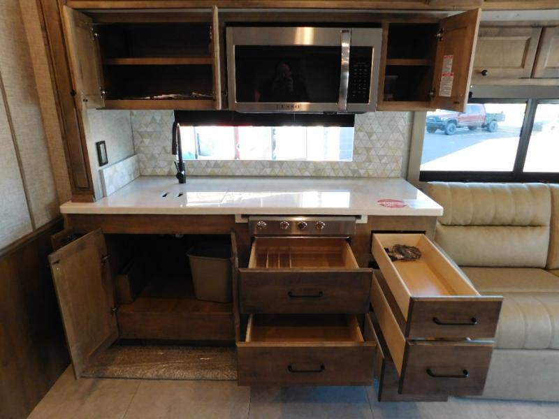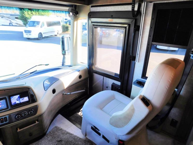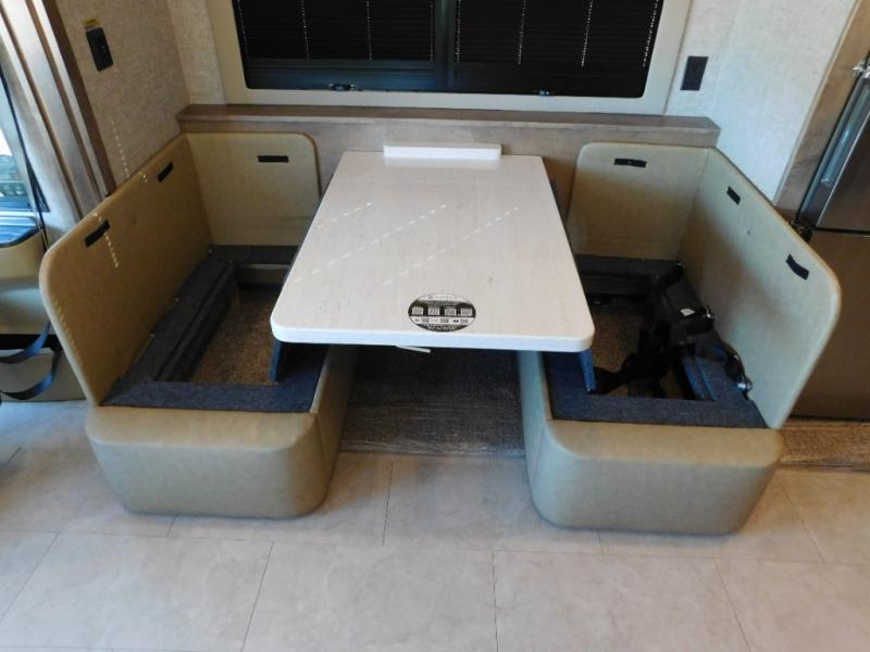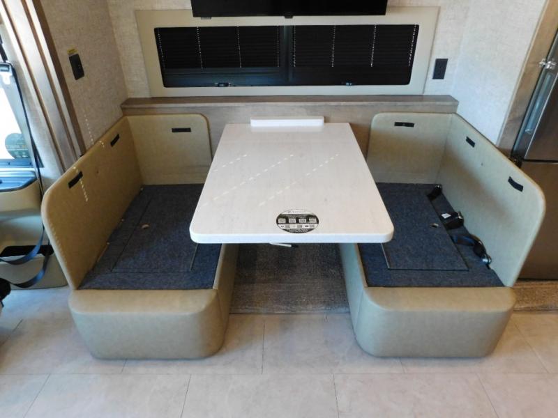 Step inside and discover luxurious handcrafted cabinetry, solid surface countertops, and a full tile backsplash in the kitchen. You’ll feel like you're at a five-star resort while traveling! The Ultrafabrics Montage captain’s seats provide comfort and support for long drives, while the 7” high-def LED monitor and in-dash navigation system make every trip a breeze for the driver.