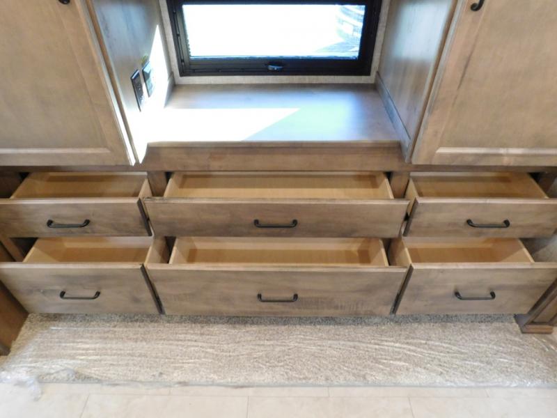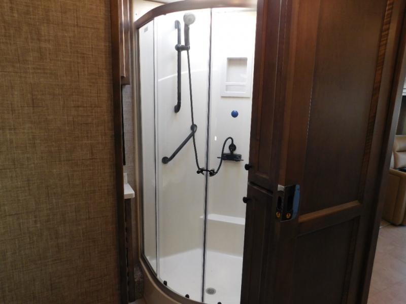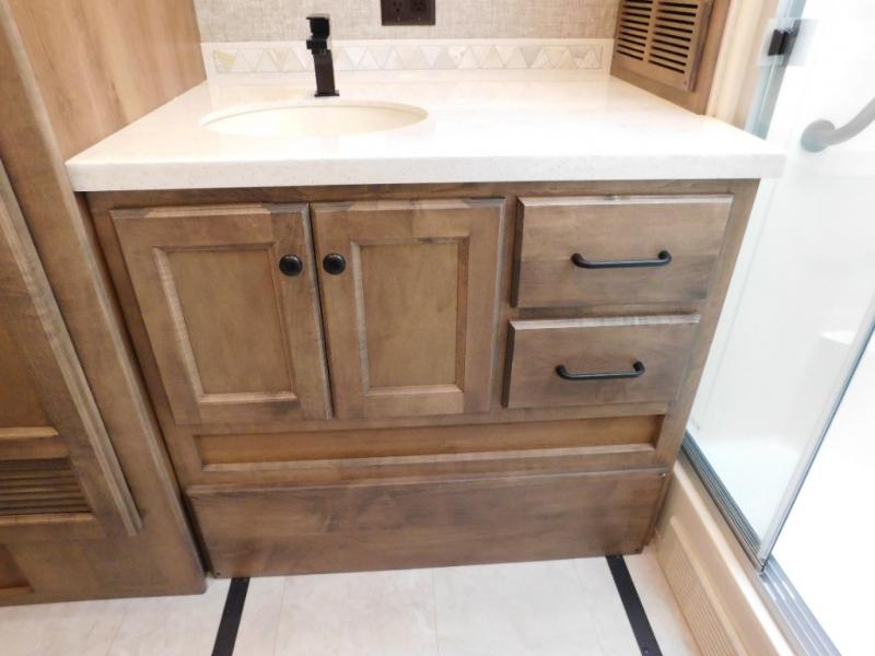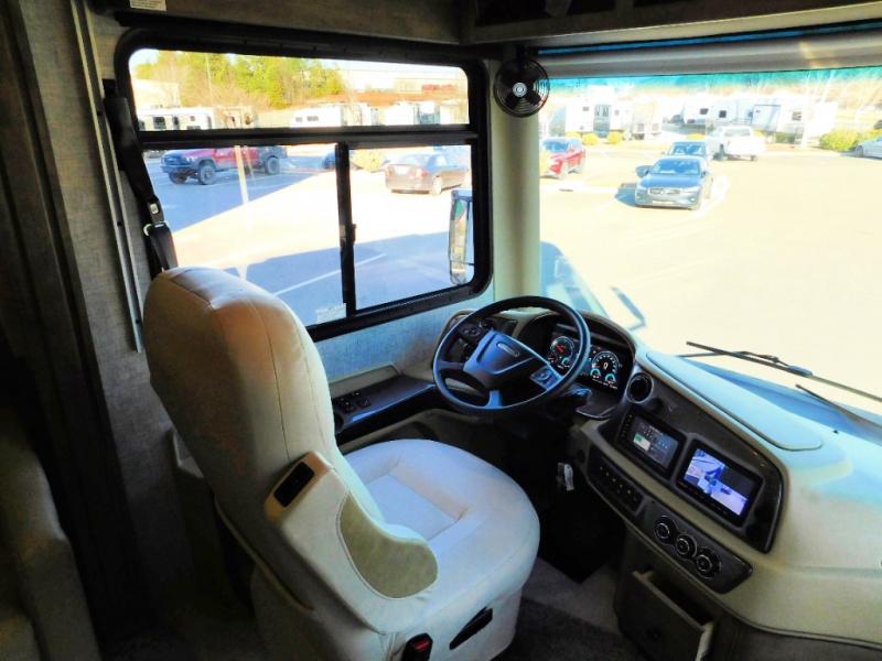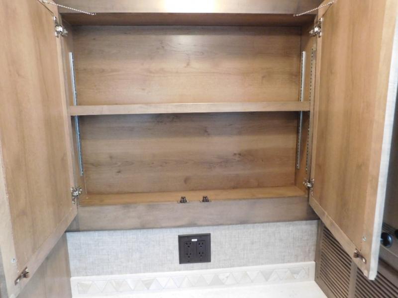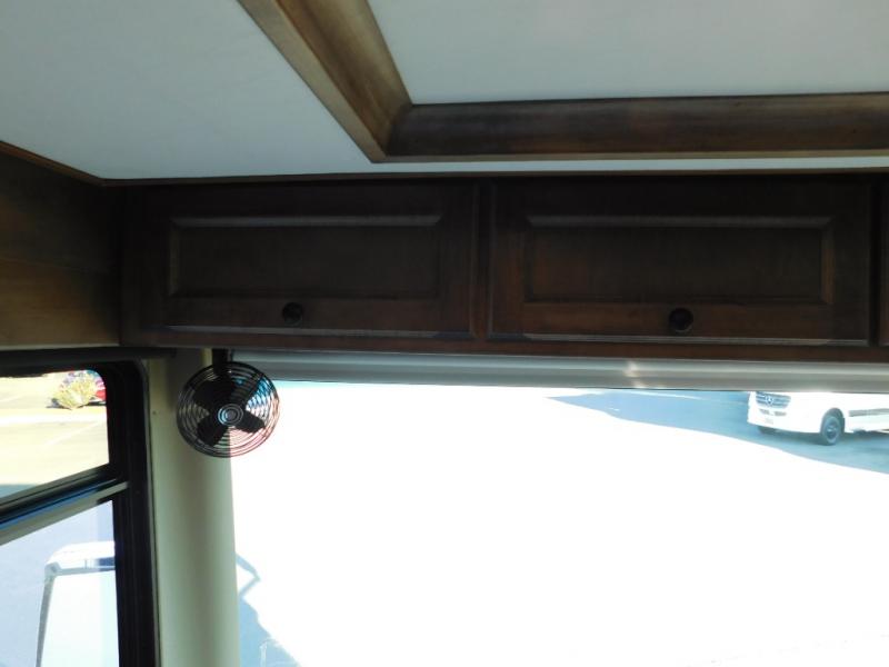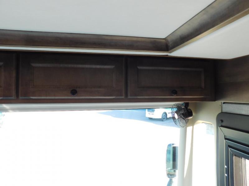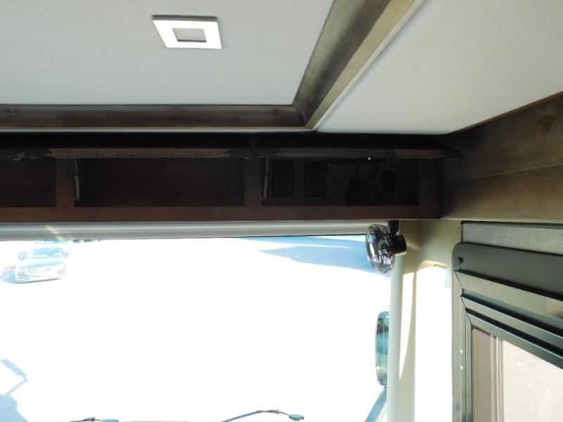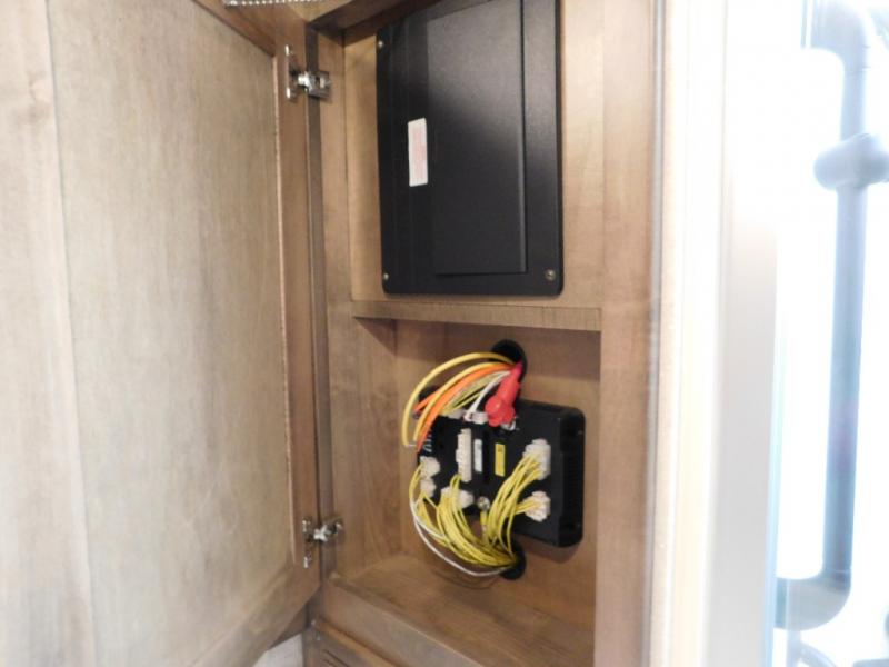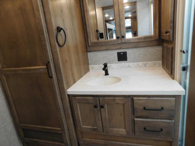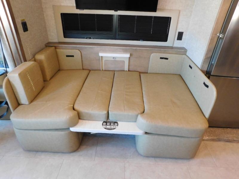 Step inside and discover luxurious handcrafted cabinetry, solid surface countertops, and a full tile backsplash in the kitchen. You’ll feel like you're at a five-star resort while traveling! The Ultrafabrics Montage captain’s seats provide comfort and support for long drives, while the 7” high-def LED monitor and in-dash navigation system make every trip a breeze for the driver.