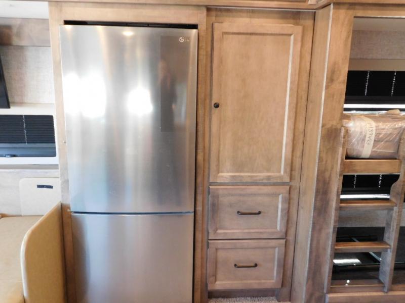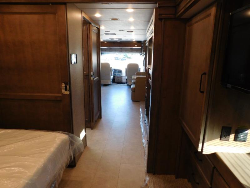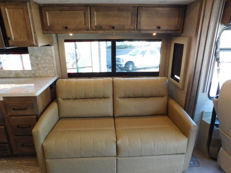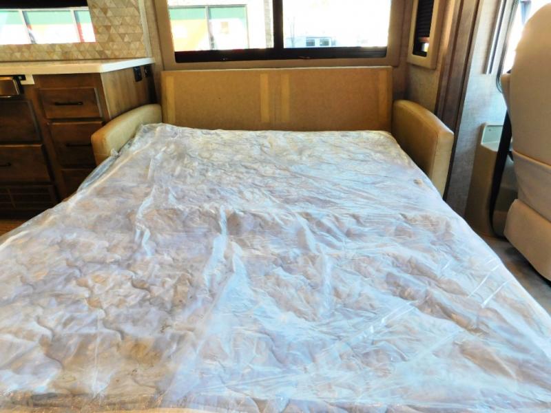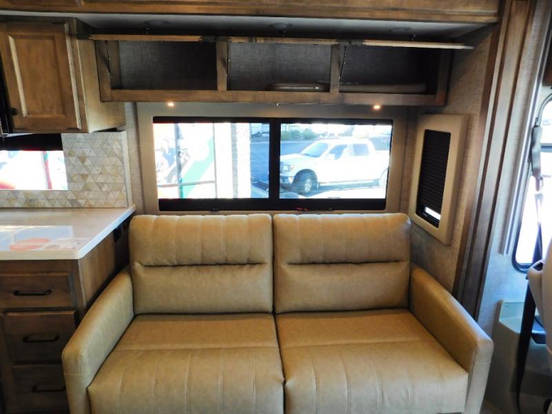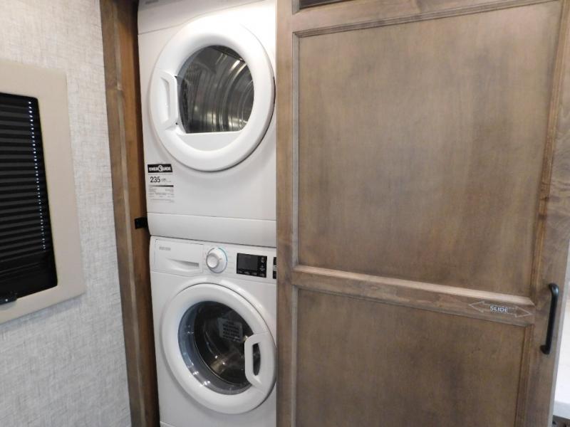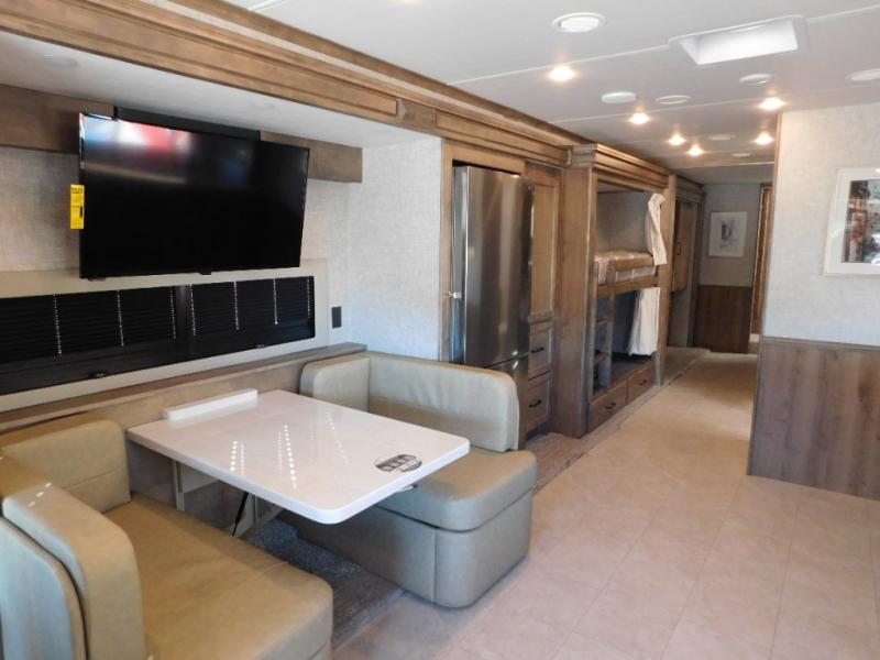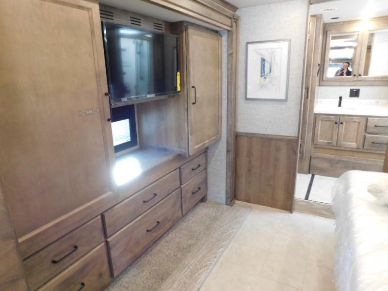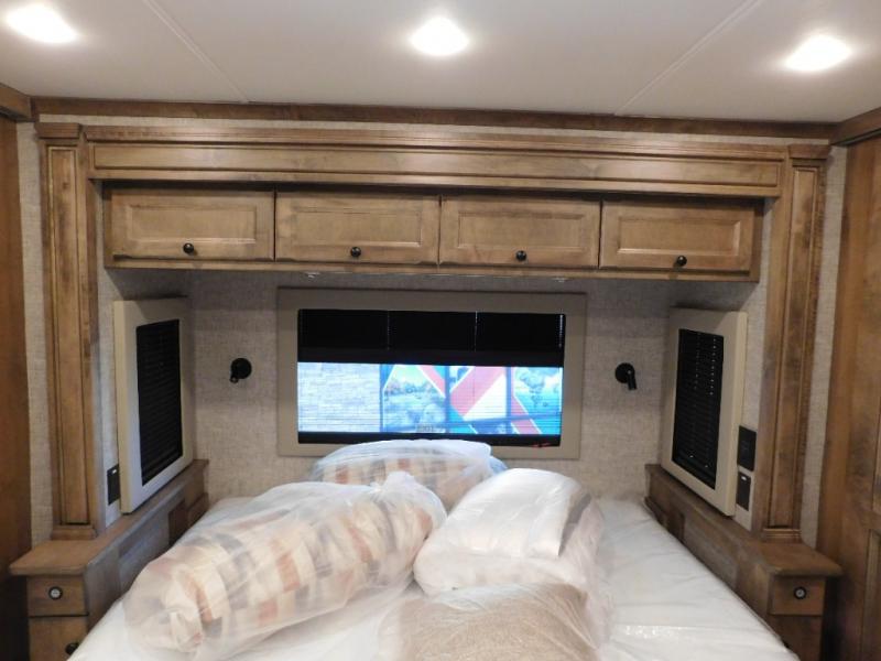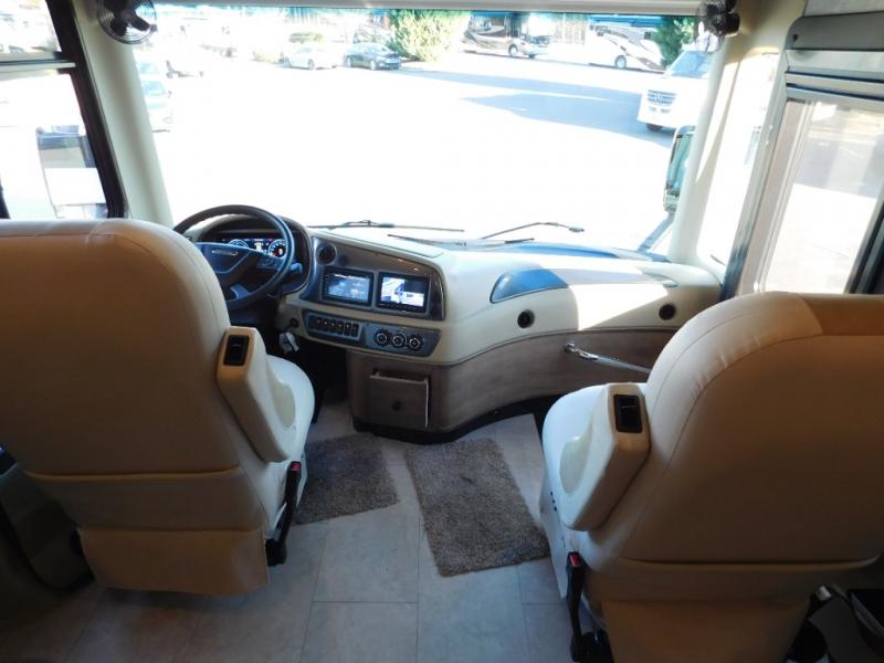 Step inside and discover luxurious handcrafted cabinetry, solid surface countertops, and a full tile backsplash in the kitchen. You’ll feel like you're at a five-star resort while traveling! The Ultrafabrics Montage captain’s seats provide comfort and support for long drives, while the 7” high-def LED monitor and in-dash navigation system make every trip a breeze for the driver.
