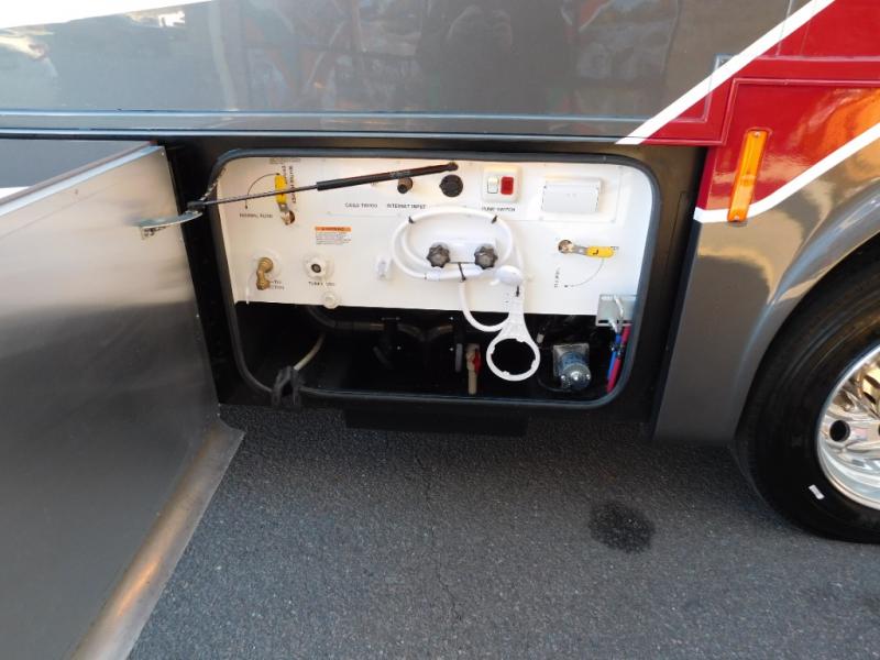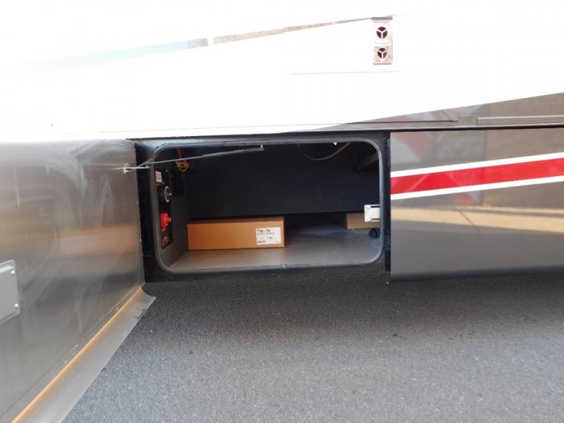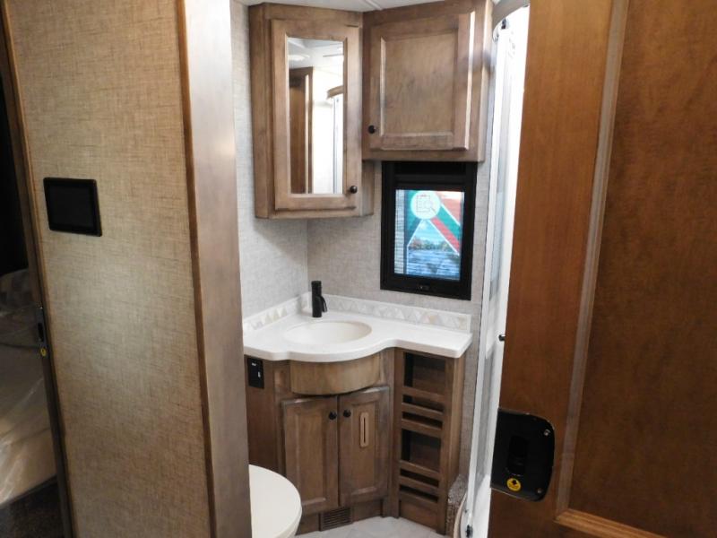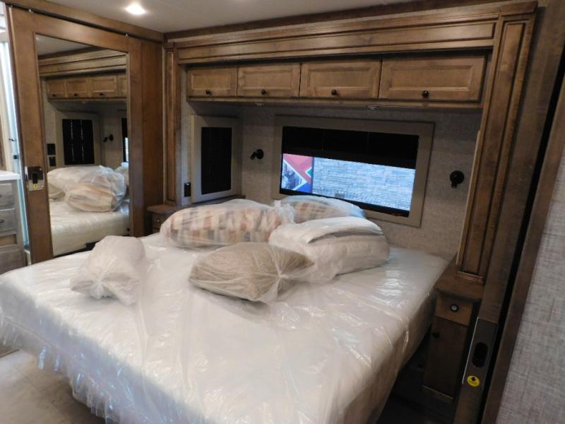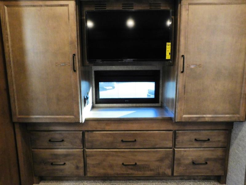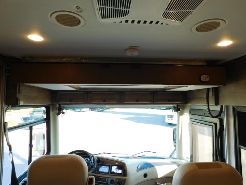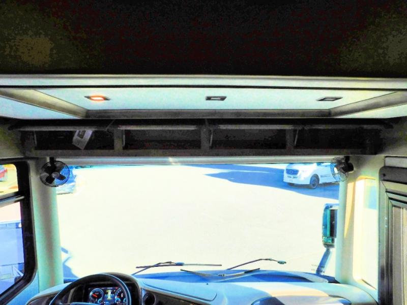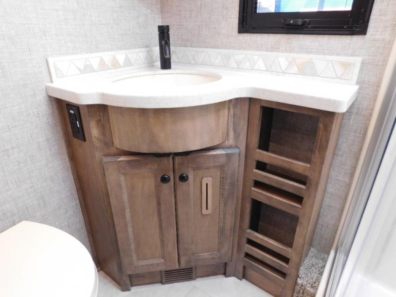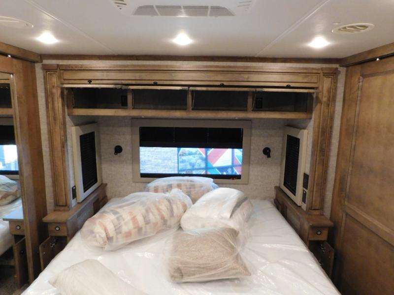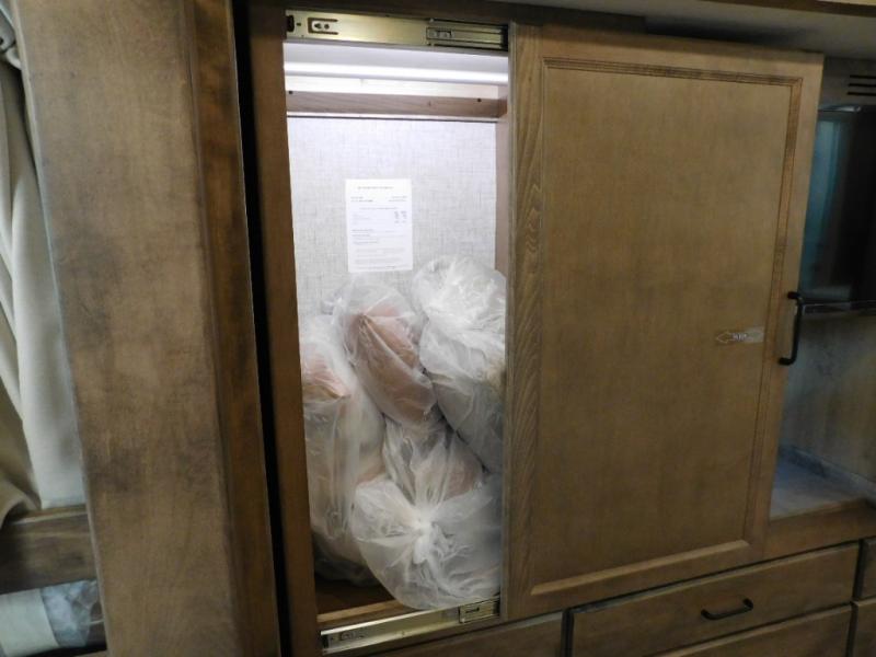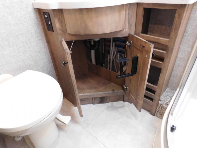 Step inside and discover luxurious handcrafted cabinetry, solid surface countertops, and a full tile backsplash in the kitchen. You’ll feel like you're at a five-star resort while traveling! The Ultrafabrics Montage captain’s seats provide comfort and support for long drives, while the 7” high-def LED monitor and in-dash navigation system make every trip a breeze for the driver.