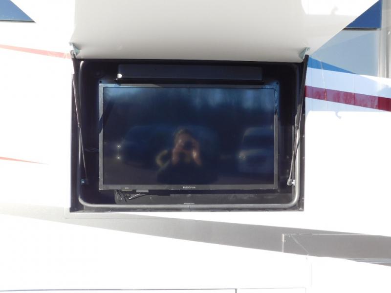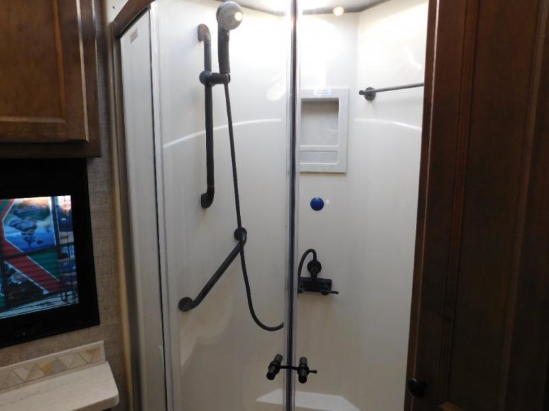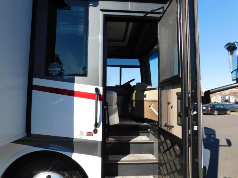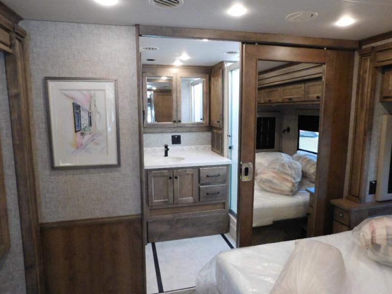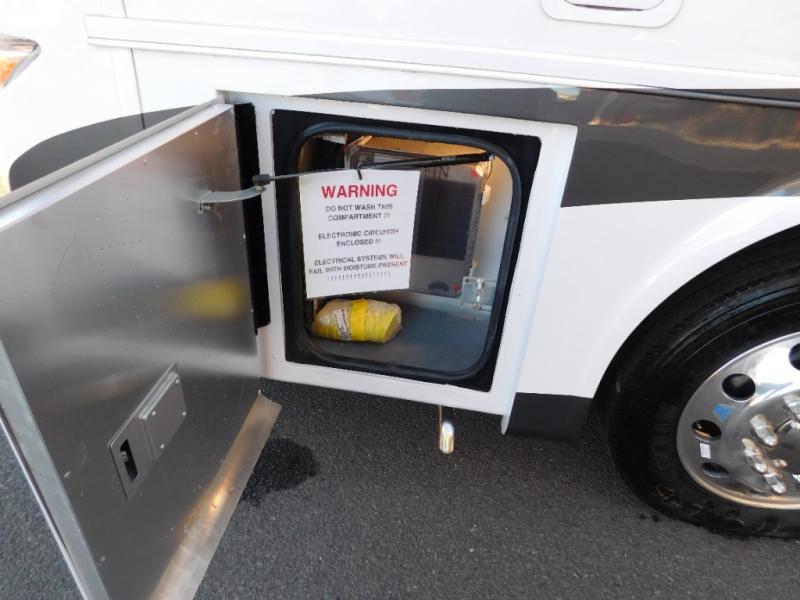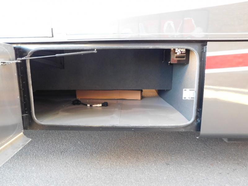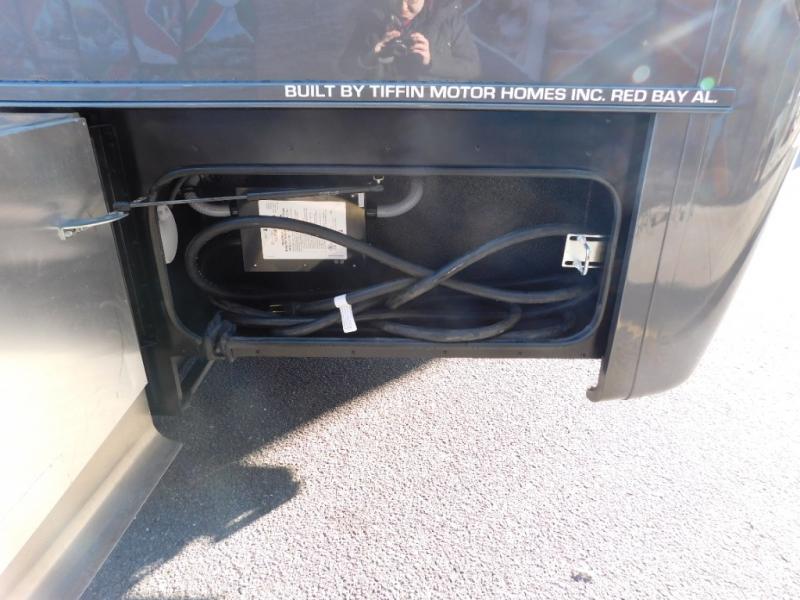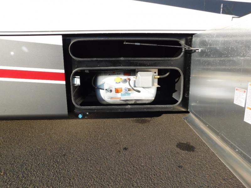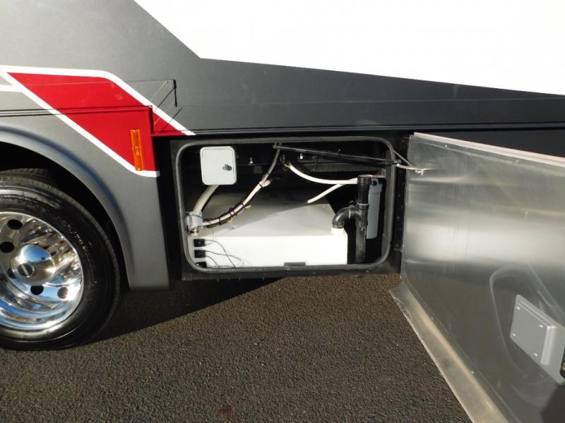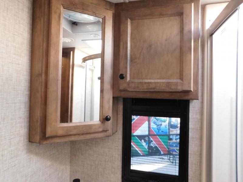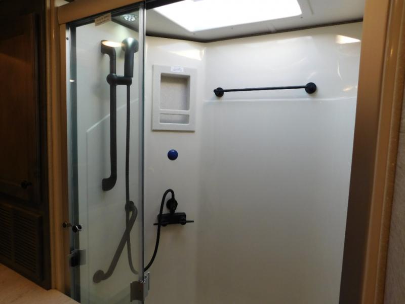 Step inside and discover luxurious handcrafted cabinetry, solid surface countertops, and a full tile backsplash in the kitchen. You’ll feel like you're at a five-star resort while traveling! The Ultrafabrics Montage captain’s seats provide comfort and support for long drives, while the 7” high-def LED monitor and in-dash navigation system make every trip a breeze for the driver.