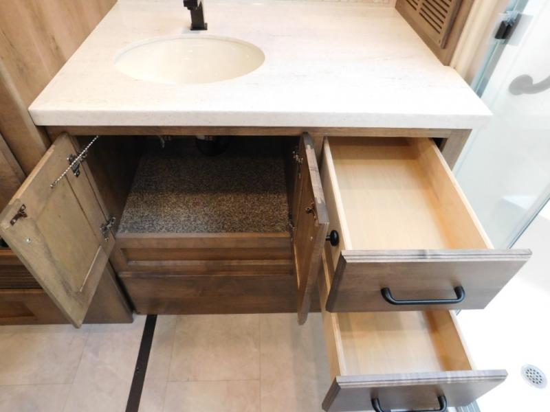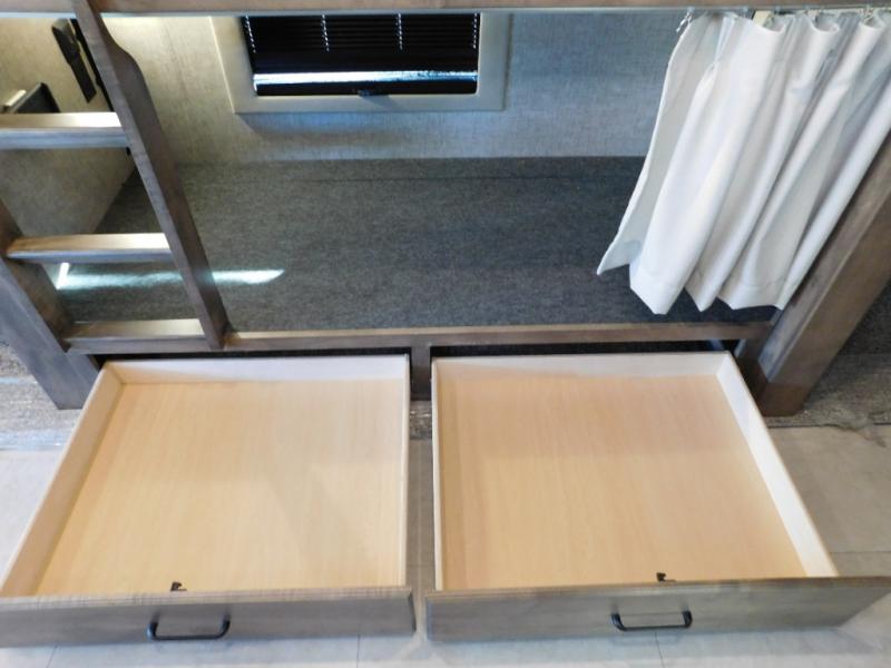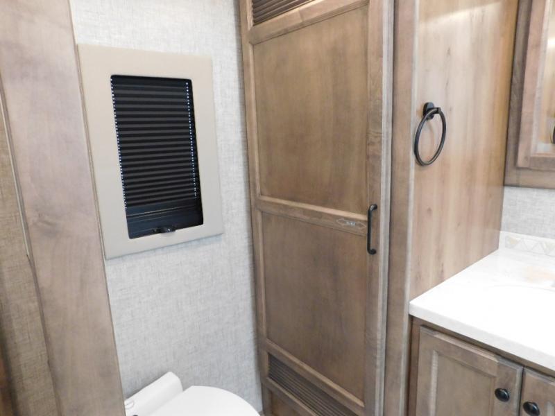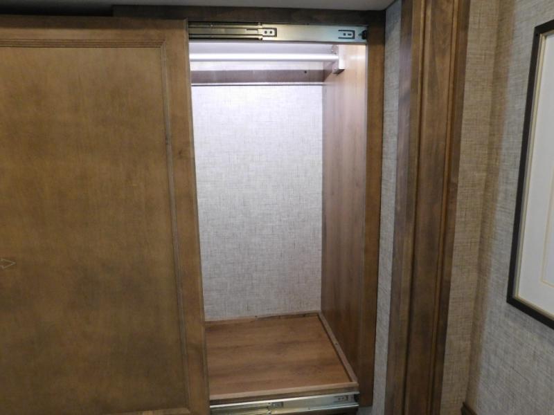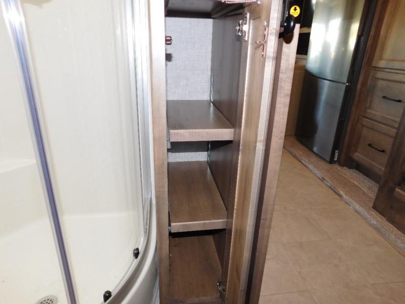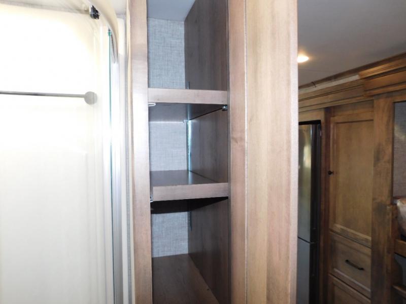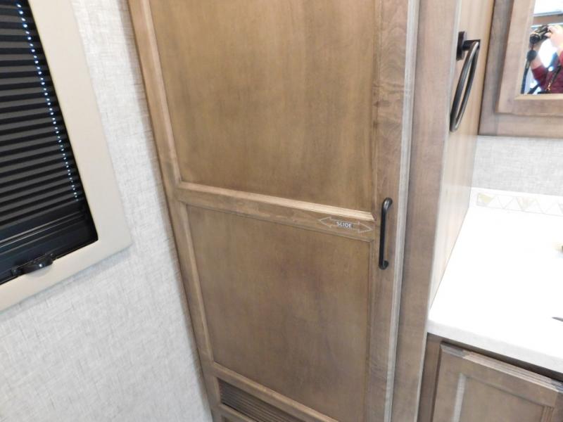The master bedroom is a peaceful retreat with a king bed slide-out, dual bedroom wardrobes, and nightstands for all your personal items. The layout also provides quick access to the rear bath, so you’ll enjoy ease and efficiency no matter the time of day.