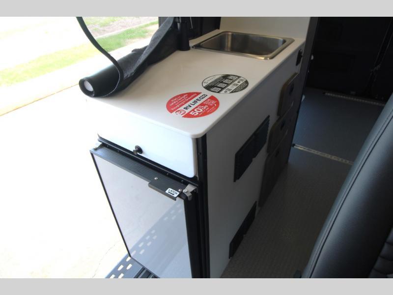 Stay refreshed on your journey with a full wet bath and enjoy the convenience of a well-equipped kitchen, complete with a single-burner portable induction cooktop, refrigerator, integrated sink, and a removable counter extension for extra prep space.
