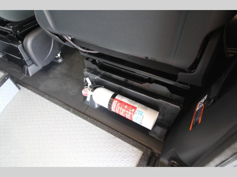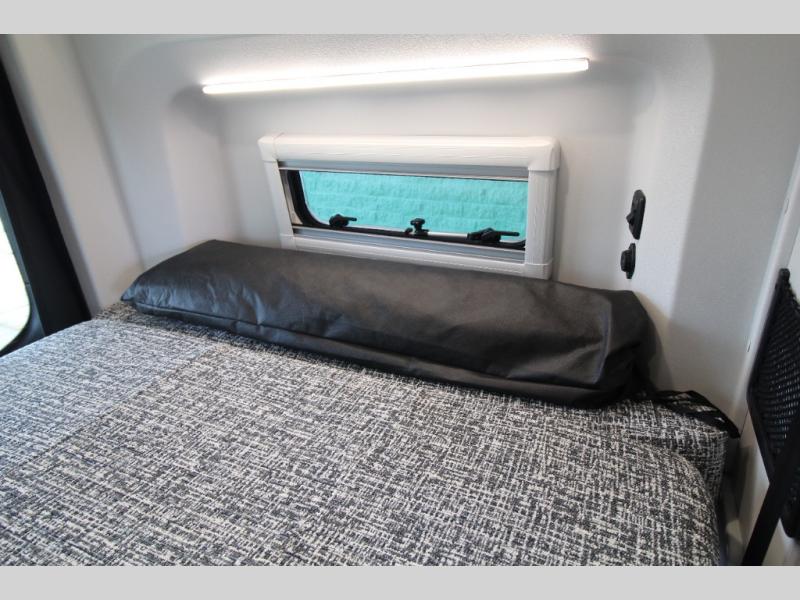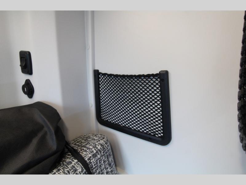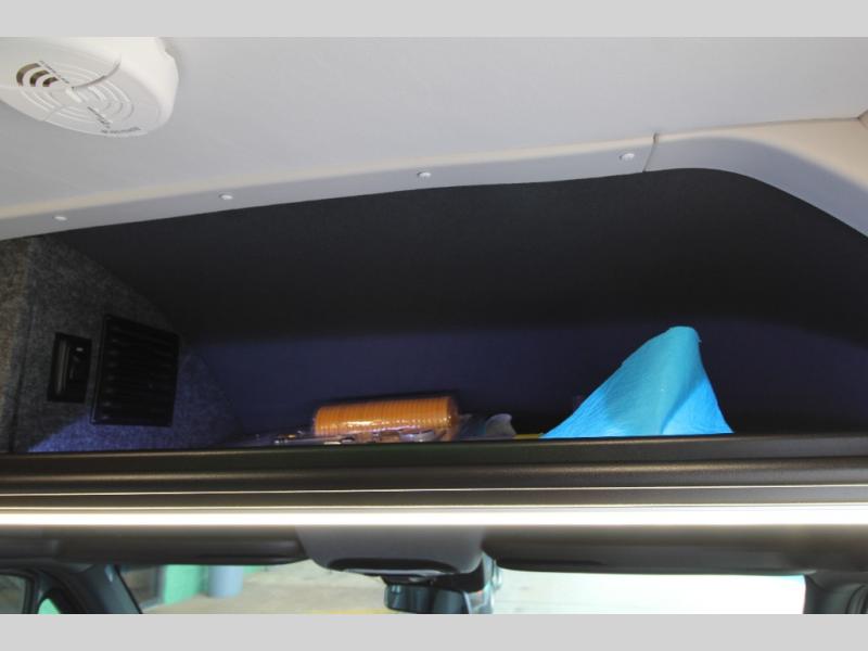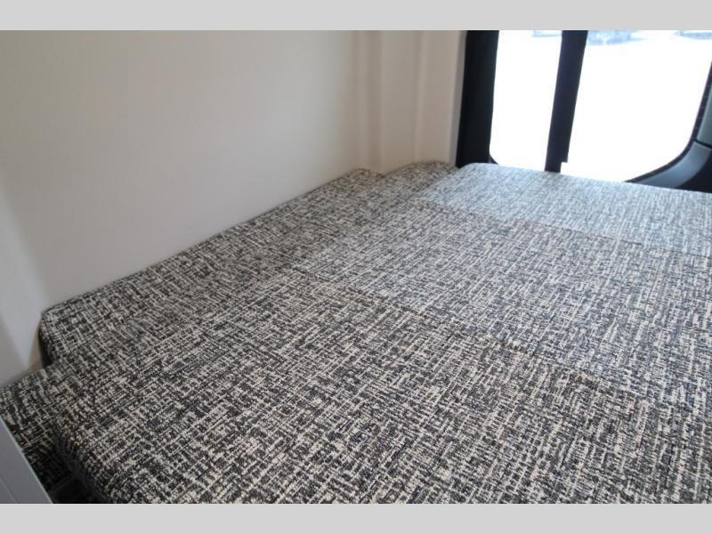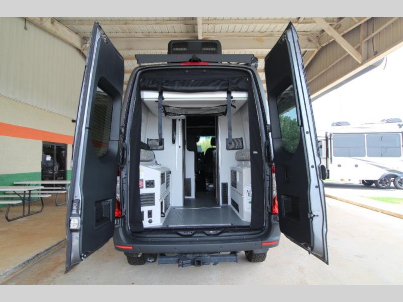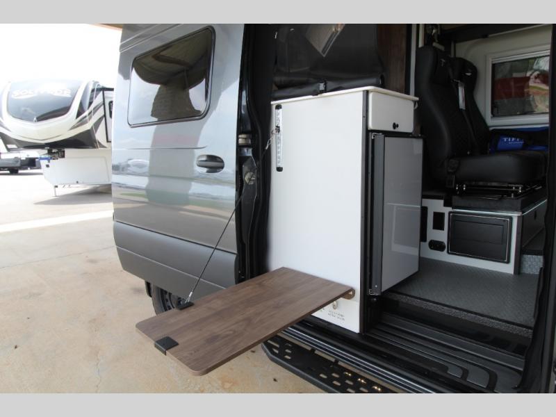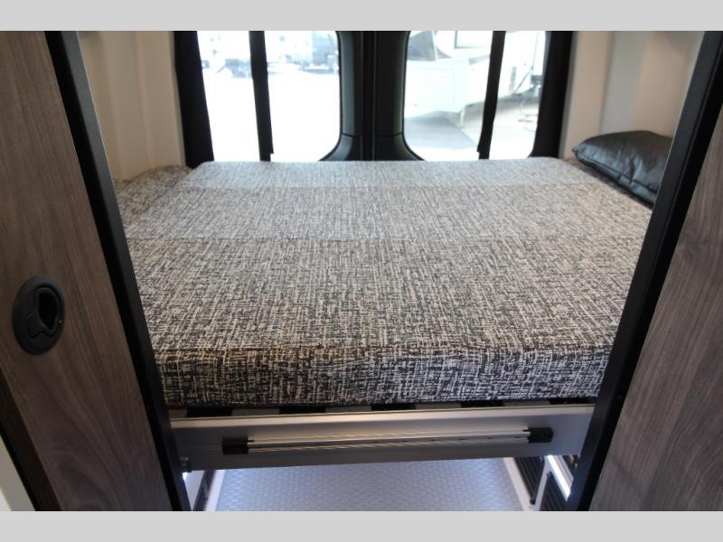 Relax and dine inside using the removable wall-mounted swivel table and jump seat located behind the driver's seat, or opt for the available adventure bar work and storage solution. Both front seats swivel to create a spacious, versatile living area perfect for hosting guests or unwinding after a day outdoors. At night, the power lift bed offers a restful sleep, preparing you for the next day's adventures.