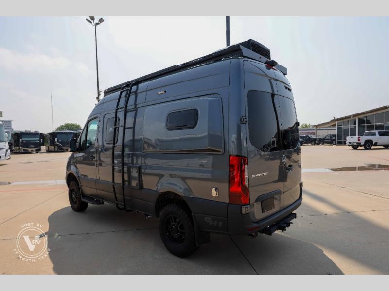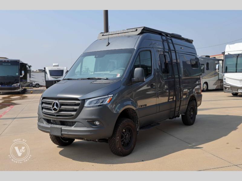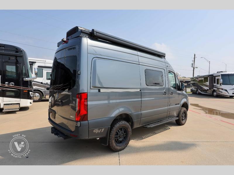 Pick a place, any place, and start packing. This off-road capable diesel van features a 49" x 79" gear garage beneath the power lift bed where you can store camp chairs, paddle boards for the lake, outdoor games and plenty of hiking gear. The on-board wet bath will keep you fresh and clean, and you can easily whip up meals and snacks in the kitchen with a single-burner induction cooktop and refrigerator beneath the counter for your perishables. There is also a sink for cleaning up and a removable counter extension. A jump seat and removable wall mounted swivel table behind the driver's seat can accommodate you for meals or a game of cards, or you can choose the optional adventure bar work/storage solution in place of the jump seat. Both front driver and passenger seats swivel to the back so you'll have plenty of seating even with company. At night, the power lift bed will allow you to get a great night's rest so you can enjoy it all again the next day!