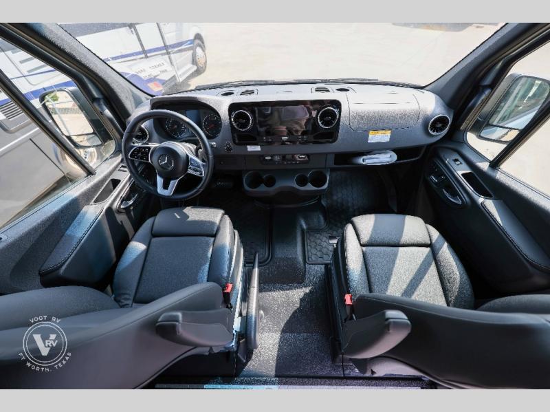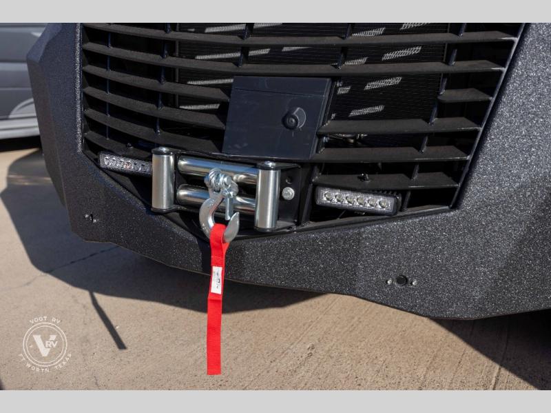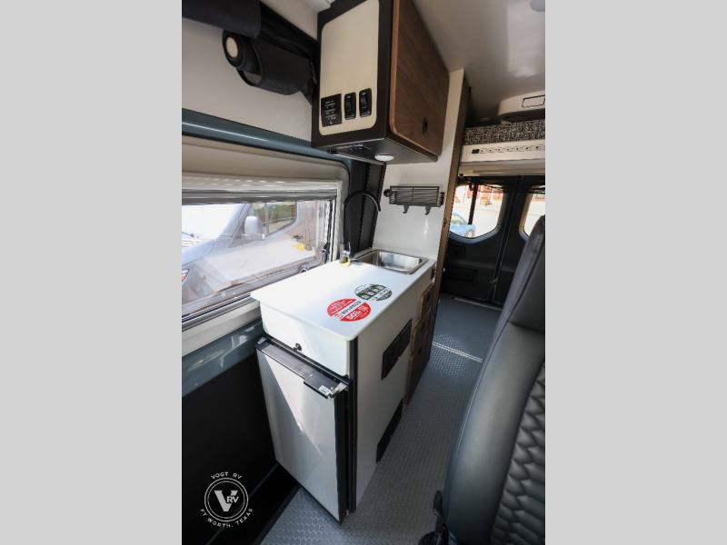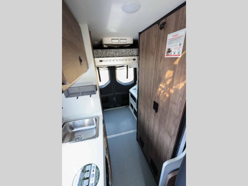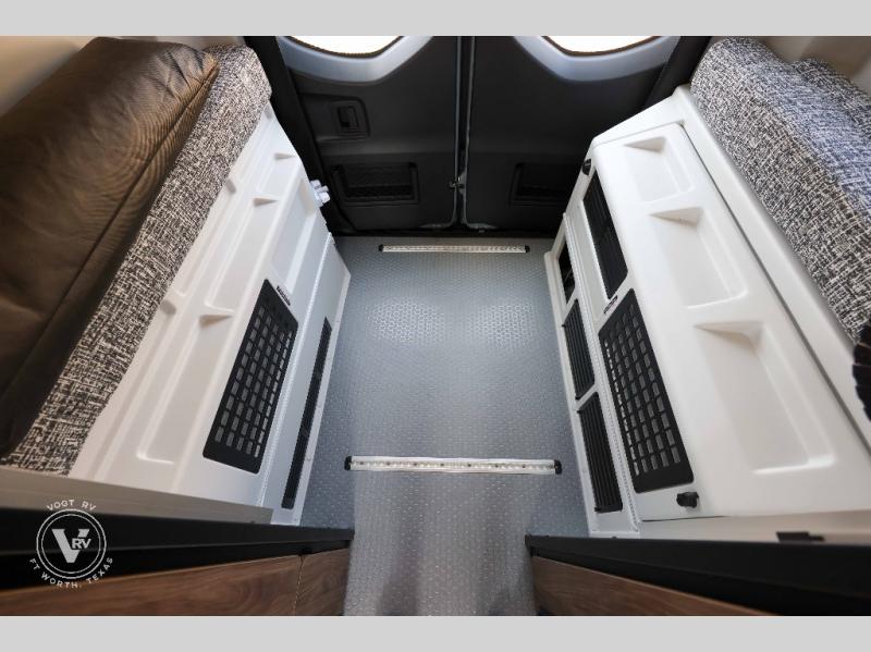 Pick a place, any place, and start packing. This off-road capable diesel van features a 49" x 79" gear garage beneath the power lift bed where you can store camp chairs, paddle boards for the lake, outdoor games and plenty of hiking gear. The on-board wet bath will keep you fresh and clean, and you can easily whip up meals and snacks in the kitchen with a single-burner induction cooktop and refrigerator beneath the counter for your perishables. There is also a sink for cleaning up and a removable counter extension. A jump seat and removable wall mounted swivel table behind the driver's seat can accommodate you for meals or a game of cards, or you can choose the optional adventure bar work/storage solution in place of the jump seat. Both front driver and passenger seats swivel to the back so you'll have plenty of seating even with company. At night, the power lift bed will allow you to get a great night's rest so you can enjoy it all again the next day!
