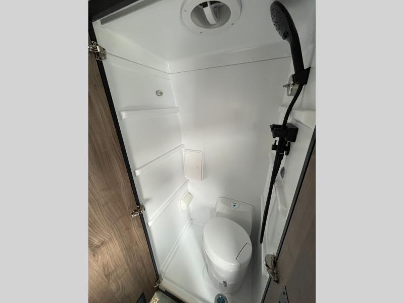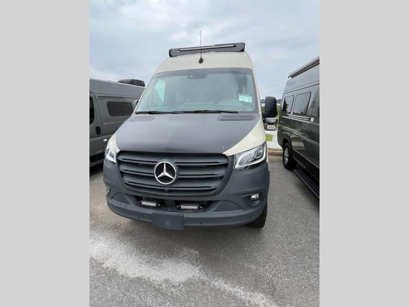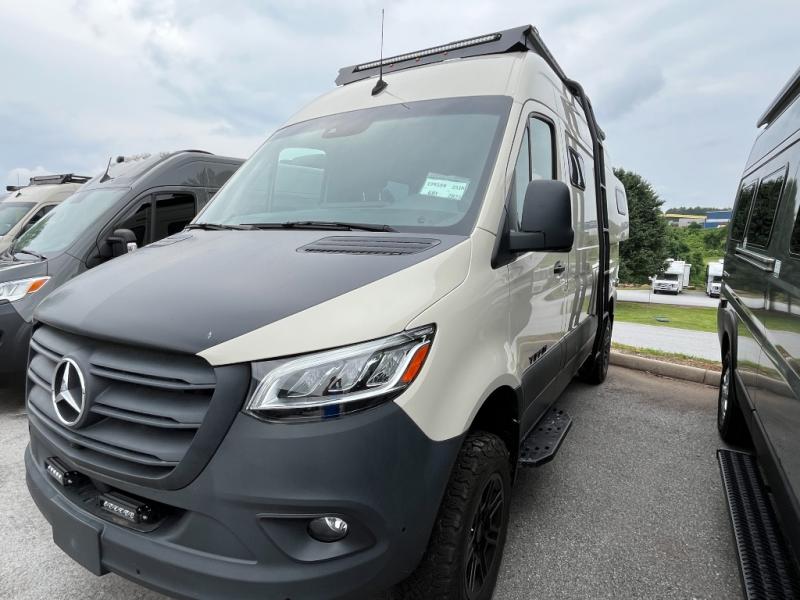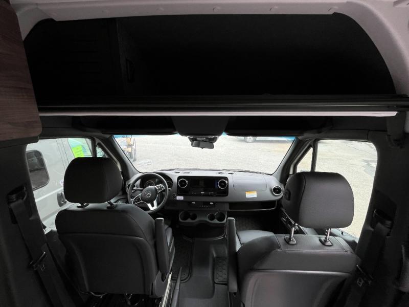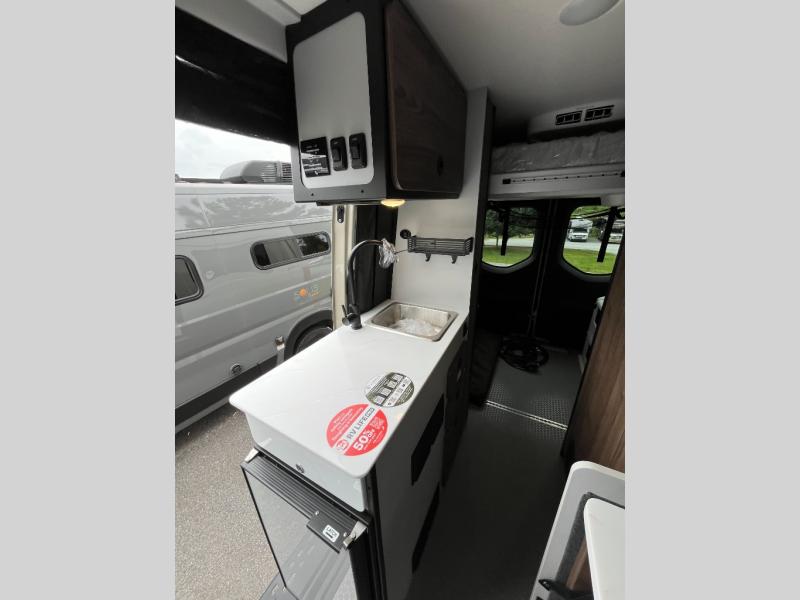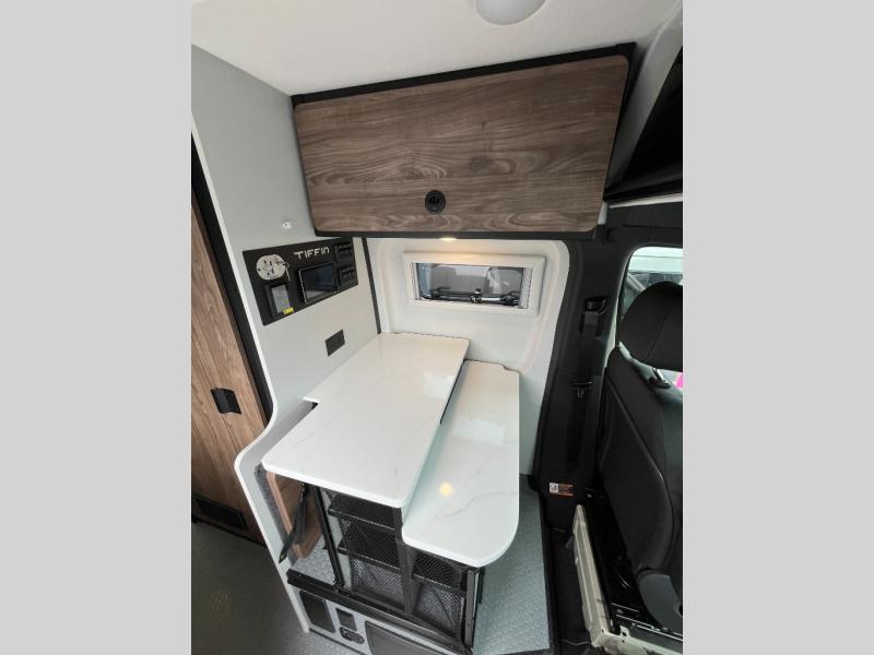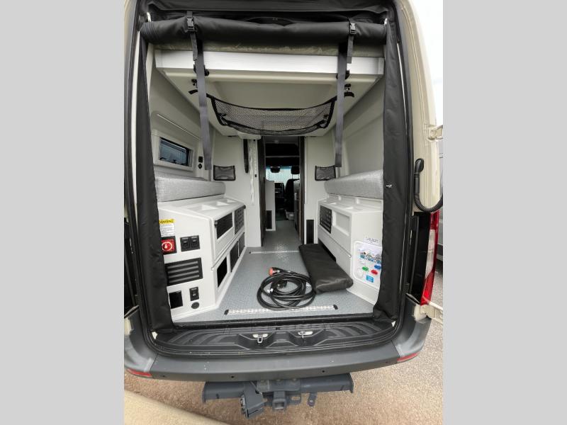 Pick a place, any place, and start packing. This off-road capable diesel van features a 49" x 79" gear garage beneath the power lift bed where you can store camp chairs, paddle boards for the lake, outdoor games and plenty of hiking gear. The on-board wet bath will keep you fresh and clean, and you can easily whip up meals and snacks in the kitchen with a single-burner induction cooktop and refrigerator beneath the counter for your perishables. There is also a sink for cleaning up and a removable counter extension. An optional jump seat and removable wall mounted swivel table behind the driver's seat can accommodate you for meals or a game of cards, or you can choose the optional adventure bar work/storage solution in place of the jump seat. Both front driver and passenger seats swivel to the back so you'll have plenty of seating even with company. At night, the power lift bed will allow you to get a great night's rest so you can enjoy it all again the next day!
