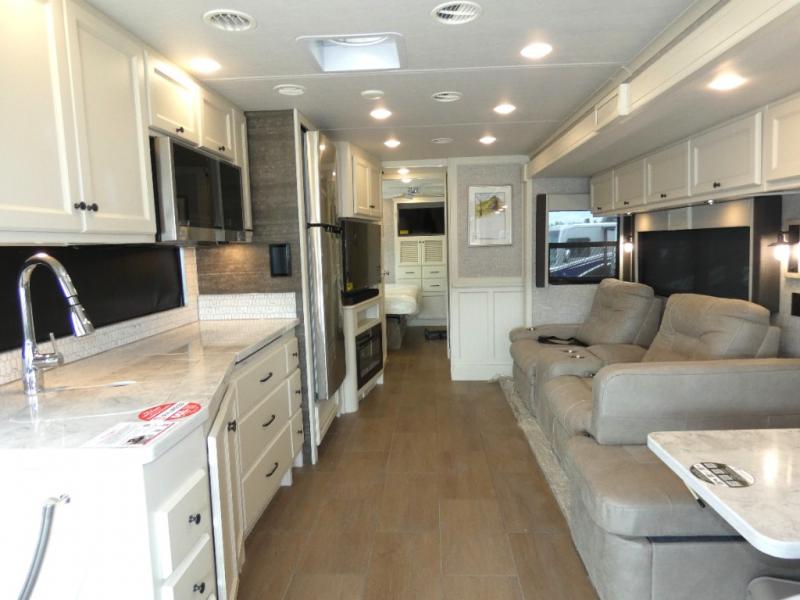 You will feel right at home in this motorhome! It features a rear private bedroom with a king bed slide that has an egress window behind it, a wardrobe with drawers, and a combo washer/dryer. Just outside the bedroom is the split-style bath where one person can freshen up in the shower while another uses the private toilet and sink. After you have prepared a delicious meal with the three burner liquid propane cooktop, you can enjoy it at the booth dinette-sleeper.