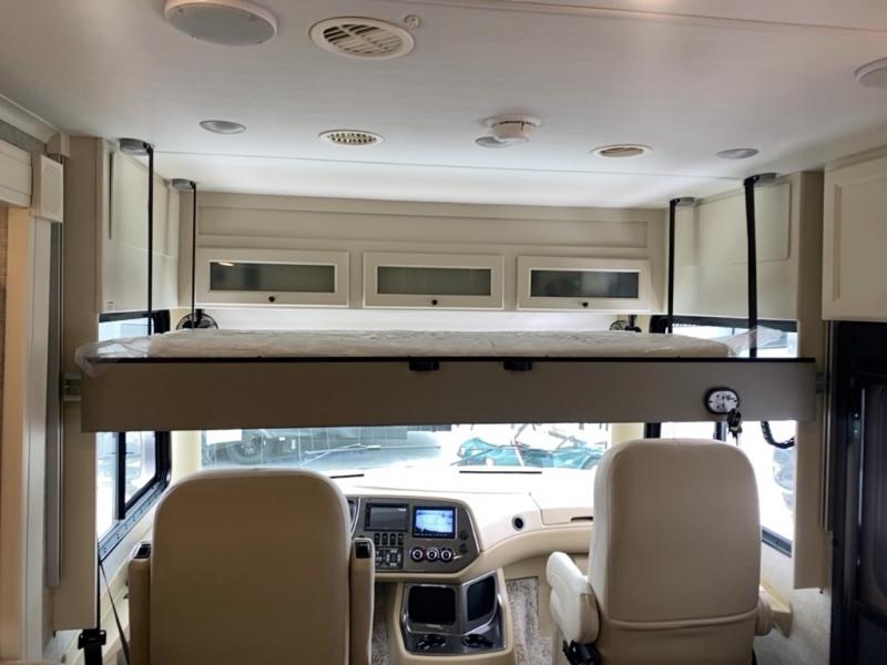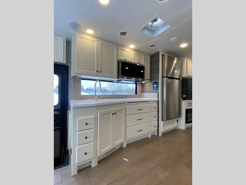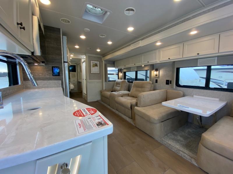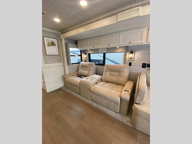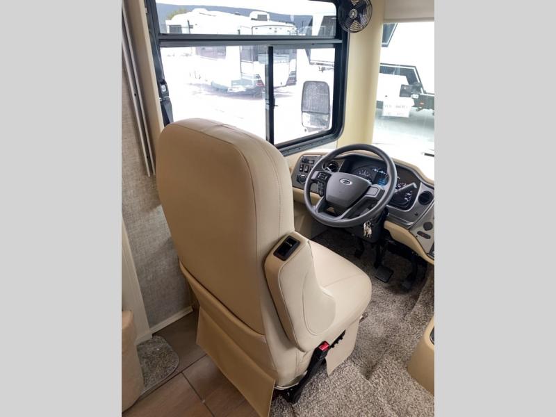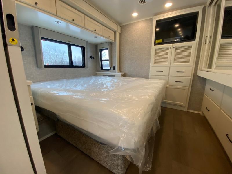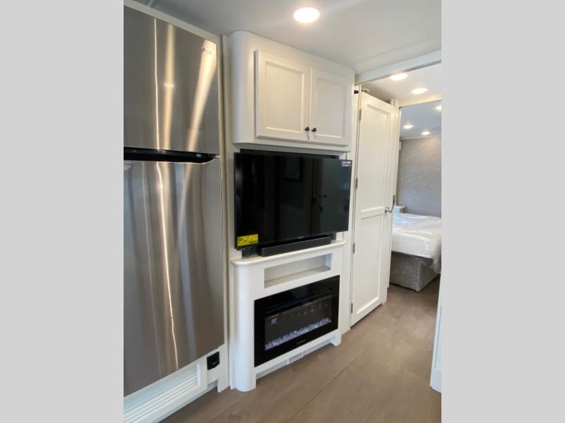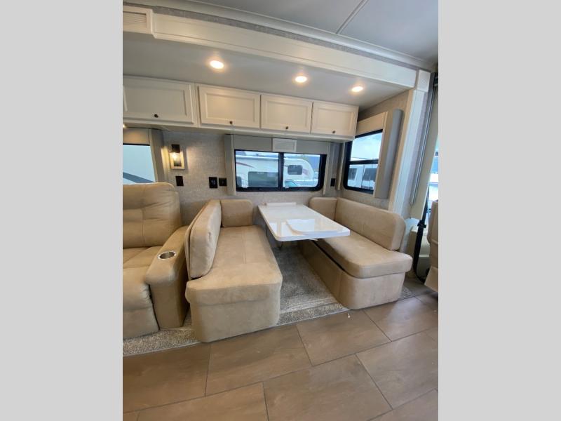 You will feel right at home in this motorhome! It features a rear private bedroom with a king bed slide that has an egress window behind it, a wardrobe with drawers, and an optional combo washer/dryer. Just outside the bedroom is the split-style bath where one person can freshen up in the shower while another uses the private toilet and sink. After you have prepared a delicious meal with the three burner liquid propane cooktop, you can enjoy it at the booth dinette-sleeper. The dinette can become your guests' sleeping space at night, along with the flip and fold sofa bed or the optional drop-down front bunk! You can also choose the optional theater seating if you don't need the additional sleeping space. This model also includes a living area TV with an optional fireplace below, a 20 cu. ft. stainless steel residential refrigerator with a top freezer, and many more interior comforts!
