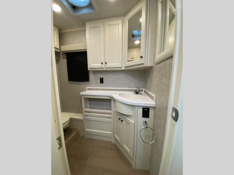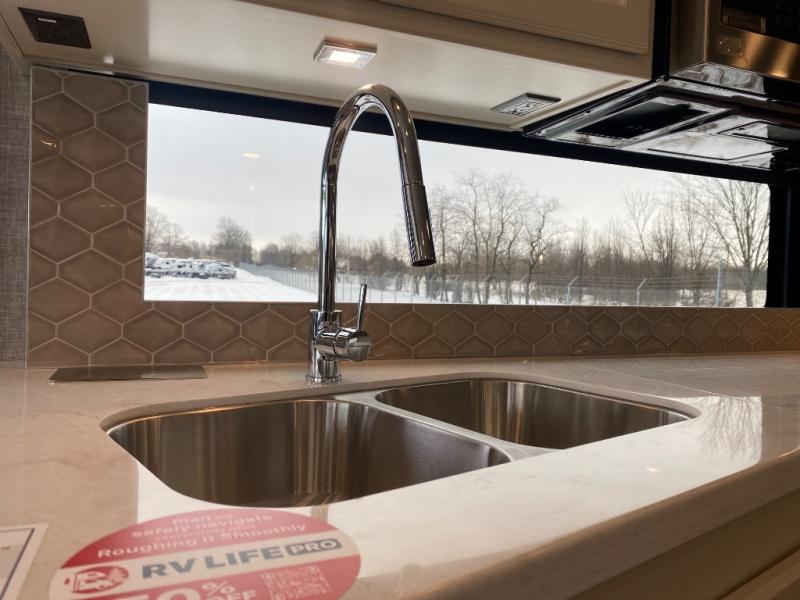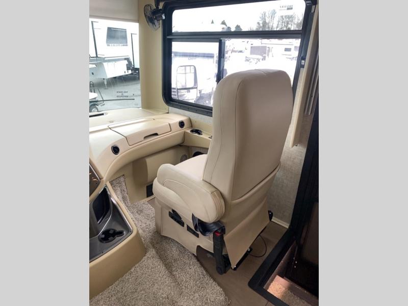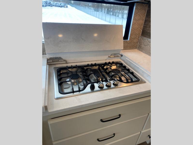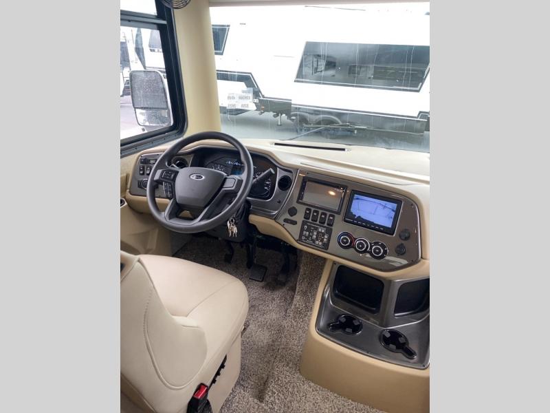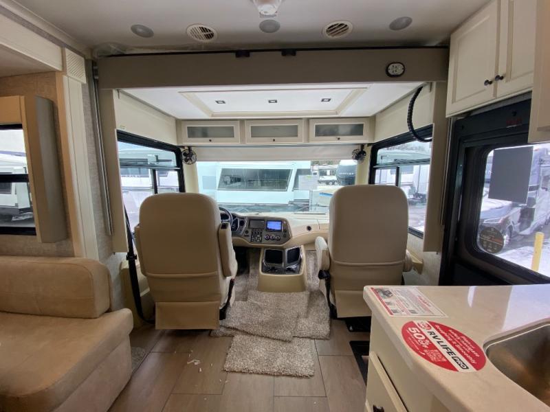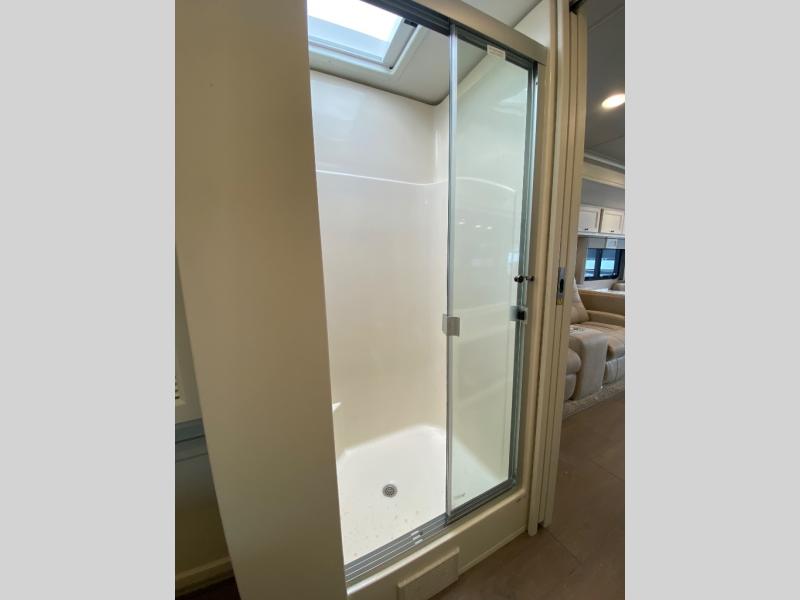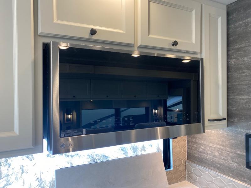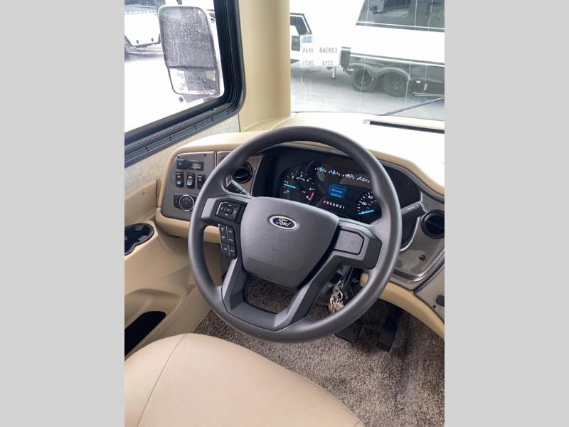 You will feel right at home in this motorhome! It features a rear private bedroom with a king bed slide that has an egress window behind it, a wardrobe with drawers, and an optional combo washer/dryer. Just outside the bedroom is the split-style bath where one person can freshen up in the shower while another uses the private toilet and sink. After you have prepared a delicious meal with the three burner liquid propane cooktop, you can enjoy it at the booth dinette-sleeper. The dinette can become your guests' sleeping space at night, along with the flip and fold sofa bed or the optional drop-down front bunk! You can also choose the optional theater seating if you don't need the additional sleeping space. This model also includes a living area TV with an optional fireplace below, a 20 cu. ft. stainless steel residential refrigerator with a top freezer, and many more interior comforts!
