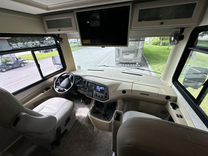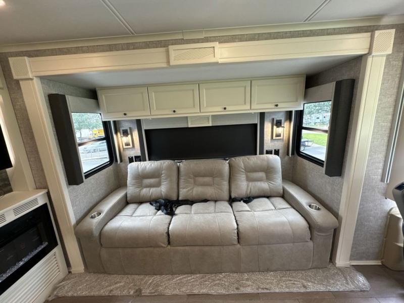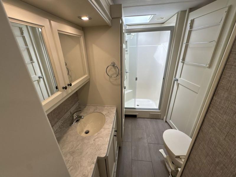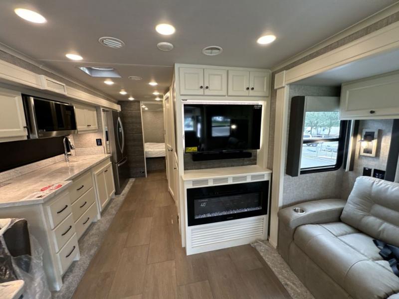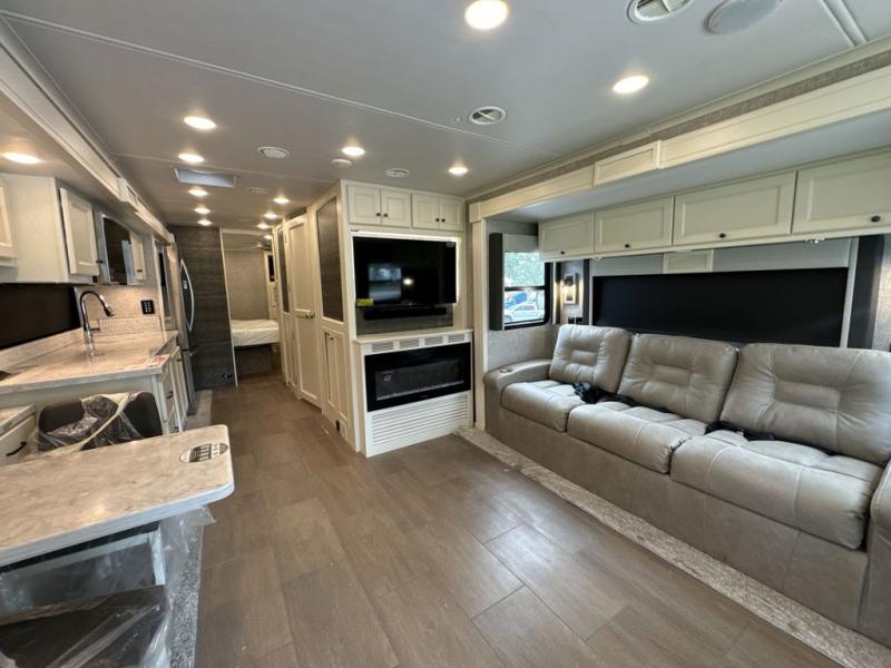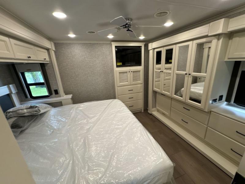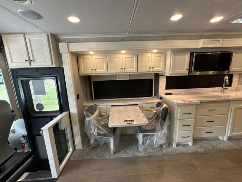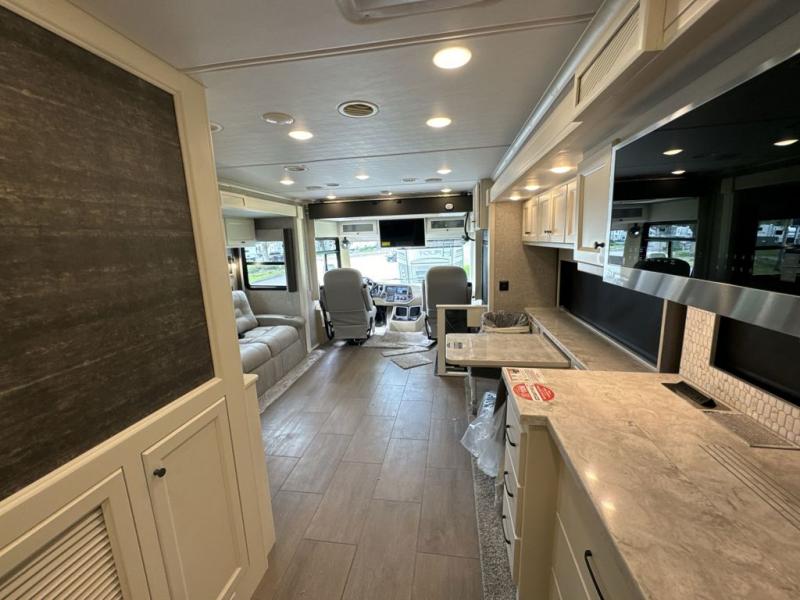 There are many standard luxurious features you will love about this motorhome! It also has many optional features you can add like the optional drop-down front bunk, the super sofa, the air coil sofa bed, or the theater seating. The king bed slide in the rear private bedroom offers a comfortable place to sleep, as well as the flip and fold sofa bed in the living area. You will love the dinette bar with a lift TV, a flip-up countertop, and two chairs that will make this the perfect place to get some work done while you're on the road. The kitchen includes everything you need to prepare meals each day, including a 1.7 cu. ft. smart convection microwave with an air fryer, a three burner liquid propane cooktop, and a 23 cu. ft. stainless steel residential refrigerator with French doors and a bottom freezer. Head to the rear master bedroom with a queen bed slide out, a large wardrobe, a cabinet with a TV and drawers below, plus a private entrance into the dual entry bath!