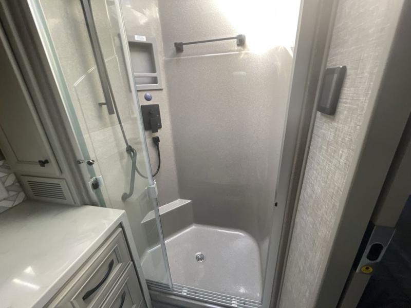 A bath and a half makes life easier on the road with this Phaeton motorhome! The master suite has a king bed slide across from a wardrobe, laundry hamper, and mounted TV, plus access to the full rear bathroom. The bathroom not only has a shower with a seat and a linen closet, but also an area that is prepped to add an optional washer and dryer. The chef can prepare their best meals in the kitchen and clean up will be even easier if you choose to add the optional drawer-type dishwasher. After a long day of traveling, everyone can relax on either the air coil sofa bed, the DE sofa bed with a lift TV behind it, or play some games at the booth dinette. There are many other options you can add to customize it to fit your style like the optional drop-down front bunk, the recliner with lift TV and fireplace, the U-shaped dinette, and theater seating!