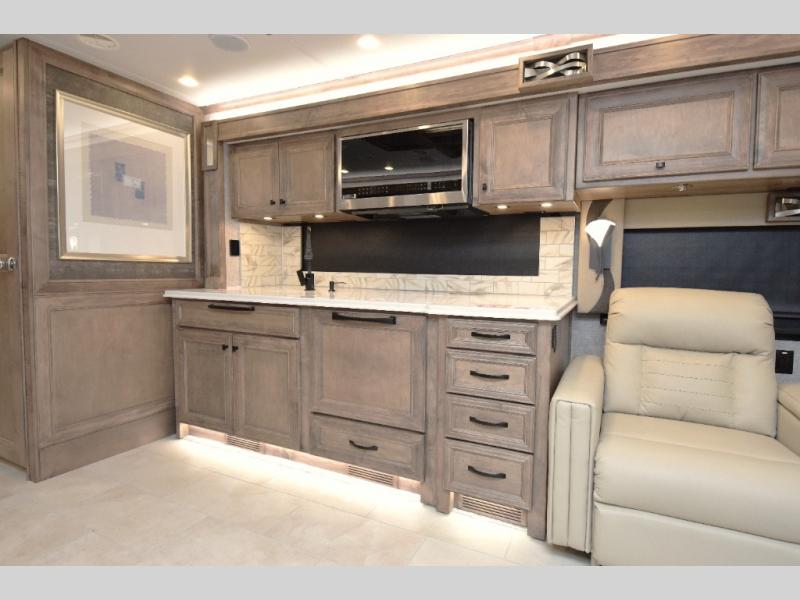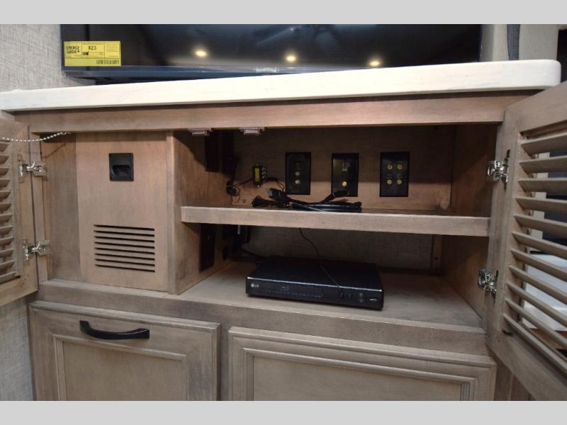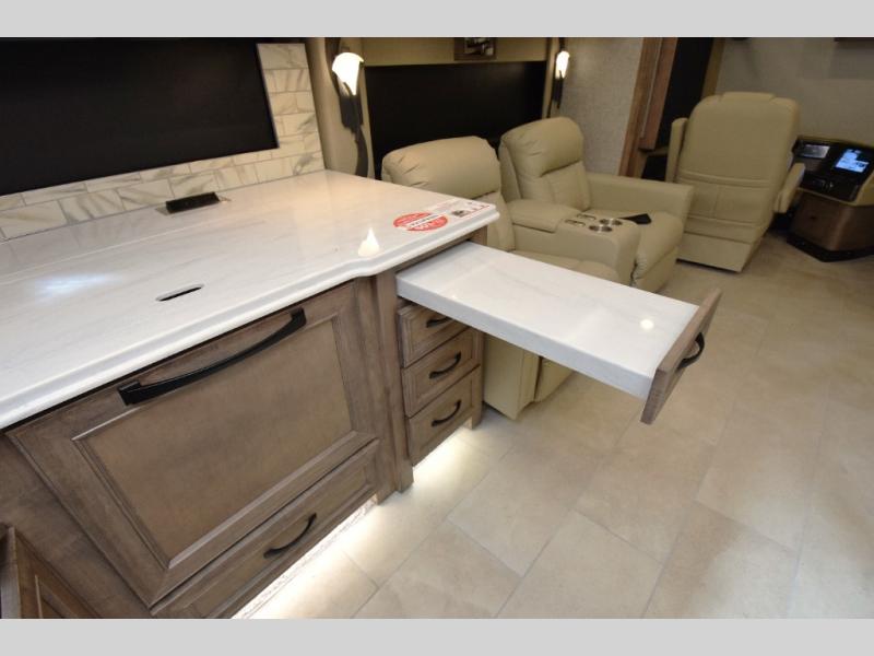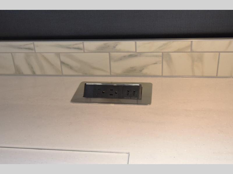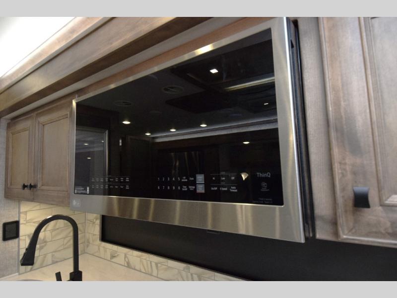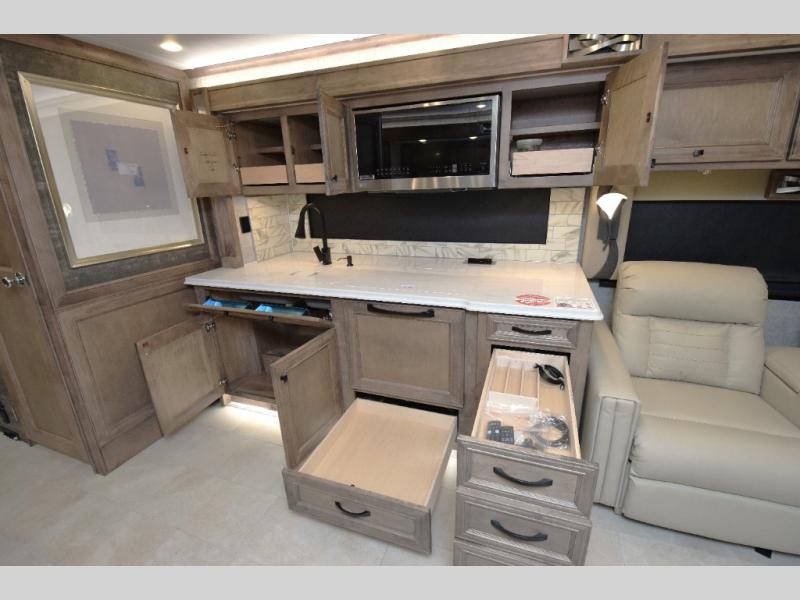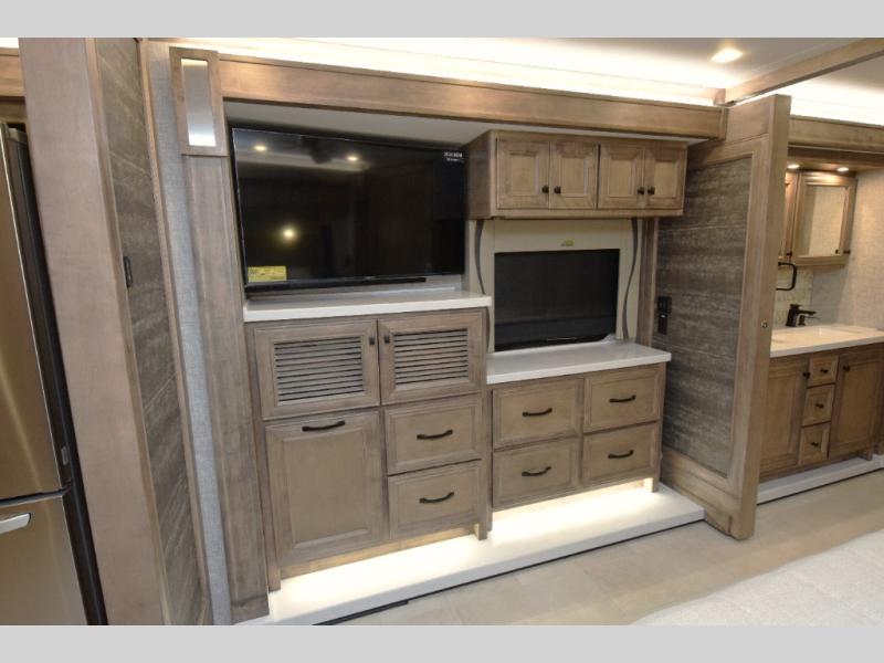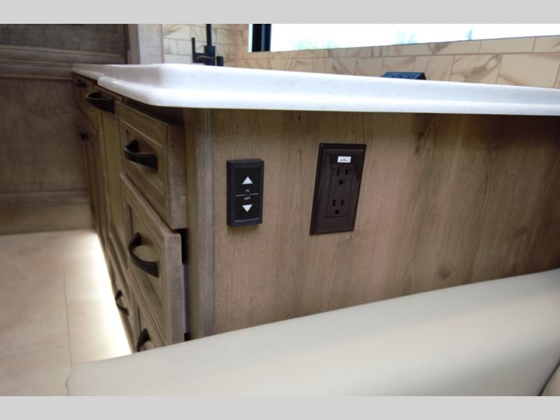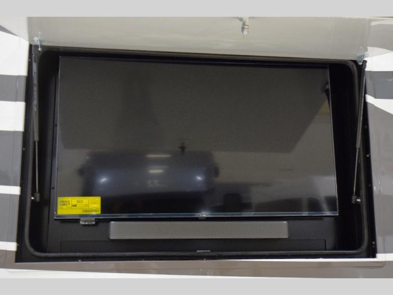 The chef’s kitchen features everything you need to create culinary masterpieces. The countertop extension and cooktop with convection microwave make cooking easy, while the option for an outdoor grill means you can take your cooking outside for BBQs and picnics. And when it’s time to unwind, catch the big game or your favorite show on the exterior TV with a sound bar!