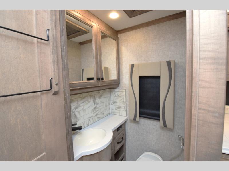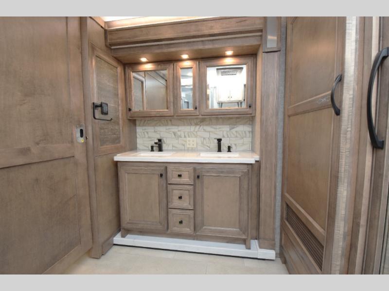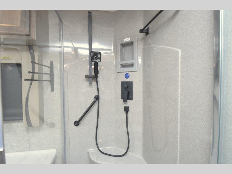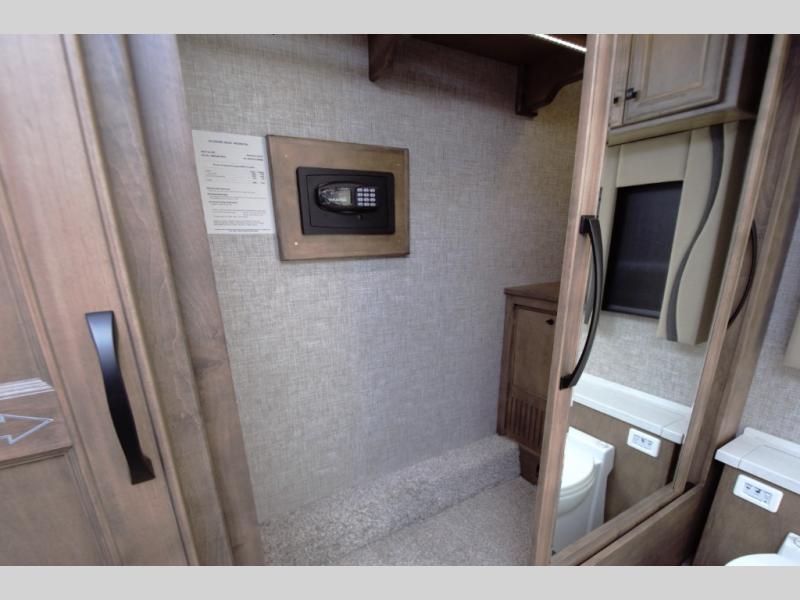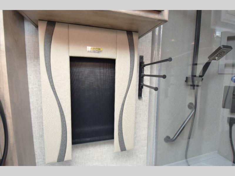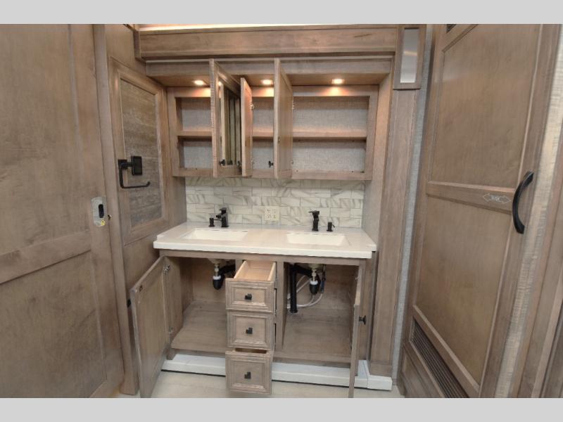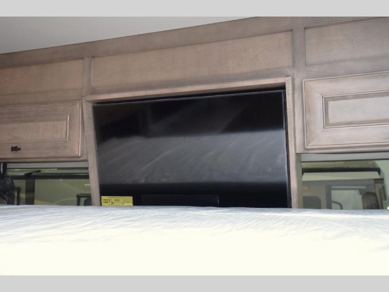 Luxury Living at Its Finest: Step into the spacious master suite, complete with a king bed slide for extra room to spread out. The mounted TV, laundry hamper, and stacked drawers create a homelike atmosphere. The full rear bathroom is a showstopper, featuring a dual sink vanity with a tri-view mirror, allowing two people to get ready at once. The shower with a seat provides a spa-like experience, and the large closet offers plenty of storage, with an area prepped for an optional washer and dryer.