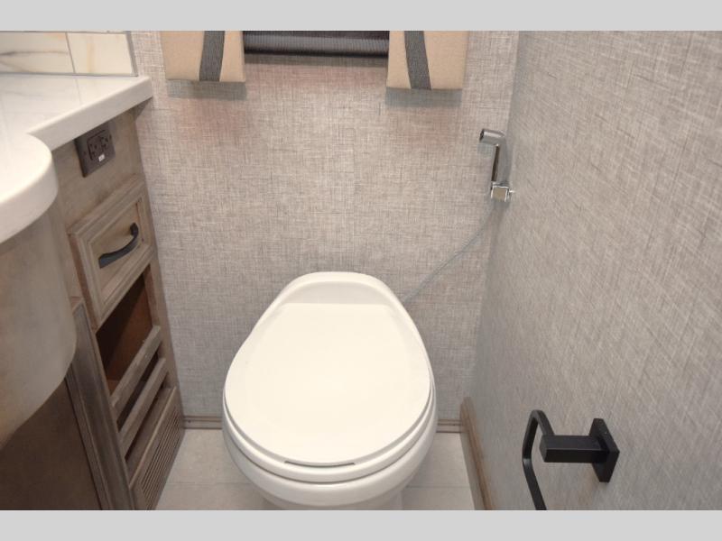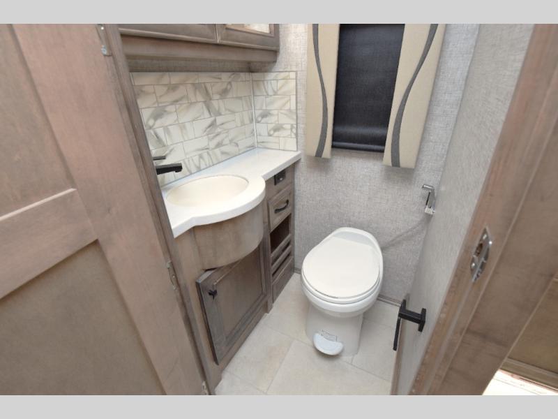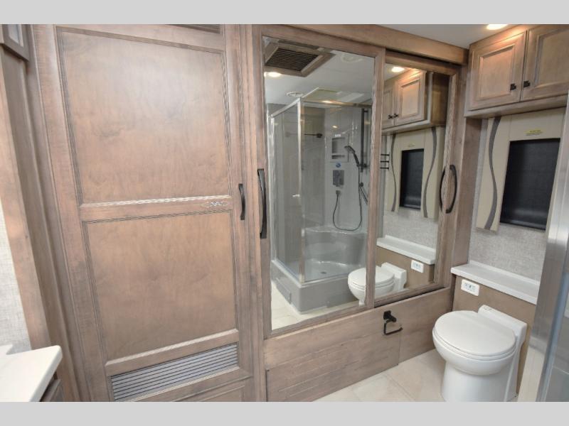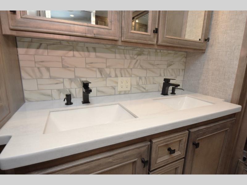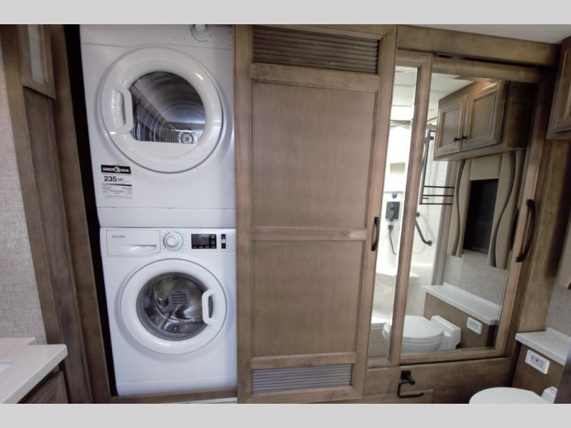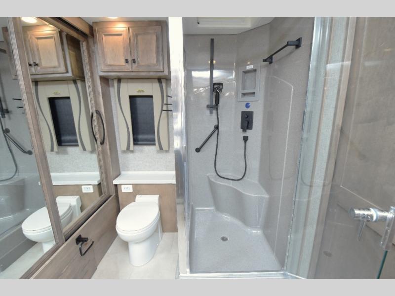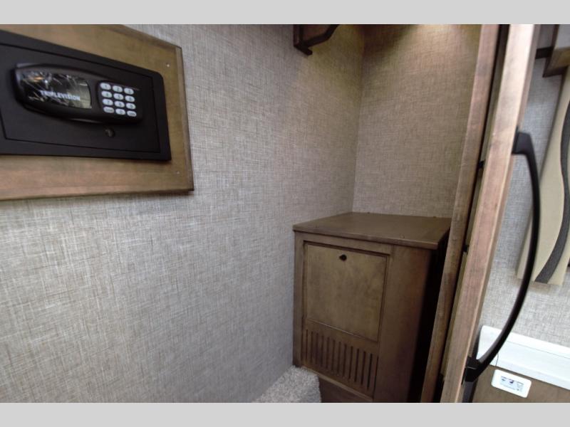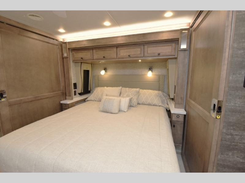 Luxury Living at Its Finest: Step into the spacious master suite, complete with a king bed slide for extra room to spread out. The mounted TV, laundry hamper, and stacked drawers create a homelike atmosphere. The full rear bathroom is a showstopper, featuring a dual sink vanity with a tri-view mirror, allowing two people to get ready at once. The shower with a seat provides a spa-like experience, and the large closet offers plenty of storage, with an area prepped for an optional washer and dryer.