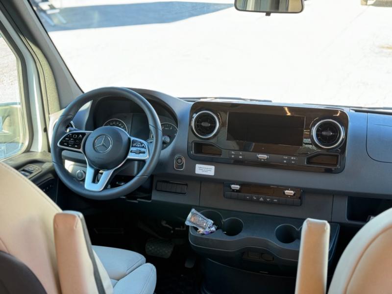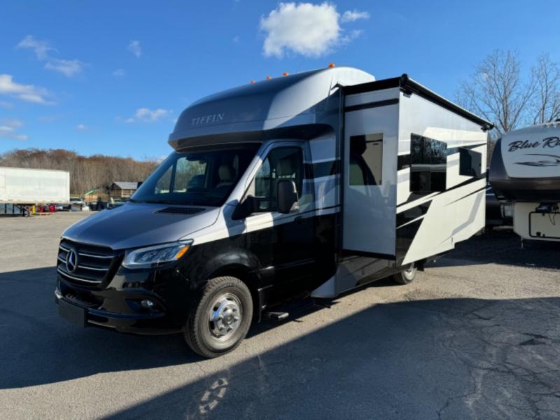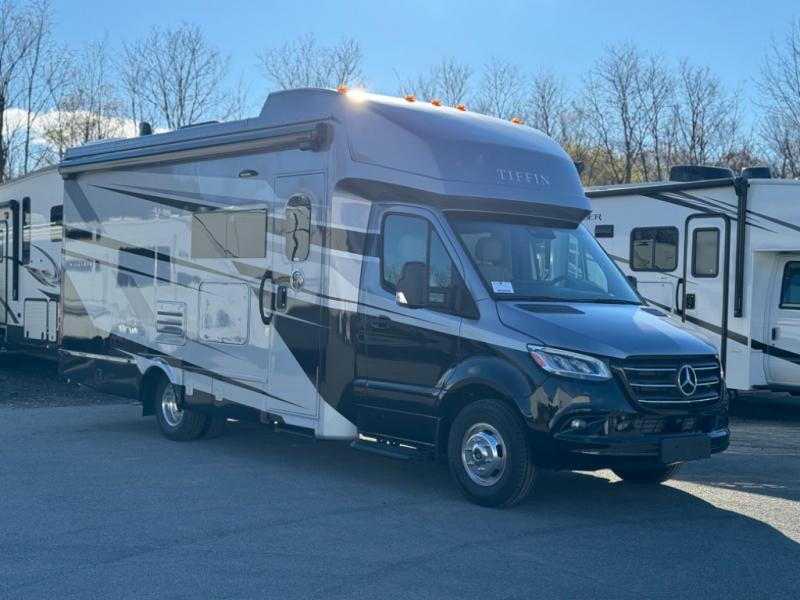 With any Wayfarer Class C diesel coach by Tiffin Motorhomes you will enjoy luxury features both inside and out. There are one-piece molded gel-coat fiberglass front and rear caps plus full-body paint and two layers of clear coat for added protection. The Mercedes-Benz 3500XD dual wheel cutaway chassis provides a strong foundation, and the 2.0L V4 turbo diesel high output 211 HP diesel engine with 332 lb-ft torque will keep you going adventure after adventure! You will love the drive just as much as the destination with black leather adjustable captain's seats that are also heated, intelligent navigation, and a Mercedes-Benz MBUX multimedia system with a 10.25" touchscreen. Wherever you decide to roam, you will be met with interior comforts that include handcrafted overhead cabinetry, solar and privacy shades, solid surface galley countertops and task lighting, and a wardrobe in the bedroom to keep your space tidy. New features include matte black cabinet hardware and bathroom accessories, a 9-speed shiftable automatic transmission, a standard 4,000 kW RVMP flex power LP generator, and more!