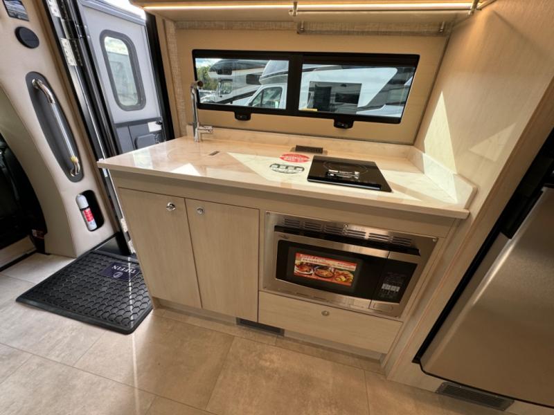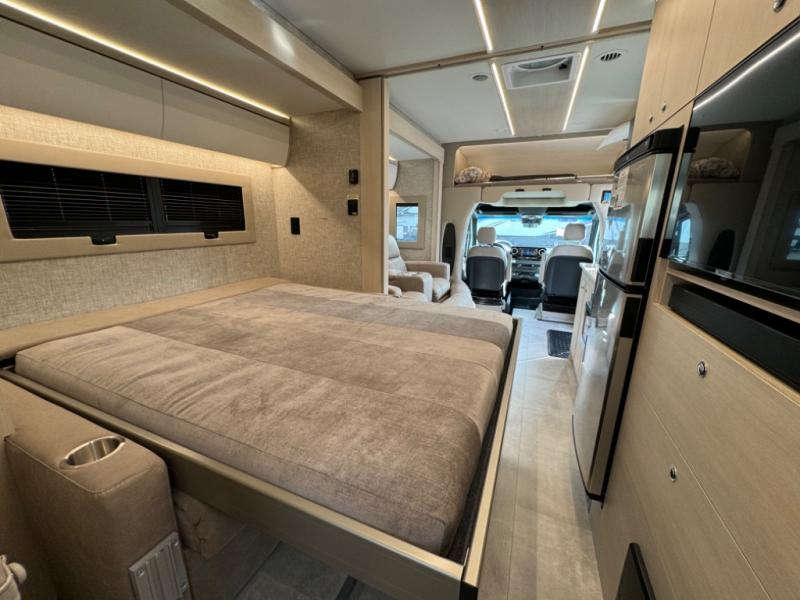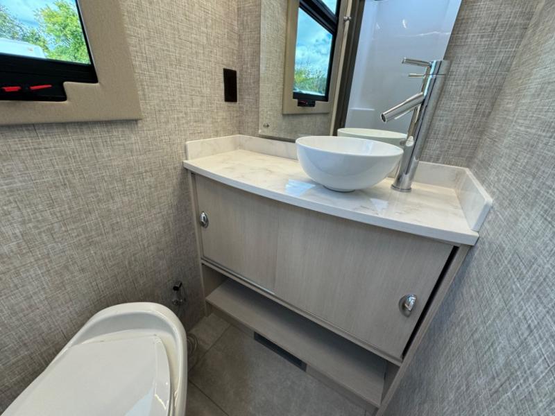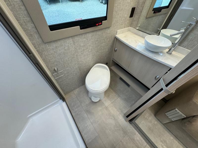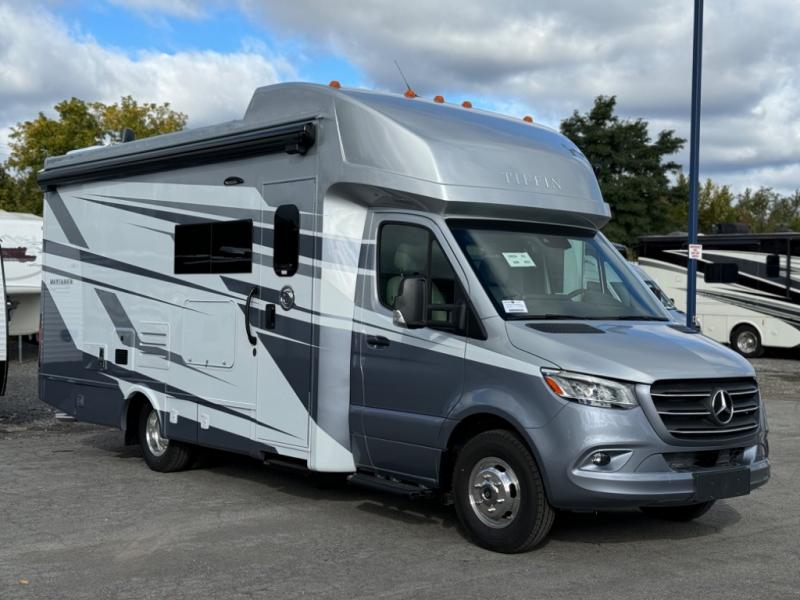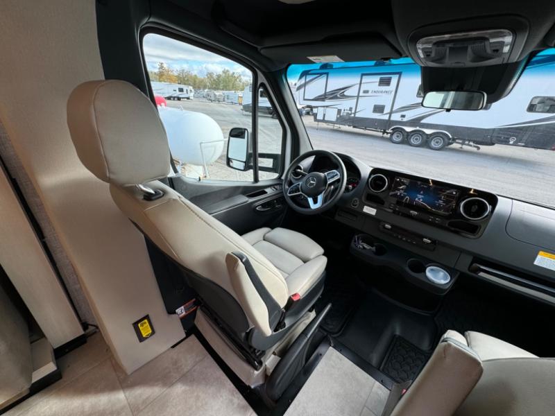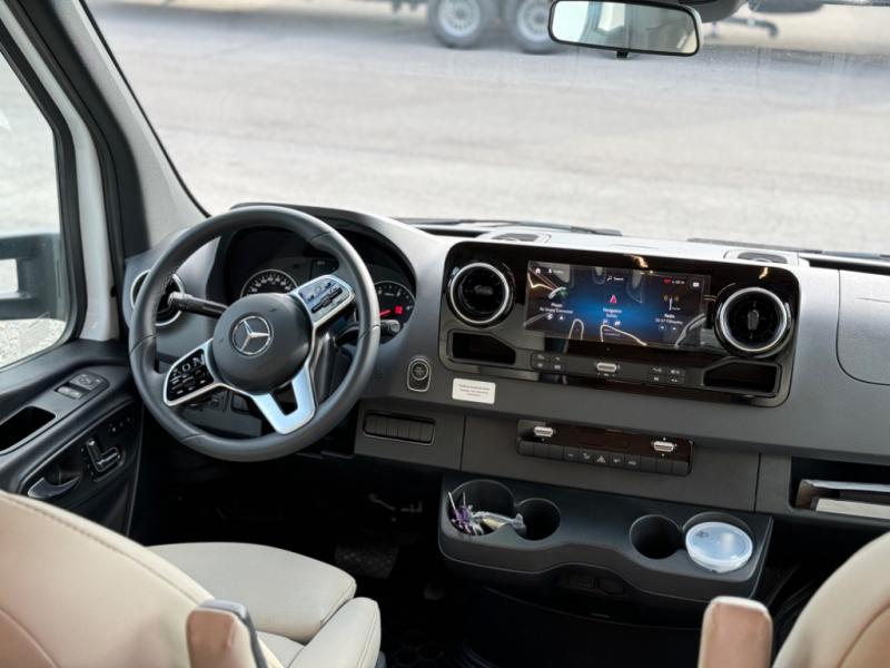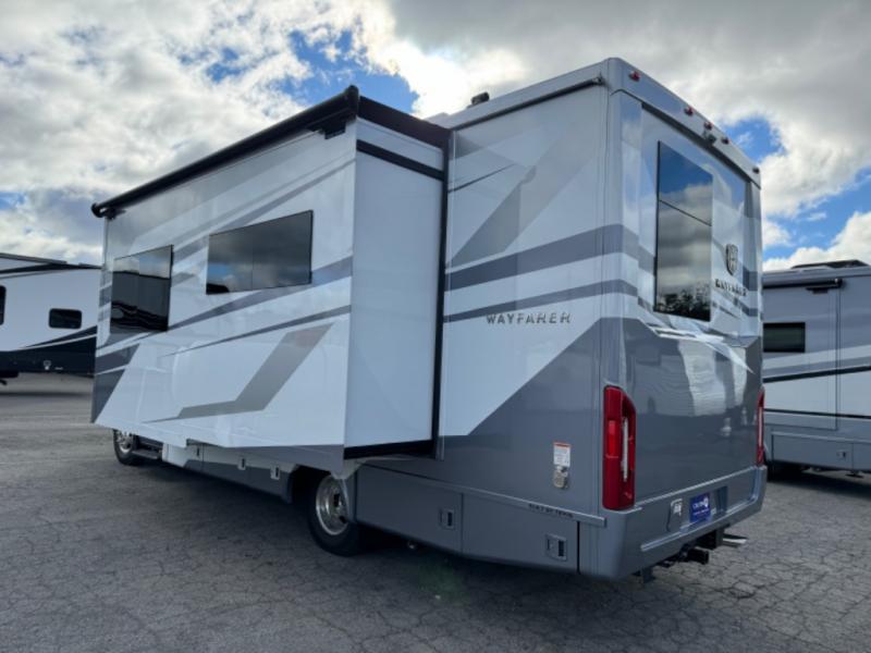 With any Wayfarer Class C diesel coach by Tiffin Motorhomes you will enjoy luxury features both inside and out. There are one-piece molded gel-coat fiberglass front and rear caps plus full-body paint and two layers of clear coat for added protection. The Mercedes-Benz 3500XD dual wheel cutaway chassis provides a strong foundation, and the 2.0L V4 turbo diesel high output 211 HP diesel engine with 332 lb-ft torque will keep you going adventure after adventure! You will love the drive just as much as the destination with black leather adjustable captain's seats that are also heated, intelligent navigation, and a Mercedes-Benz MBUX multimedia system with a 10.25" touchscreen. Wherever you decide to roam, you will be met with interior comforts that include handcrafted overhead cabinetry, solar and privacy shades, solid surface galley countertops and task lighting, and a wardrobe in the bedroom to keep your space tidy. New features include matte black cabinet hardware and bathroom accessories, a 9-speed shiftable automatic transmission, a standard 4,000 kW RVMP flex power LP generator, and more!