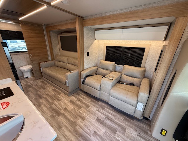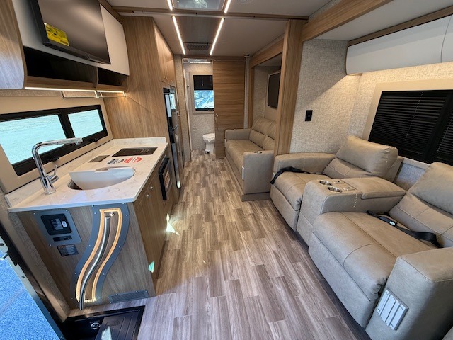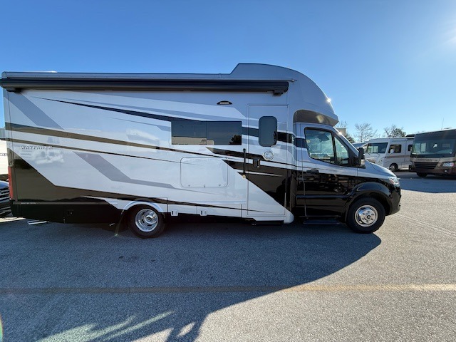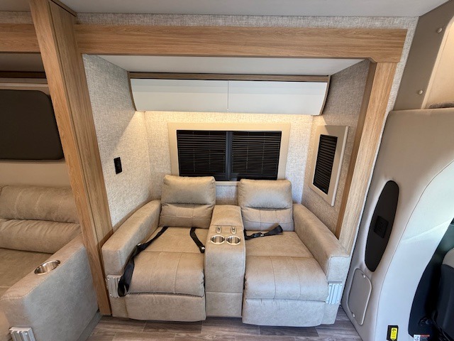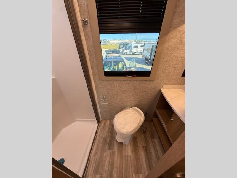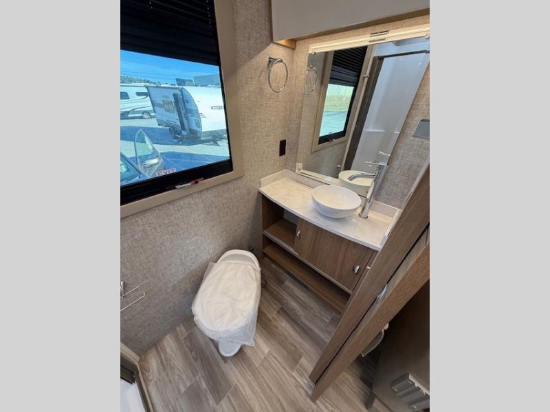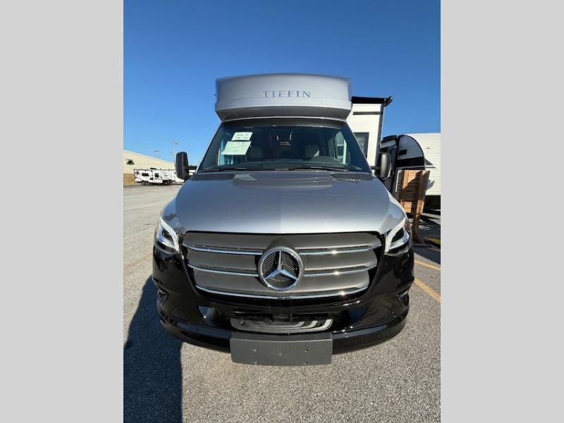 With any Wayfarer Class C diesel coach by Tiffin Motorhomes you will enjoy luxury features both inside and out. There are one-piece molded gel-coat fiberglass front and rear caps plus full-body paint and two layers of clear coat for added protection. The Mercedes-Benz 3500XD dual wheel cutaway chassis provides a strong foundation, and the 2.0L V4 turbo diesel high output 208 HP diesel engine with 332 lb-ft torque will keep you going adventure after adventure! You will love the drive just as much as the destination with adjustable captain's seats that are also heated, intelligent navigation, and a Mercedes-Benz MBUX multimedia system with a 10.25" touchscreen. Wherever you decide to roam, you will be met with interior comforts that include high pressure laminate cabinets, solar and privacy shades, solid surface galley countertops and task lighting, and a wardrobe in the bedroom to keep your space tidy.