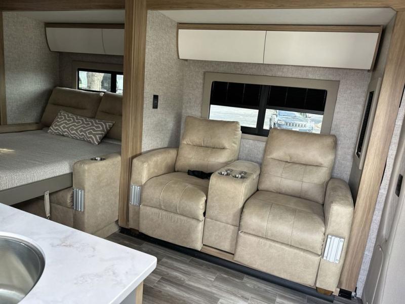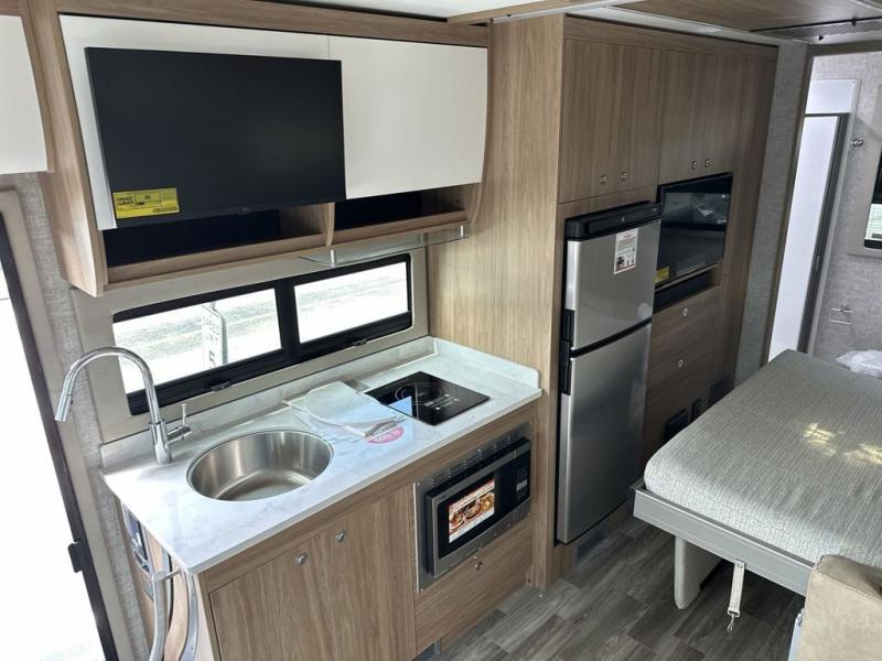 Travel with your favorite person, family, or some friends to see nature along the highways, up close and where ever the road takes you! You will find sleeping space for five with the bunk over the cab, the booth dinette-sleeper, and the versatile queen-size Murphy bed and sofa combo! The rear full bathroom gives you privacy, and the galley kitchen lets you make meals on the two burner cooktop and convection microwave oven. You might like to add a few options to customize your coach such as optional theater seating, or a tri-fold sofa in place of the dinette, a central vacuum system, an overhead entertainment center in place of the bunk, and/or an exterior TV to enjoy under the awning.