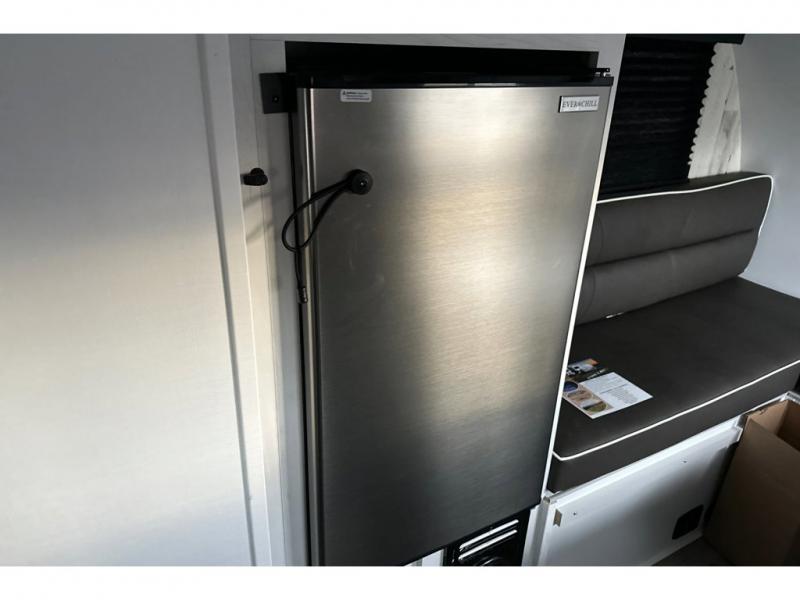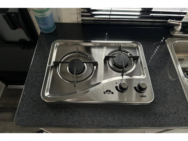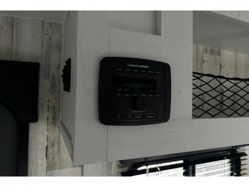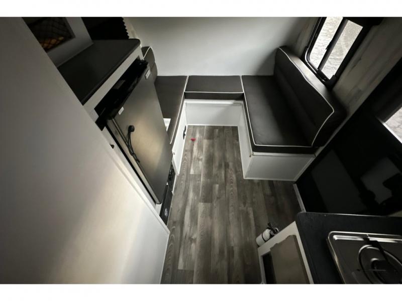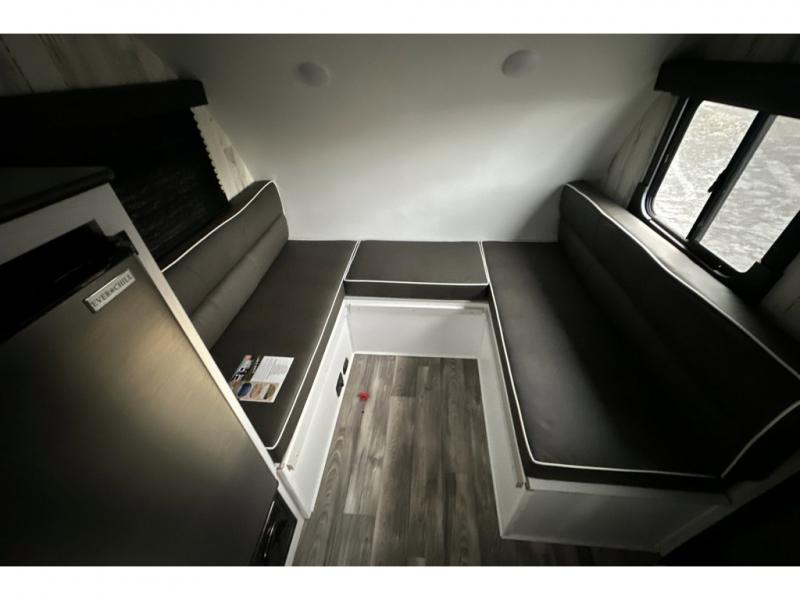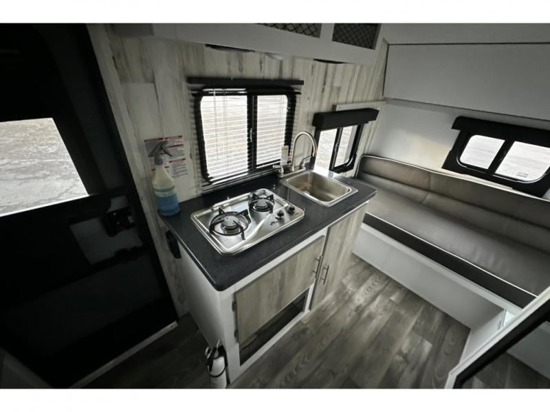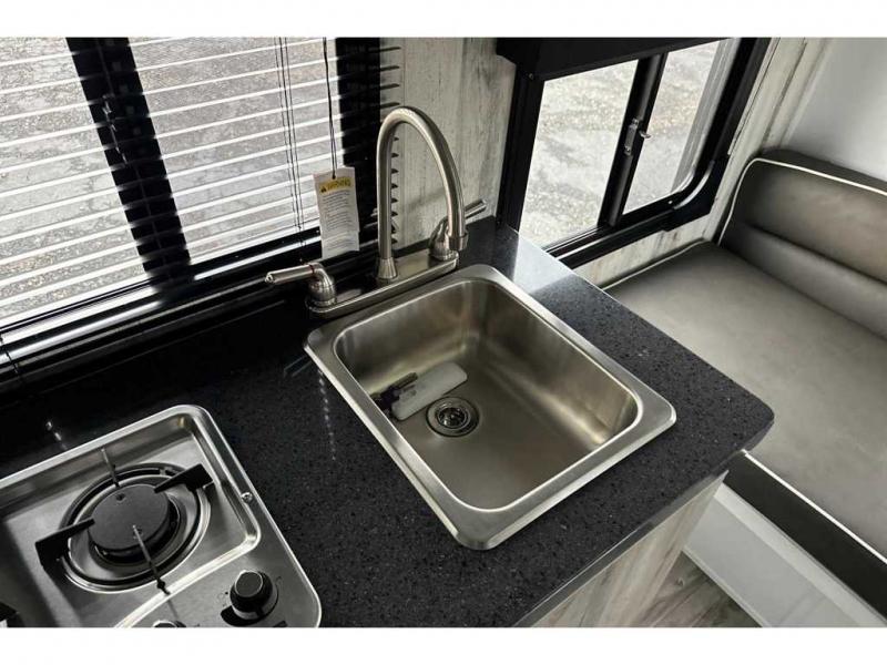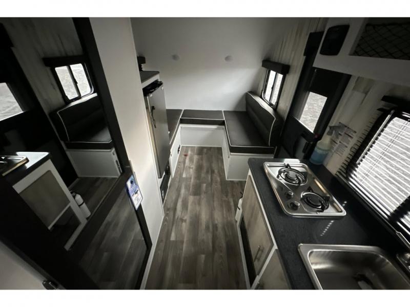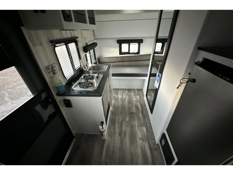 This travel trailer is ready for an adventure whenever you are! You can prepare home cooked meals using the two-burner cooktop, 3.3 cu. ft. 12V refrigerator, and single bowl stainless steel sink, then enjoy them at the front booth dinette which can transform into a 54" x 74" bed. Grab a snack from the kitchen pantry and relax on the rear sofa with overhead cabinets and a bunk bed above it, plus it can also transform into a 36" x 74" bed for sleeping too. With a wet bath, you can rinse the sand out of your hair after a fun day at the beach and the fantastic vent will eliminate any unwanted steam!