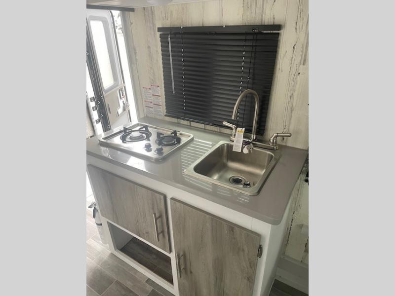This travel trailer is ready for an adventure whenever you are! You can prepare home cooked meals using the two-burner cooktop, 3.3 cu. ft. 12V refrigerator, and single bowl stainless steel sink, then enjoy them at the front booth dinette which can transform into a 54" x 74" bed. Grab a snack from the kitchen pantry and relax on the rear sofa with overhead cabinets and a bunk bed above it, plus it can also transform into a 36" x 74" bed for sleeping too. With a wet bath, you can rinse the sand out of your hair after a fun day at the beach and the fantastic vent will eliminate any unwanted steam!