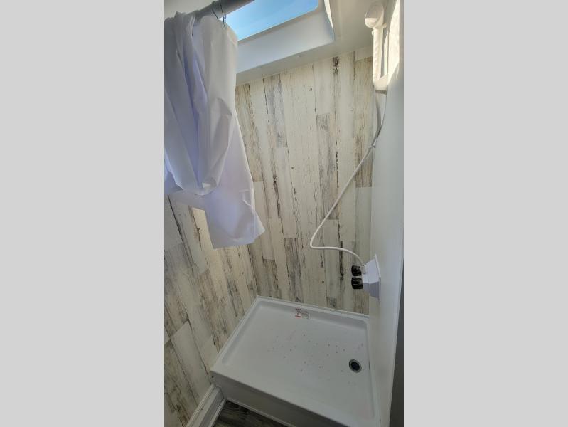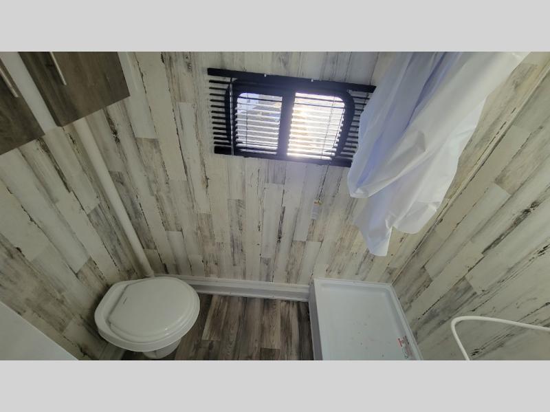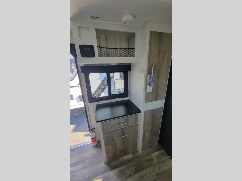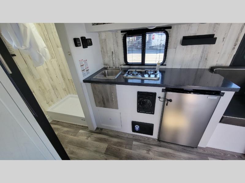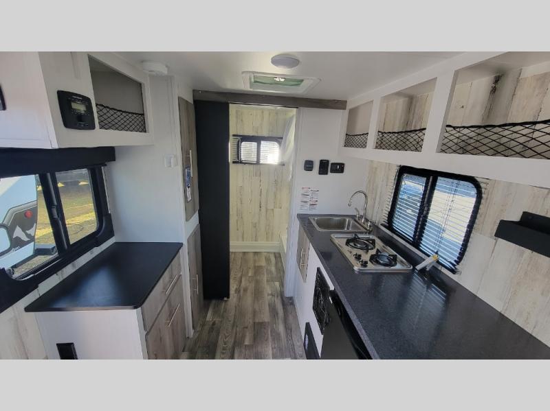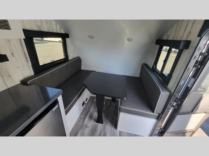 This Rove Lite can be the perfect couples adventure companion when you love the outdoors! This unit features a front booth dinette that transforms into a 54" x 74" bed to sleep on at night. There is also a full rear dry bath including a 24" x 36" shower and toilet with overhead storage for your towels and toiletries. A 13" x 15" sink is just outside the space saving sliding barn door for convenience. You will easily be able to whip up a meal or snacks with the two-burner cooktop, plenty of counter space, and a 3.3 cu. ft. 12V refrigerator for your perishables. There is storage throughout the inside for your camping necessities with several overhead cabinets and a pantry.