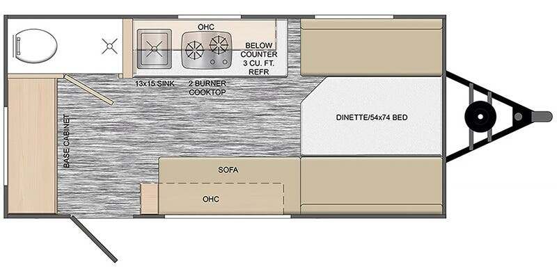 You will have everything you need for a comfortable camping trip in this travel trailer! It features a front booth dinette that transforms into a 54" x 74" bed to sleep on at night. There is storage throughout the inside for your camping necessities between the overhead cabinets and the base cabinet. The fully equipped kitchen has a 3.3 cu. ft. 12V refrigerator below a solid surface countertop, and a two-burner cooktop, and a single bowl stainless steel sink for easy clean up. Rinse off each night in the rear corner wet bath after a day outdoors!