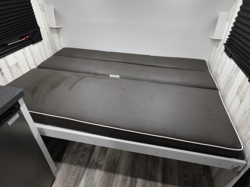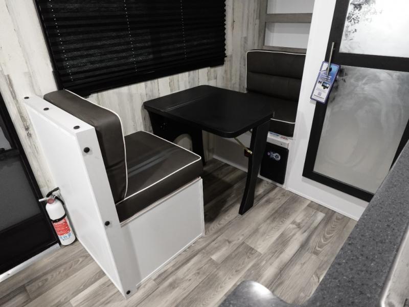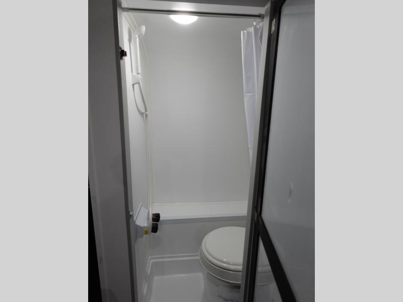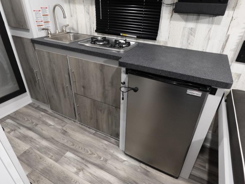 Head to your favorite campgrounds with your favorite person in this travel trailer! Relax each evening in true comfort on the front sofa while enjoying a snack that was stored in the kitchen pantry, and the sofa transforms into a full bed for sleeping at night too. The two person dinette offers a comfortable place to play games and enjoy your meals at that were prepared using the two-burner cooktop, 3.3 cu. ft. 12V refrigerator, and single bowl stainless steel sink. There are shelves and overhead cabinets throughout to store your items, and a rear corner wet bath to freshen up in each morning with a fantastic vent to eliminate any unwanted steam!