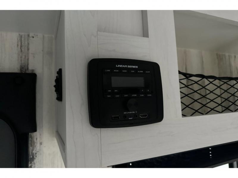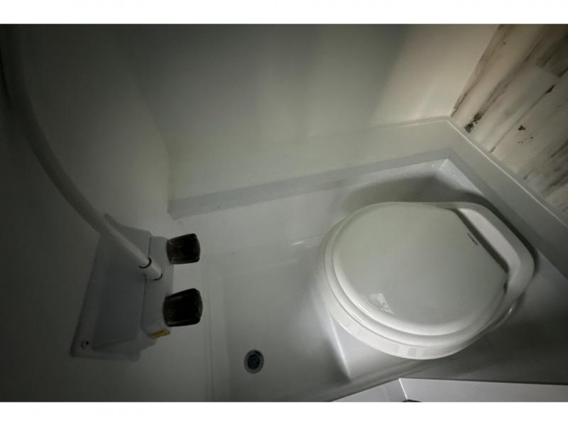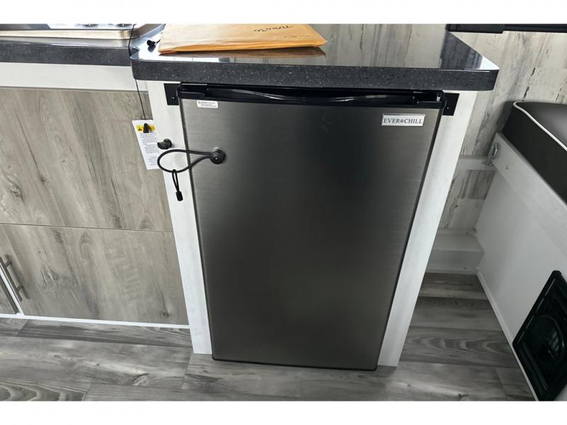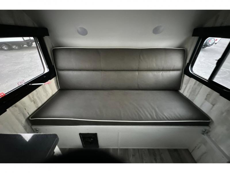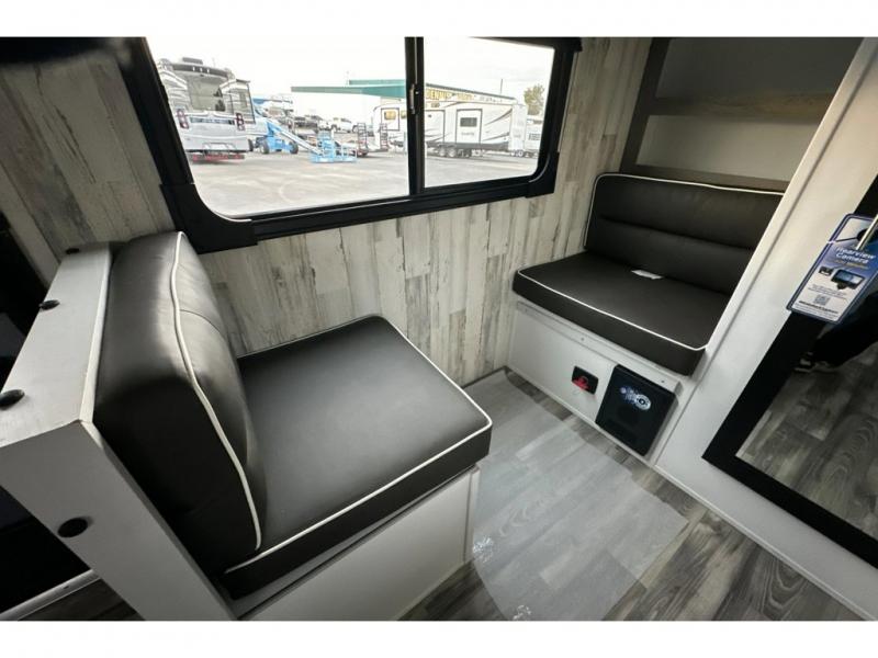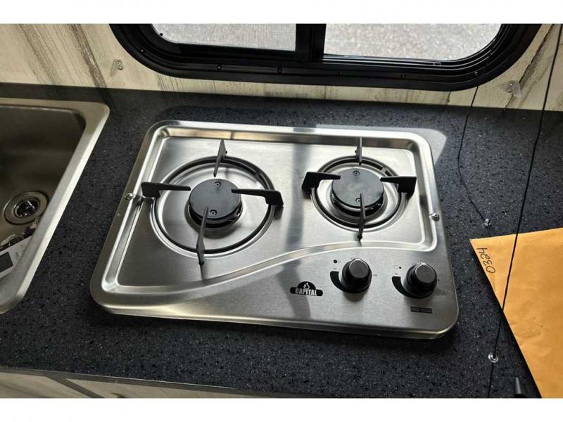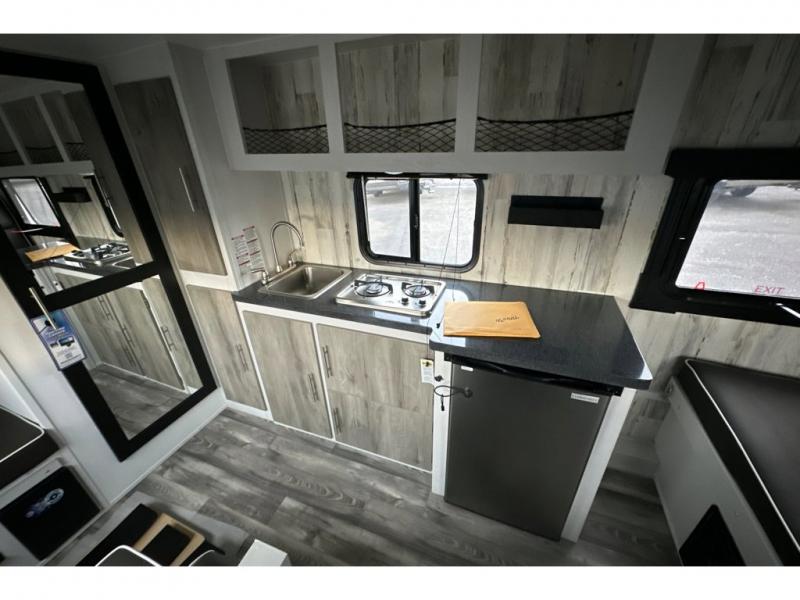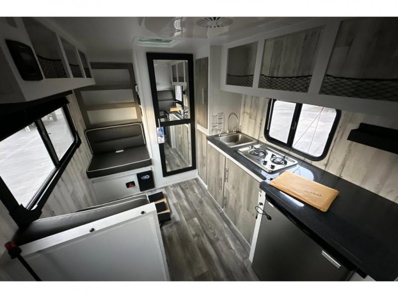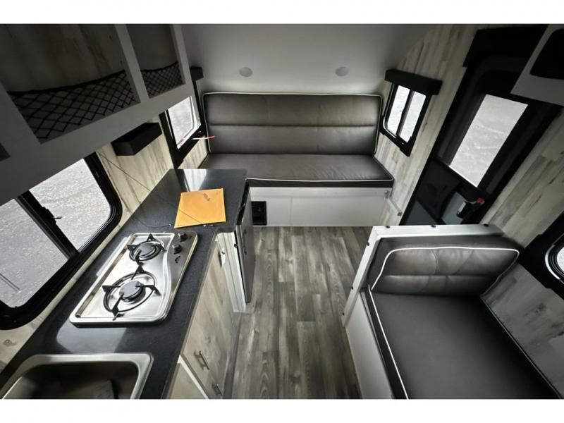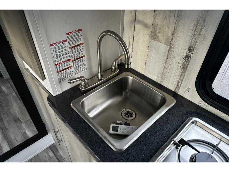Head to your favorite campgrounds with your favorite person in this travel trailer! Relax each evening in true comfort on the front sofa while enjoying a snack that was stored in the kitchen pantry, and the sofa transforms into a full bed for sleeping at night too. The two person dinette offers a comfortable place to play games and enjoy your meals at that were prepared using the two-burner cooktop, 3.3 cu. ft. 12V refrigerator, and single bowl stainless steel sink. There are shelves and overhead cabinets throughout to store your items, and a rear corner wet bath to freshen up in each morning with a fantastic vent to eliminate any unwanted steam!