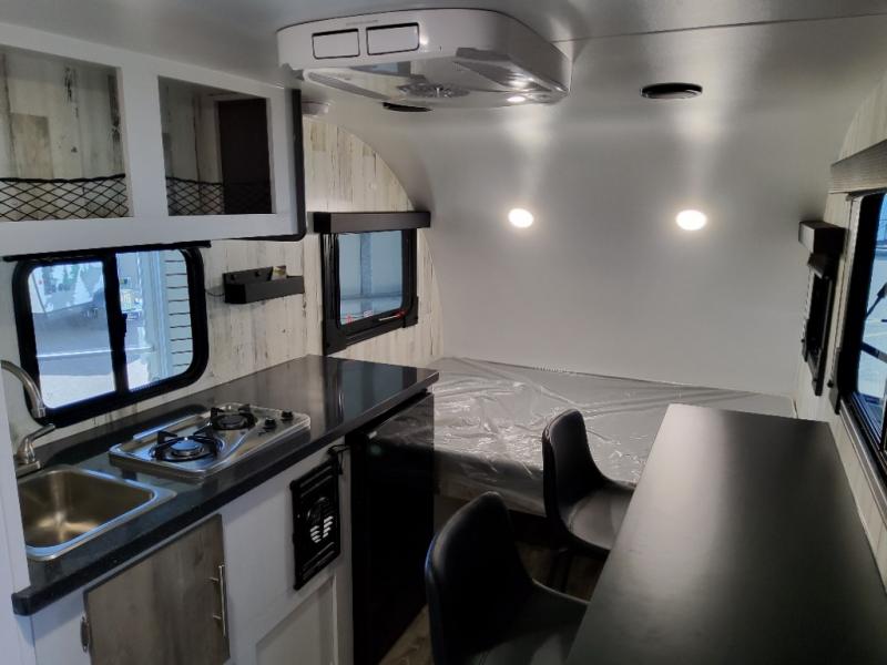 This is the perfect couple's trailer to take on trips to the campground. There is a front full-size bed so you don't have to sleep on an air mattress, a convenient wet bath to stay clean each day, and a bar table top dinette with two stools to dine together. A two burner cooktop will let you cook meals each day, and there is a 3 cu. ft. 12V refrigerator below the counter to keep cold items fresh.