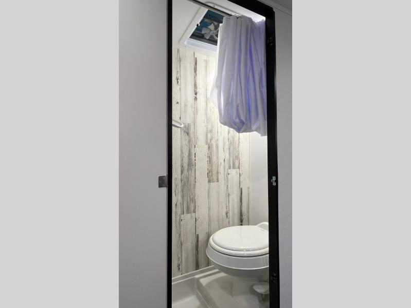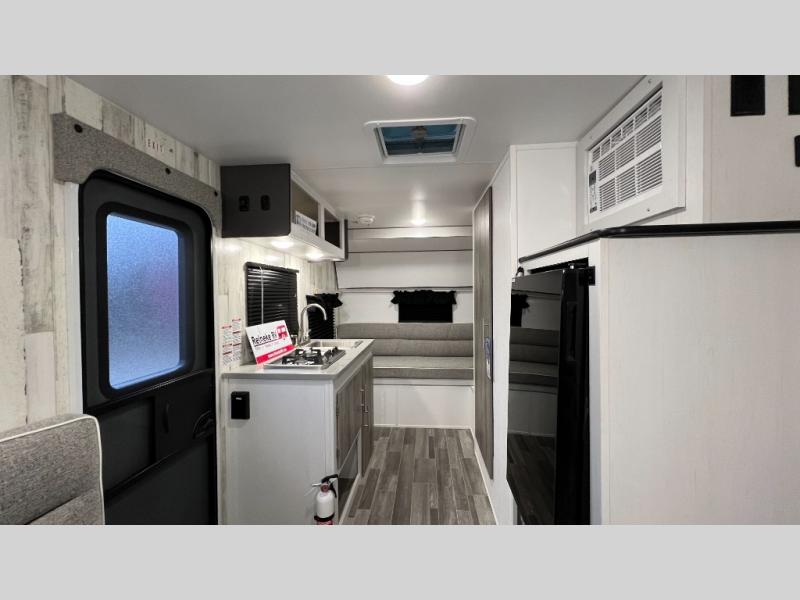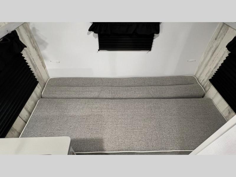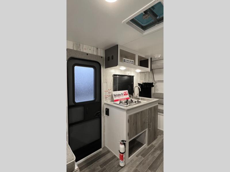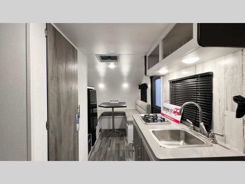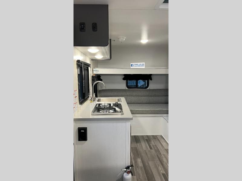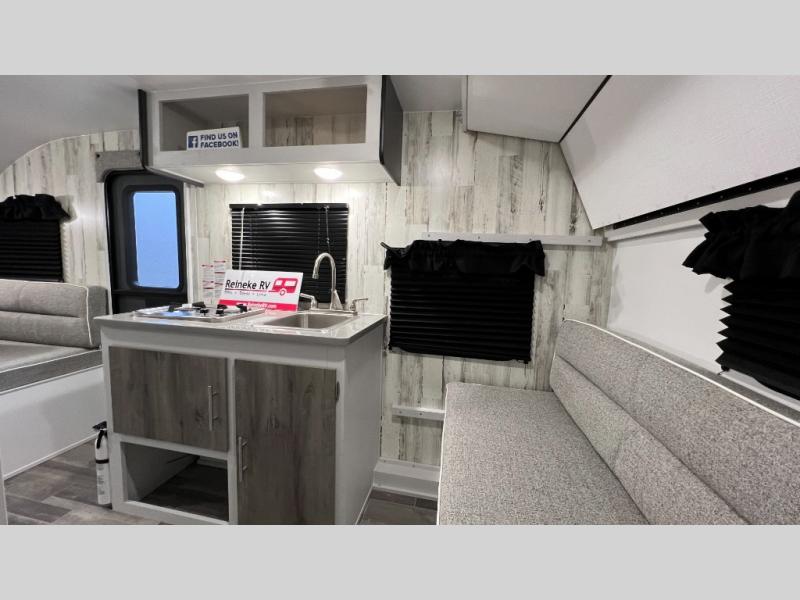 This travel trailer is ready for an adventure whenever you are! You can prepare home cooked meals using the two-burner cooktop, 3.3 cu. ft. 12V refrigerator, and single bowl stainless steel sink, then enjoy them at the front booth dinette which can transform into a 54" x 74" bed. Grab a snack from the kitchen pantry and relax on the rear sofa with overhead cabinets and a bunk bed above it, plus it can also transform into a 36" x 74" bed for sleeping too. With a wet bath, you can rinse the sand out of your hair after a fun day at the beach and the fantastic vent will eliminate any unwanted steam!