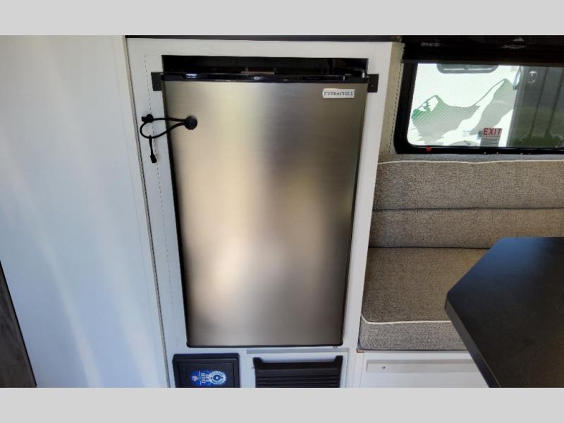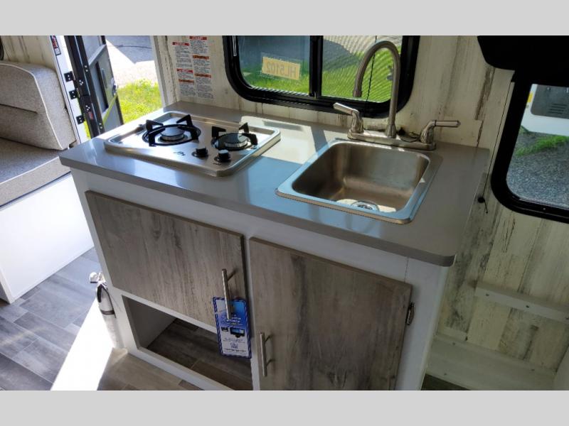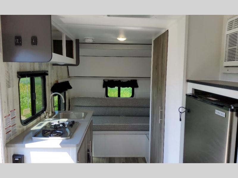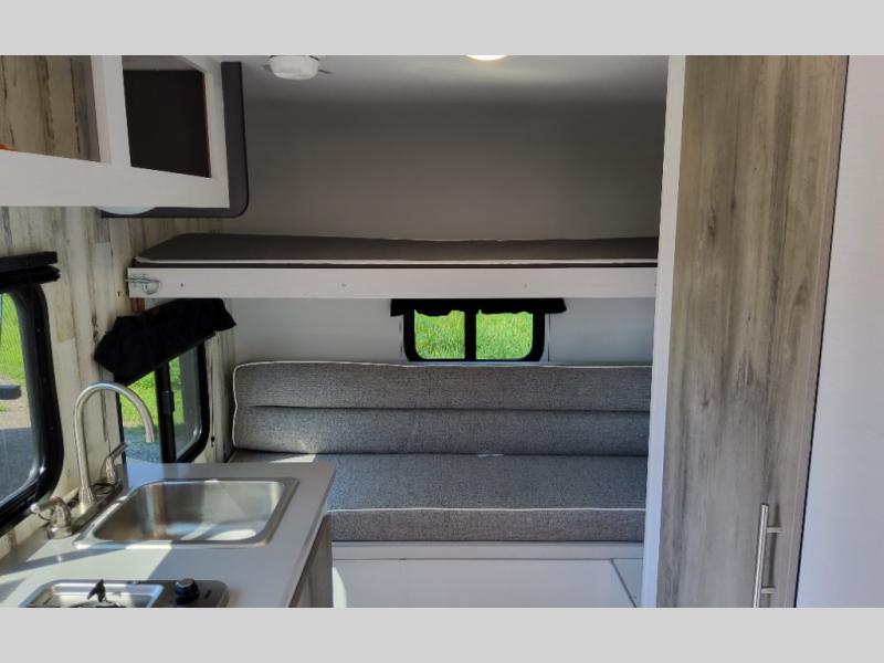 Head to the great outdoors in this travel trailer! Prepare a delicious home cooked meal with the two burner stainless steel stovetop, clean up the dishes in the single bowl stainless steel sink with high rise faucet, and store any leftovers in the 12V 3 cu. ft. refrigerator. The front dinette is great for eating meals, playing games, and transforming into a 54" x 74" bed for an extra sleeping space. The rear sofa can also transform into a 36" x 74" bed, and it has a overhead cabinet/bunk bed above it. The wet bathroom has a 12V power vent to eliminate any unwanted steam. When you desire extra privacy, simply close the soft shades!