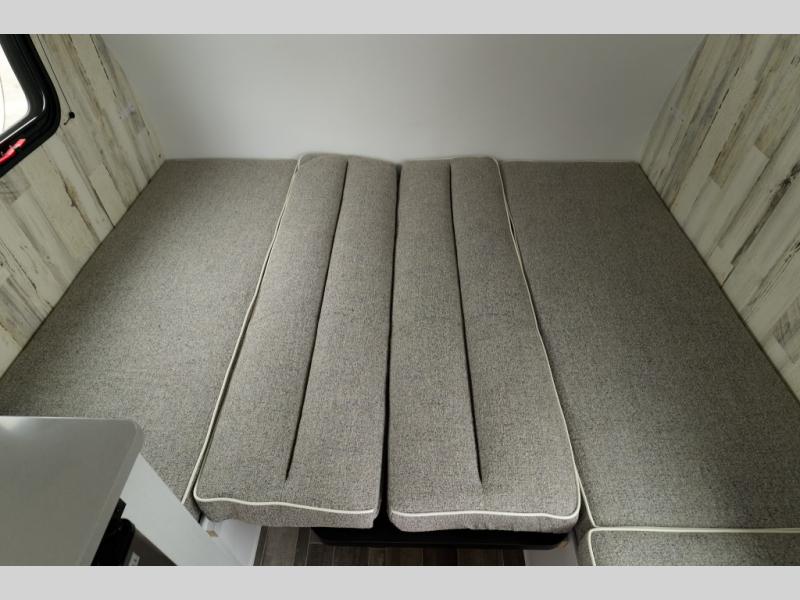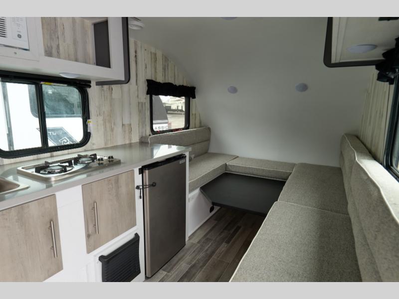 You and your spouse will love camping in this travel trailer! Prepare a delicious home cooked meal with the two burner stainless steel stovetop, clean up the dishes in the single bowl stainless steel sink with high rise faucet, and store any leftovers in the below the counter 12V 3 cu. ft. refrigerator. The front dinette is great for eating meals, playing games, and transforming into a 54" x 74" bed for an extra sleeping space. The sofa can also be another sleeping space. There is a base cabinet to store your items and is next to the wet bathroom which has a 12V power vent to eliminate any unwanted steam. When you desire extra privacy, simply close the soft shades!