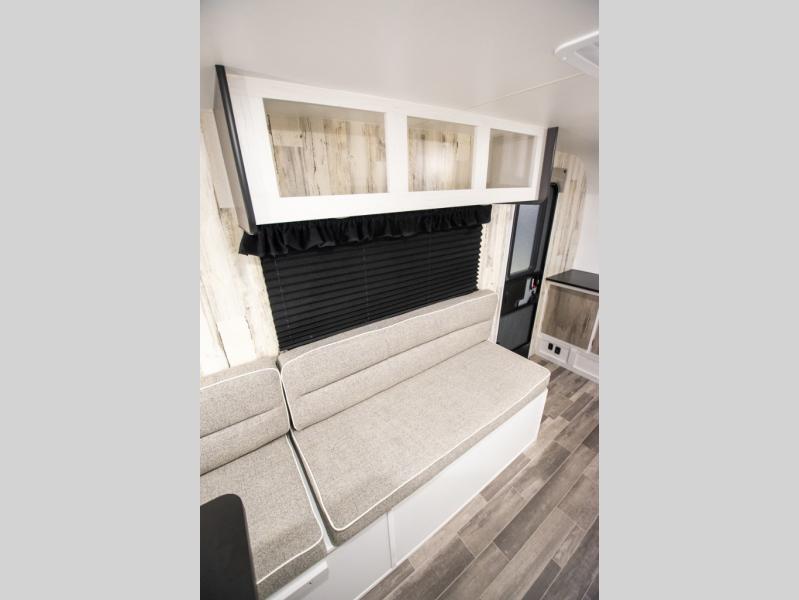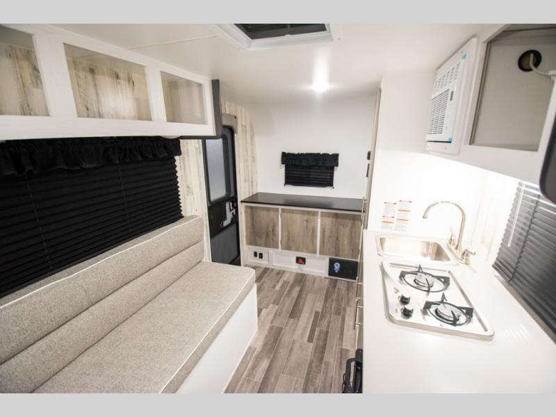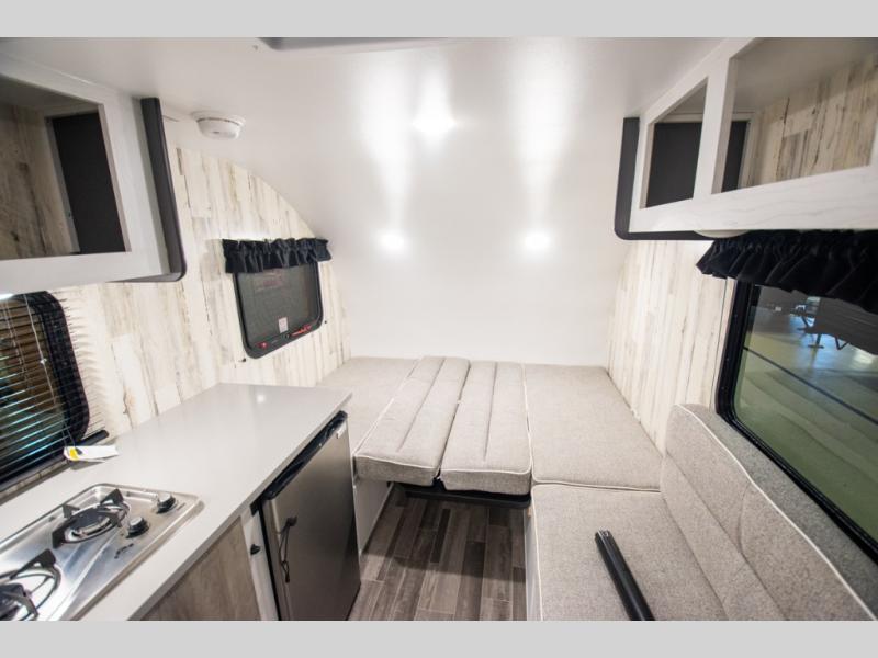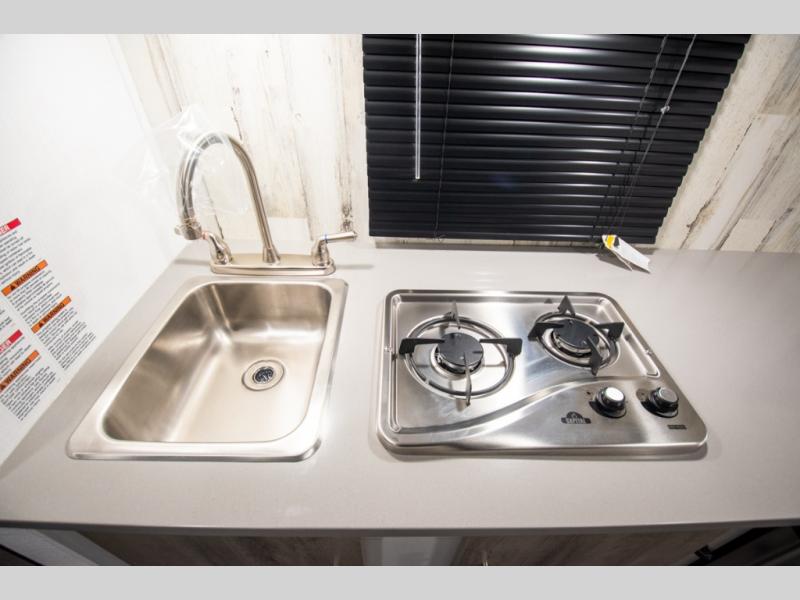 You and your spouse will love camping in this travel trailer! Prepare a delicious home cooked meal with the two burner stainless steel stovetop, clean up the dishes in the single bowl stainless steel sink with high rise faucet, and store any leftovers in the below the counter 12V 3 cu. ft. refrigerator. The front dinette is great for eating meals, playing games, and transforming into a 54" x 74" bed for an extra sleeping space. The sofa can also be another sleeping space. There is a base cabinet to store your items and is next to the wet bathroom which has a 12V power vent to eliminate any unwanted steam. When you desire extra privacy, simply close the soft shades!