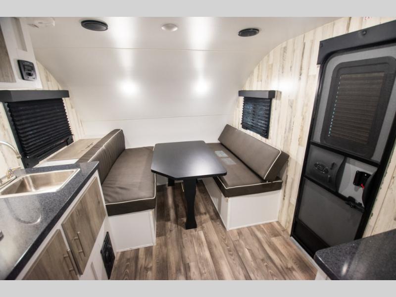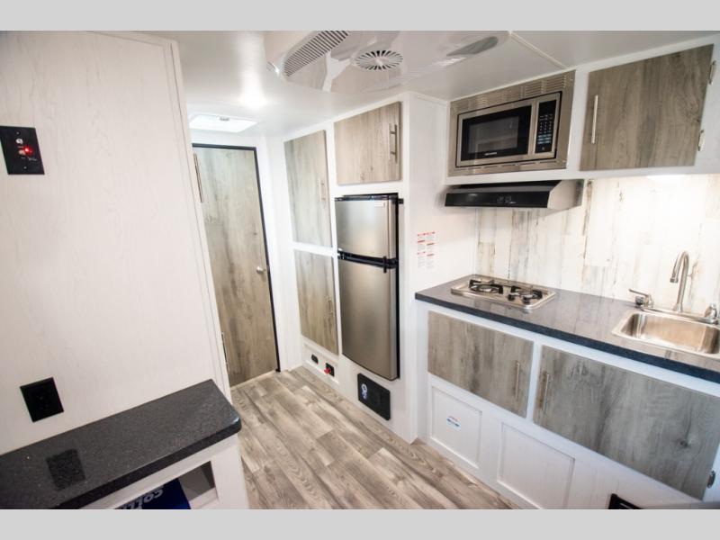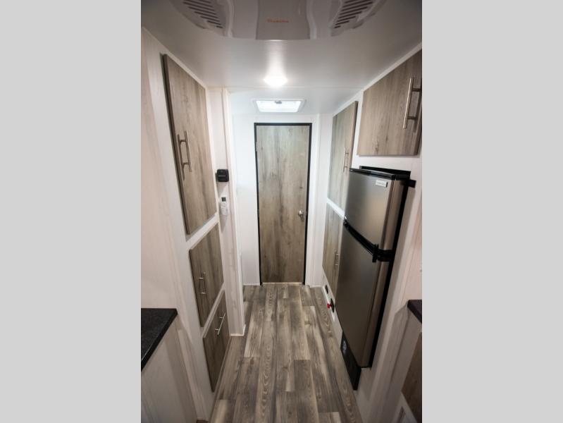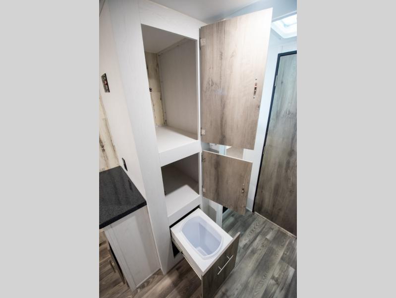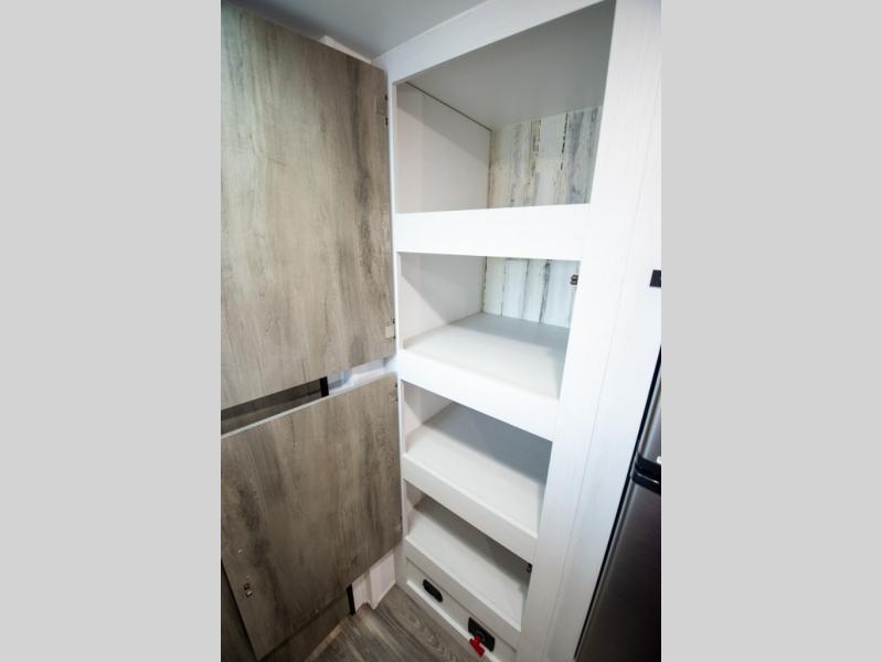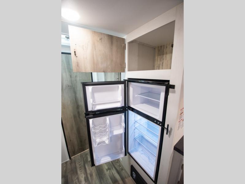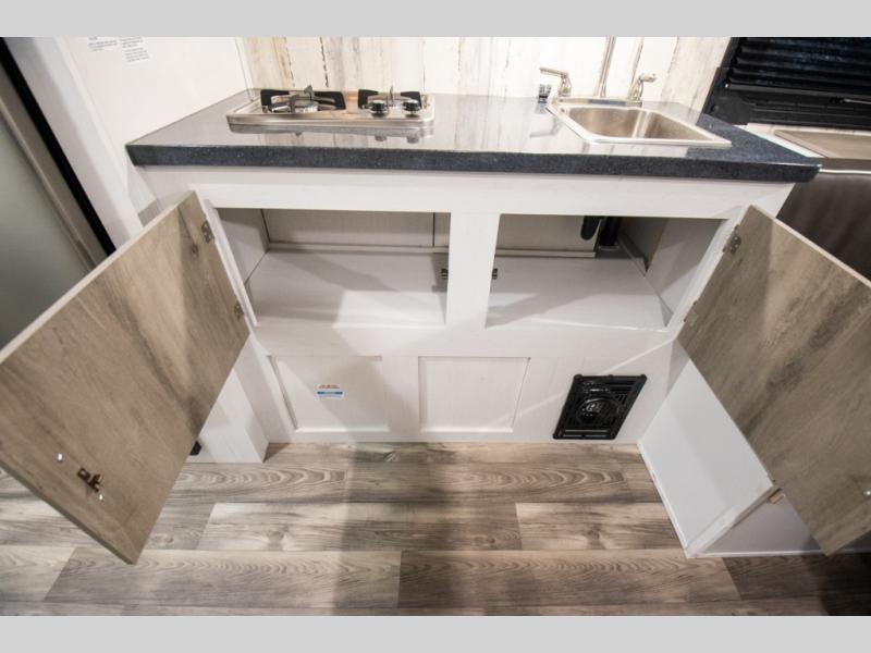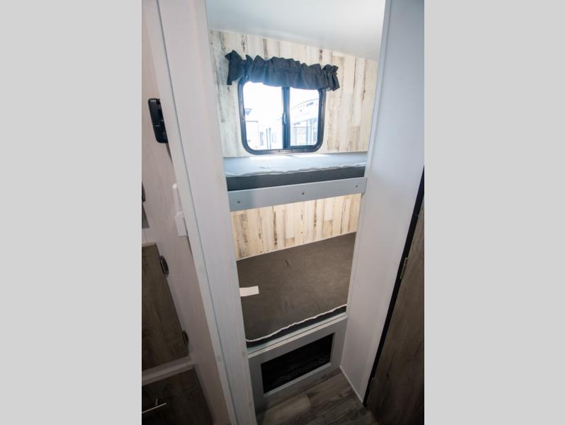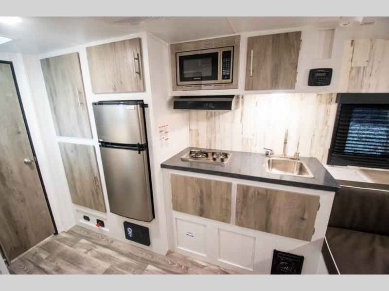 Weekends at the campground are made easy with this travel trailer that can sleep four each night. Once you've unpacked your things, you can stretch your legs around the camp, then head inside to make lunch. You'll find a two burner stainless steel cooktop in the kitchen, along with a 12V refrigerator and a pantry for food storage. There is also a closet with a pull out trash can below that will be perfect to keep cleaning supplies or paper goods in. When it's time to turn in for the night, there are 28" x 72" bunk beds that share the rear of this unit with the private bath, plus a front booth dinette that can convert to a queen-size sleeping space. This travel trailer also includes plenty of storage space, including storage shelves in the bath and above the dinette!