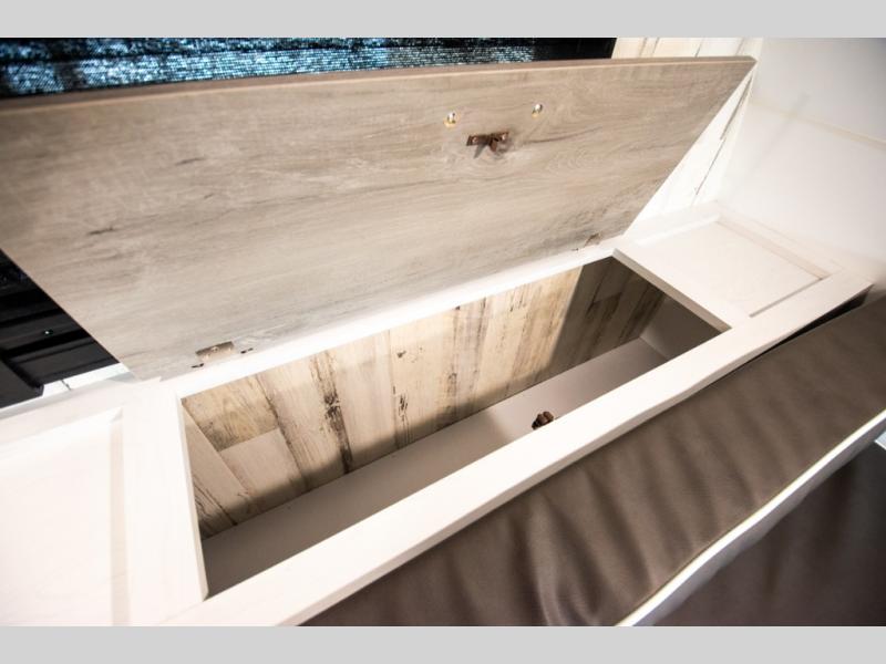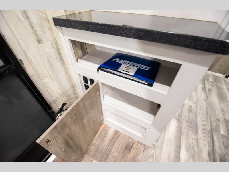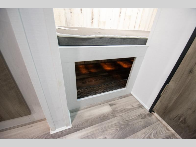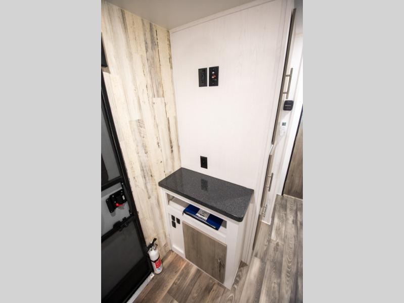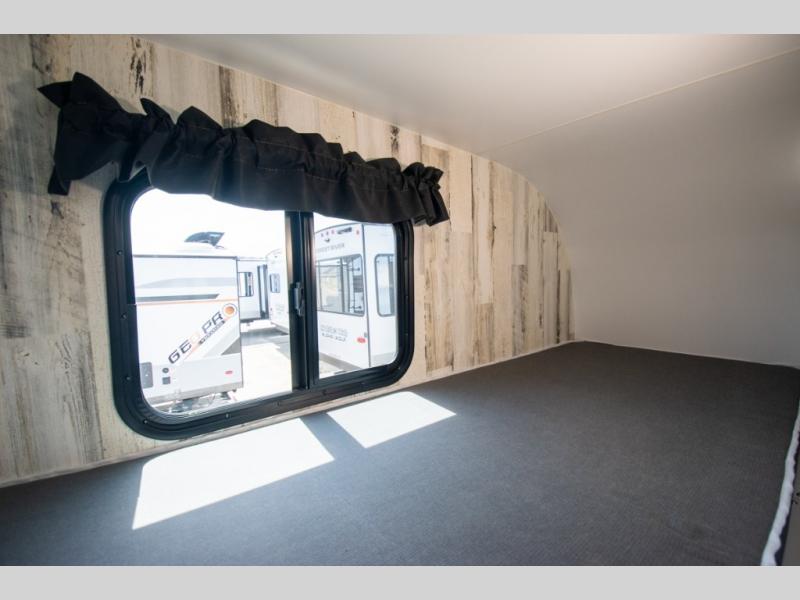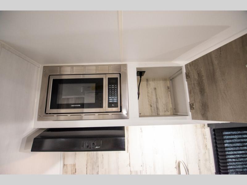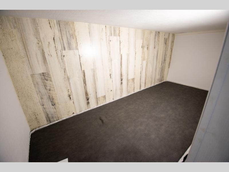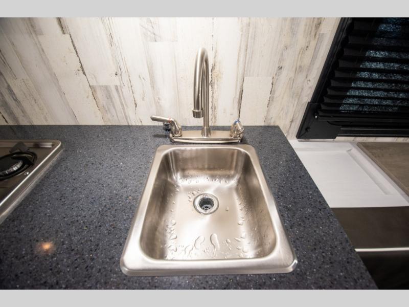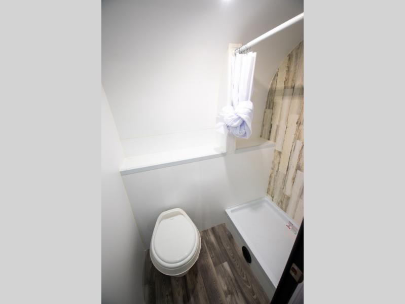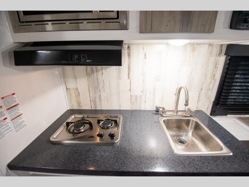 Weekends at the campground are made easy with this travel trailer that can sleep four each night. Once you've unpacked your things, you can stretch your legs around the camp, then head inside to make lunch. You'll find a two burner stainless steel cooktop in the kitchen, along with a 12V refrigerator and a pantry for food storage. There is also a closet with a pull out trash can below that will be perfect to keep cleaning supplies or paper goods in. When it's time to turn in for the night, there are 28" x 72" bunk beds that share the rear of this unit with the private bath, plus a front booth dinette that can convert to a queen-size sleeping space. This travel trailer also includes plenty of storage space, including storage shelves in the bath and above the dinette!