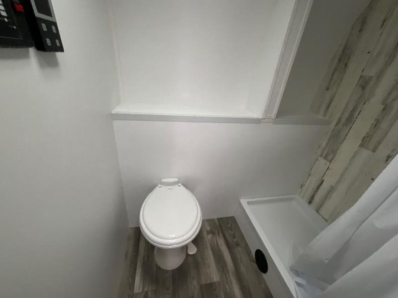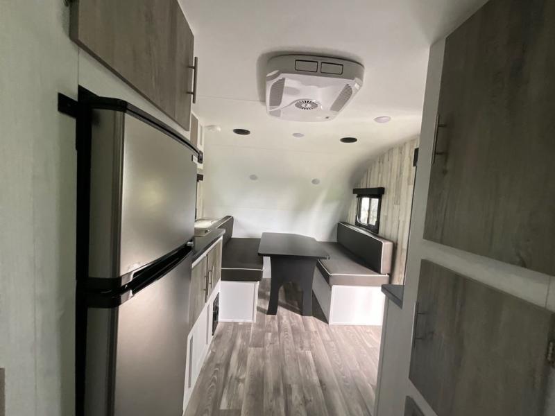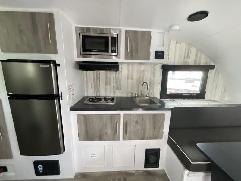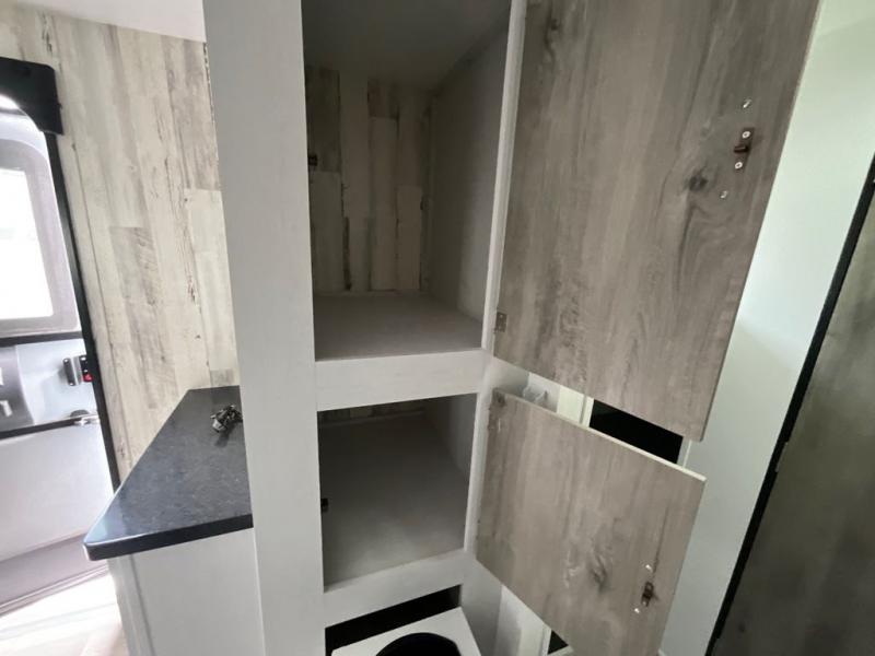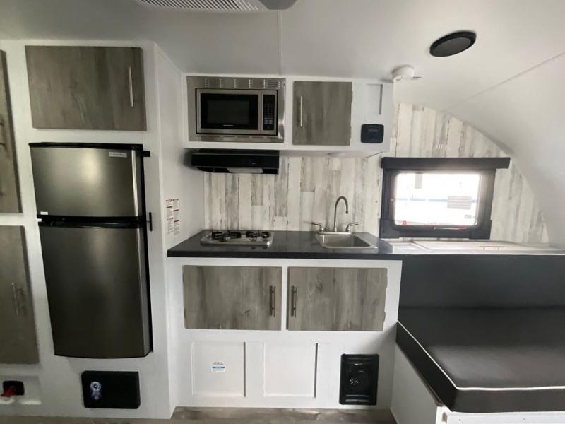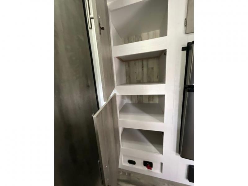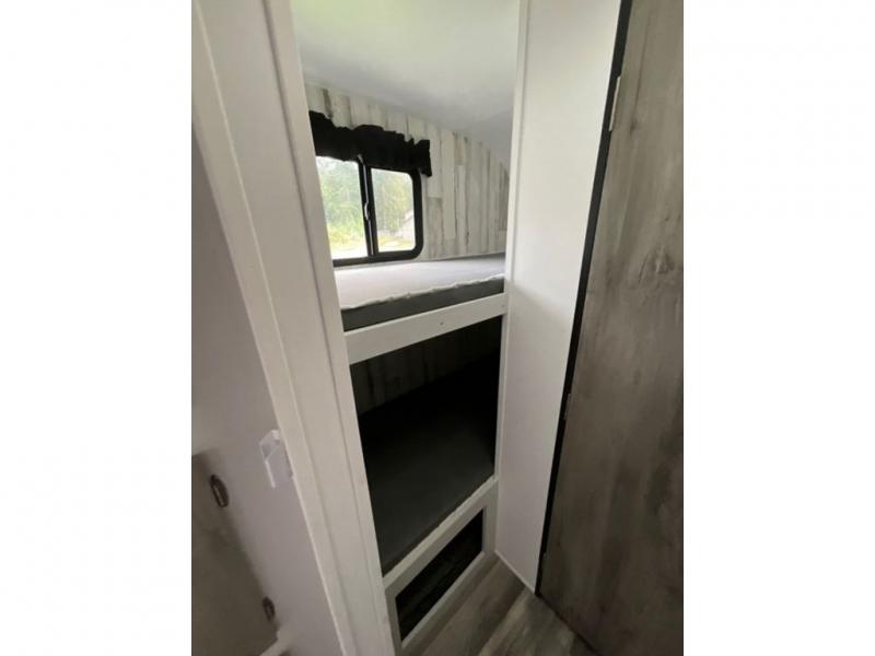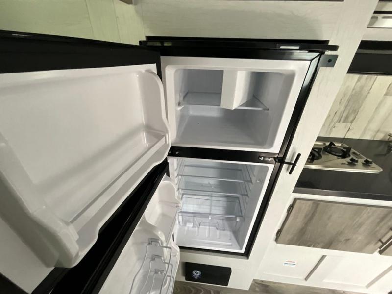Weekends at the campground are made easy with this travel trailer that can sleep four each night. Once you've unpacked your things, you can stretch your legs around the camp, then head inside to make lunch. You'll find a two burner stainless steel cooktop in the kitchen, along with a 12V refrigerator and a pantry for food storage. There is also a closet with a pull out trash can below that will be perfect to keep cleaning supplies or paper goods in. When it's time to turn in for the night, there are 28" x 72" bunk beds that share the rear of this unit with the private bath, plus a front booth dinette that can convert to a queen-size sleeping space. This travel trailer also includes plenty of storage space, including storage shelves in the bath and above the dinette!