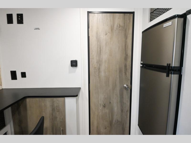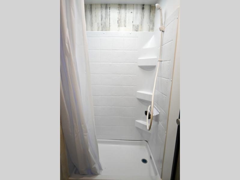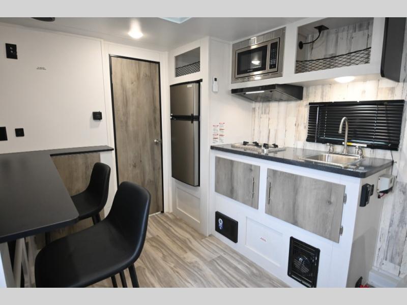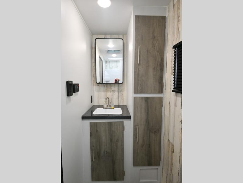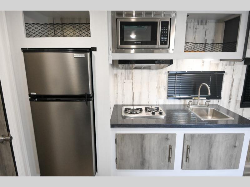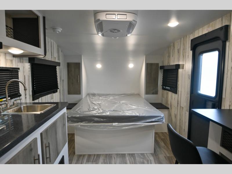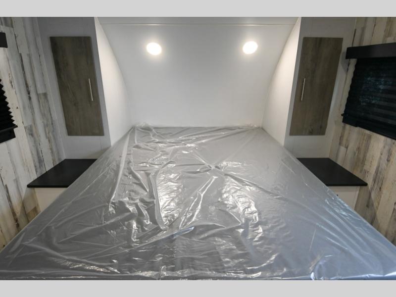 Whether you're looking for a permanent residence, a vacation home, or a weekend getaway, this travel trailer is the perfect choice. Inside, you'll find a spacious rear bathroom, complete with a 24” x 36” shower, closet, and medicine cabinet for all your storage needs—the perfect place to freshen up and feel at home. The kitchen is very complete, featuring a refrigerator, a two-burner cooktop, and a bar top with stools for all your cooking and dining needs. Whether you're cooking up a storm or simply enjoying a quiet breakfast, this kitchen has everything you need to make mealtime a breeze. You will find the perfect place to rest and recharge after a long day of adventure in the comfortable 60” x 80” bed with shirt closets on each side for all your storage needs.