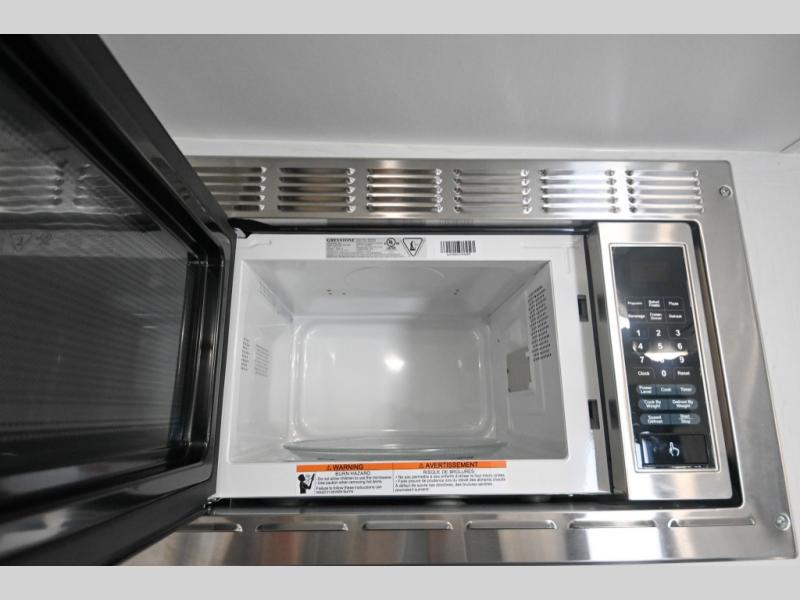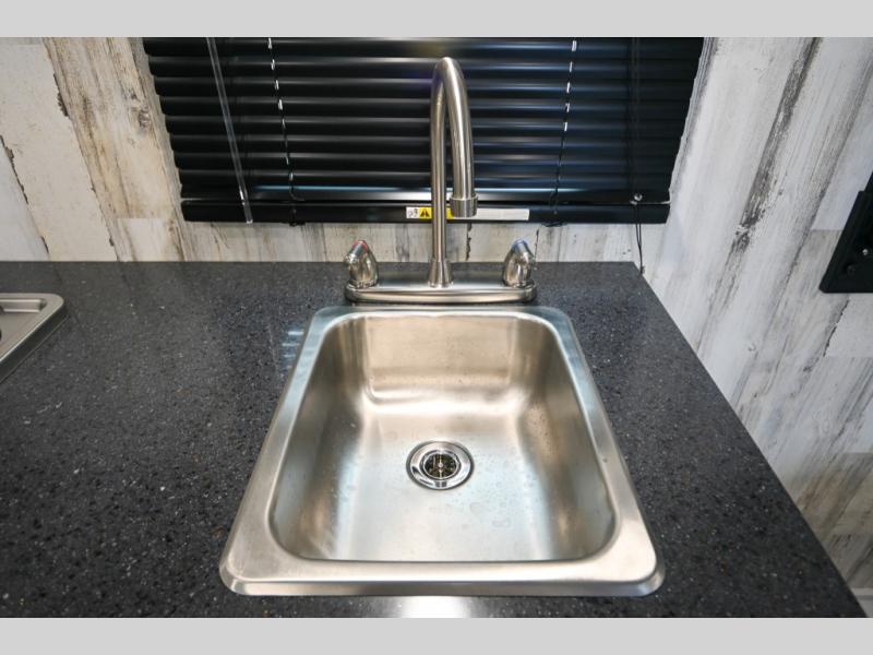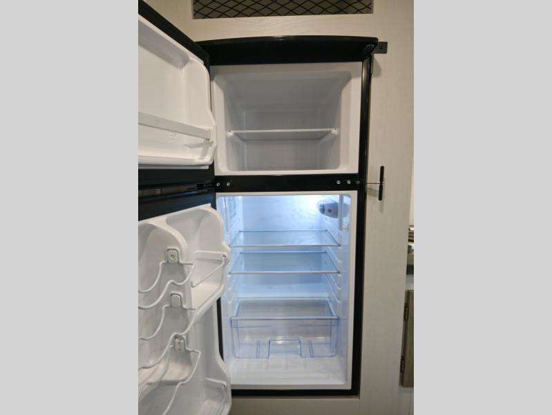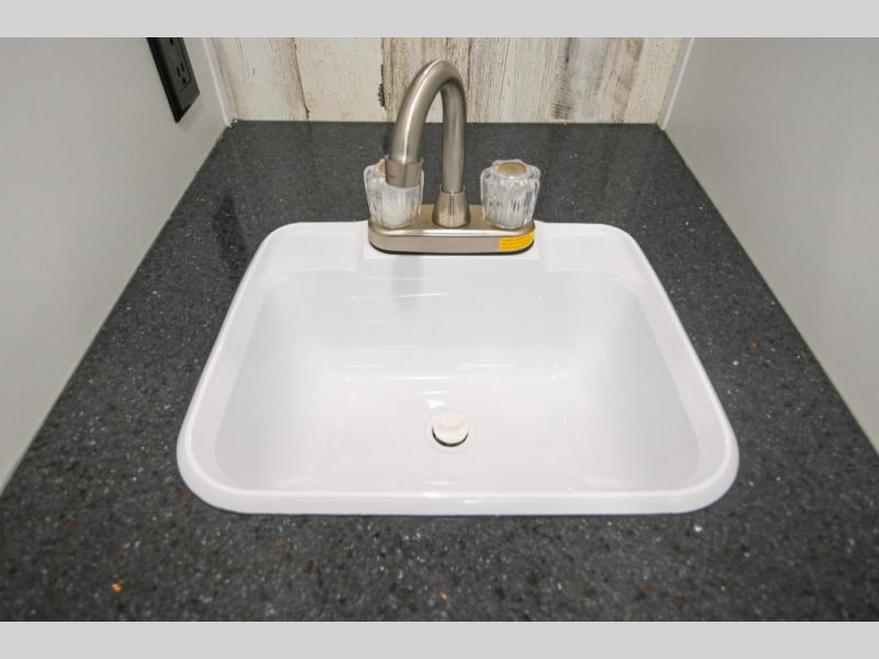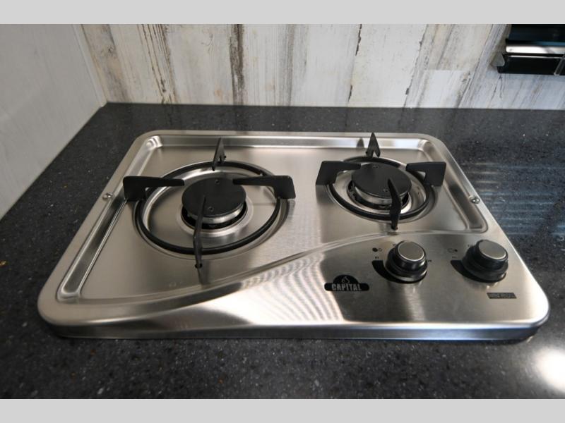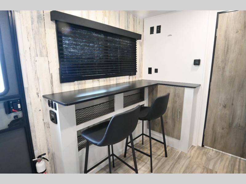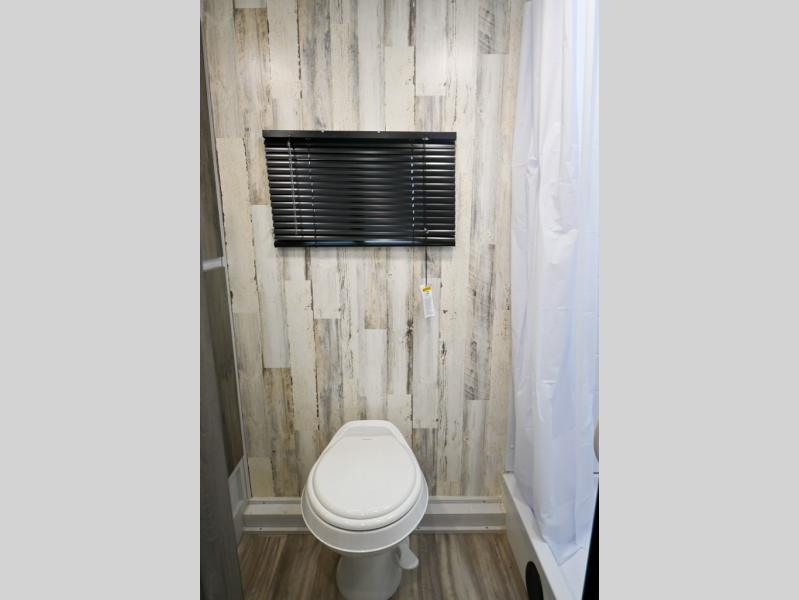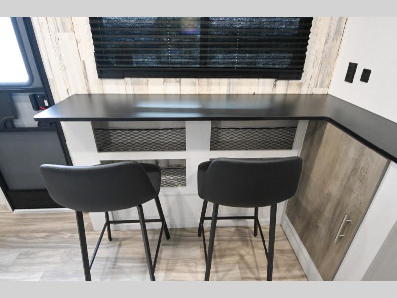 Whether you're looking for a permanent residence, a vacation home, or a weekend getaway, this travel trailer is the perfect choice. Inside, you'll find a spacious rear bathroom, complete with a 24” x 36” shower, closet, and medicine cabinet for all your storage needs—the perfect place to freshen up and feel at home. The kitchen is very complete, featuring a refrigerator, a two-burner cooktop, and a bar top with stools for all your cooking and dining needs. Whether you're cooking up a storm or simply enjoying a quiet breakfast, this kitchen has everything you need to make mealtime a breeze. You will find the perfect place to rest and recharge after a long day of adventure in the comfortable 60” x 80” bed with shirt closets on each side for all your storage needs.