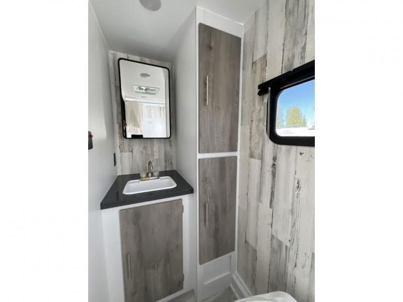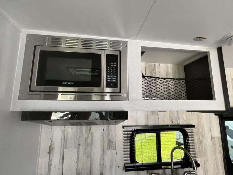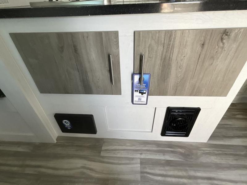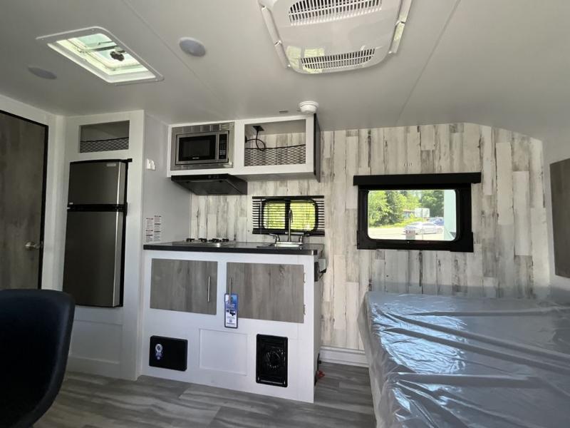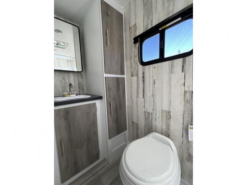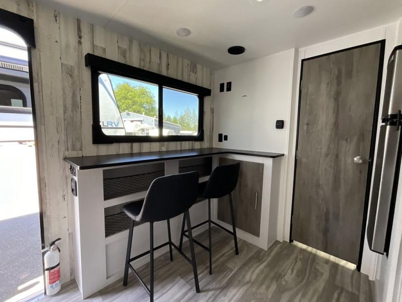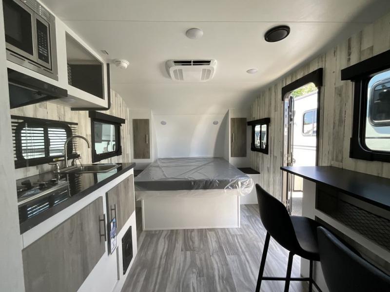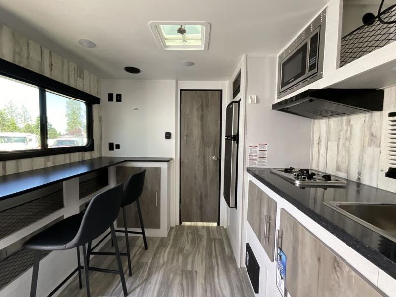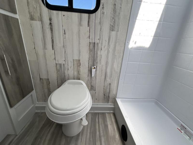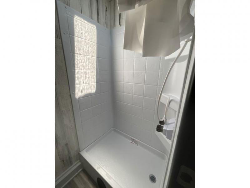 Whether you're looking for a permanent residence, a vacation home, or a weekend getaway, this travel trailer is the perfect choice. Inside, you'll find a spacious rear bathroom, complete with a 24” x 36” shower, closet, and medicine cabinet for all your storage needs—the perfect place to freshen up and feel at home. The kitchen is very complete, featuring a refrigerator, a two-burner cooktop, and a bar top with stools for all your cooking and dining needs. Whether you're cooking up a storm or simply enjoying a quiet breakfast, this kitchen has everything you need to make mealtime a breeze. You will find the perfect place to rest and recharge after a long day of adventure in the comfortable 60” x 80” bed with shirt closets on each side for all your storage needs.
