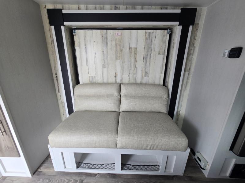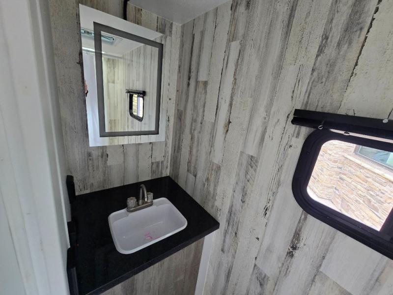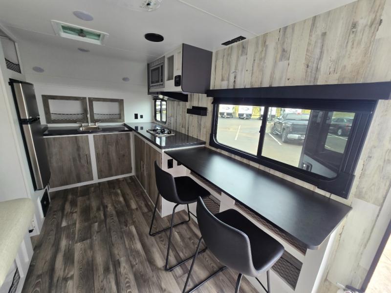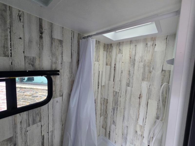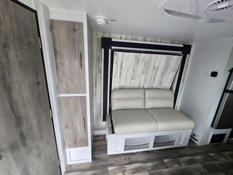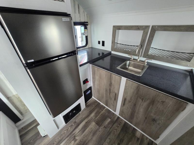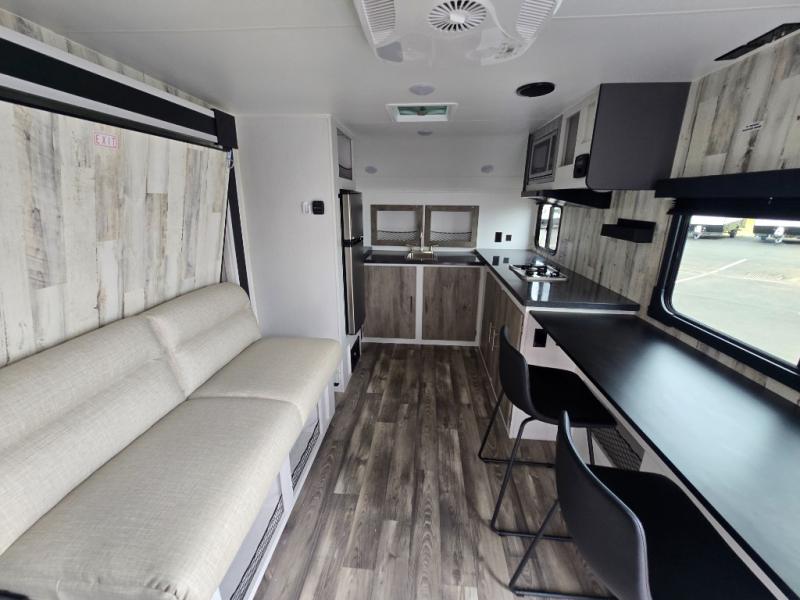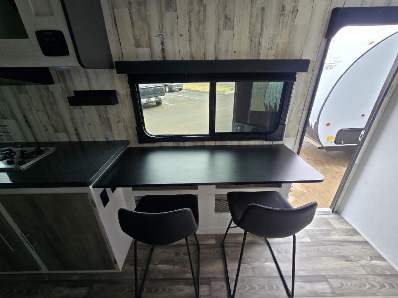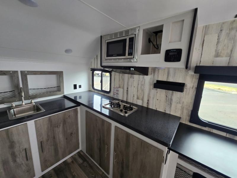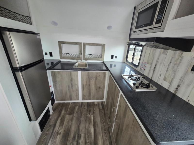 The rear bathroom is a serene oasis, complete with a spacious 24” x 36” shower and medicine cabinet for all your storage needs. The living area features a convenient roll-over sofa/Murphy bed, perfect for relaxing and taking a nap on the road. The bar table top dinette provides additional seating and a great place to enjoy meals. The front kitchen is the perfect blend of convenience and efficiency, featuring a refrigerator, a two-burner countertop, and overhead cabinets for all your cooking and dining needs. Whether cooking up the greatest dinner or enjoying a quiet breakfast, this kitchen has everything you need to make mealtime a breeze.