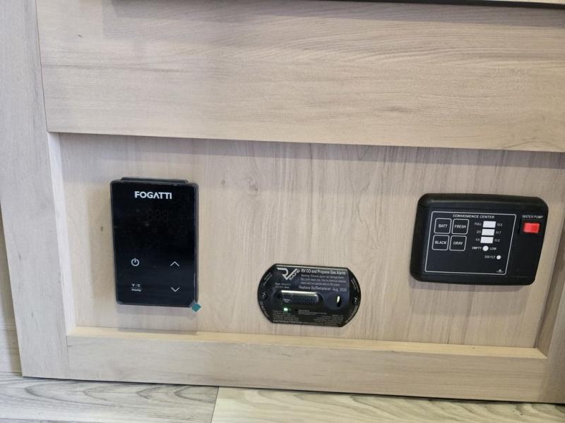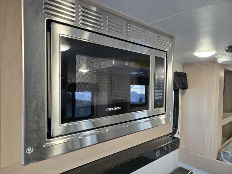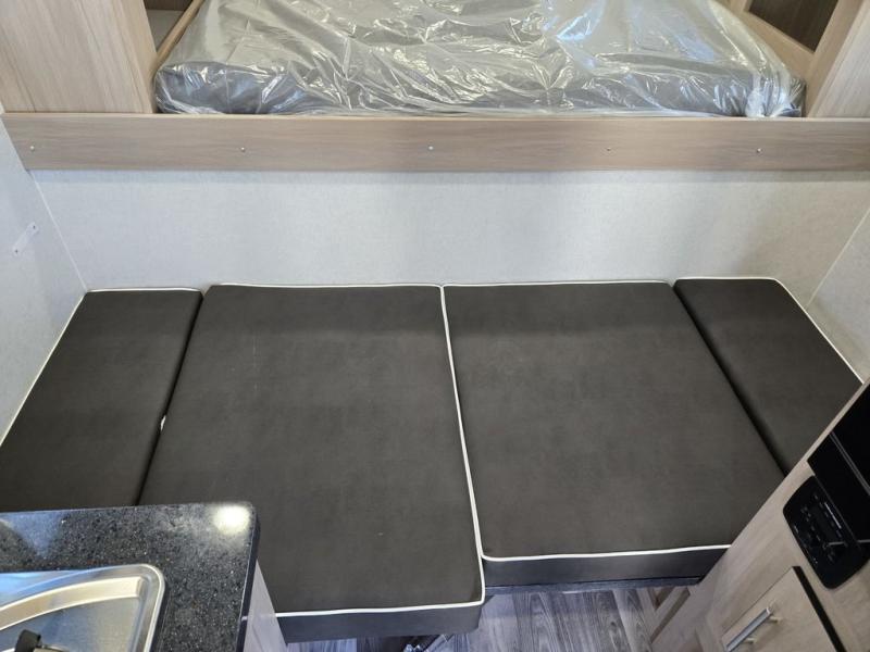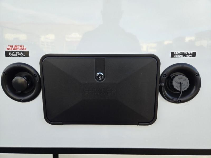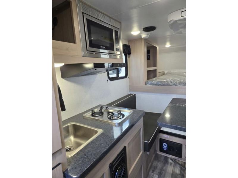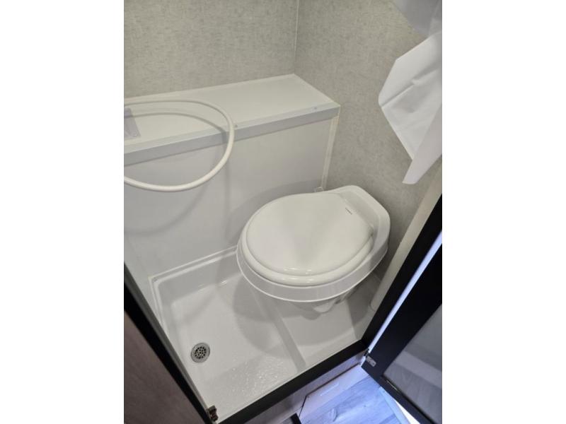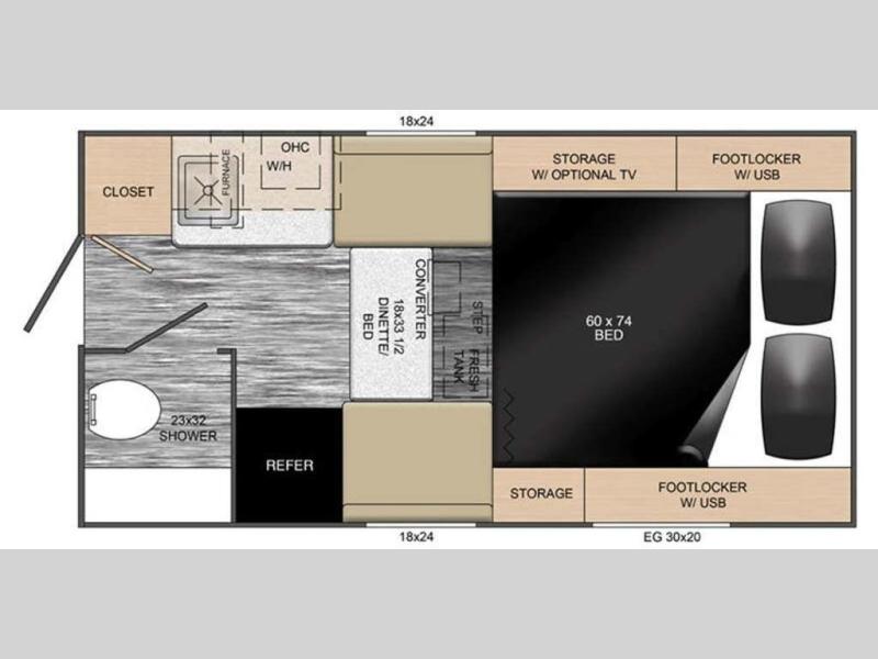 The Up Country 775 has everything you will need to get away! A cozy sleeping space features a roomy bed. Tuck your things away in the storage areas including dual footlockers with integrated USB ports so you can charge your electronics while you snooze. A shelving unit also has room for an optional TV. The kitchen has a dinette which can be converted for additional sleeping space as needed. Enjoy meals cooked on your two-burner stainless steel stove, and clean up in the sink with high rise faucet. A 12V refrigerator keeps your food fresh and cold. As if that's not enough, there's even a bathroom with a 23" x 32" shower!