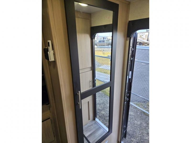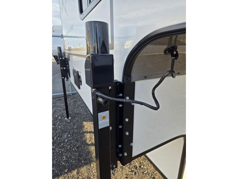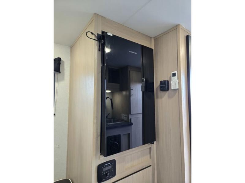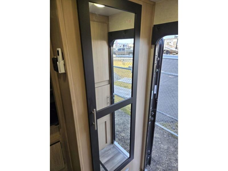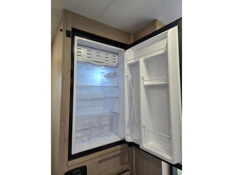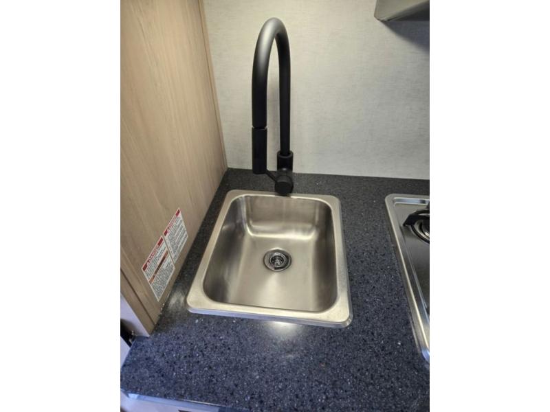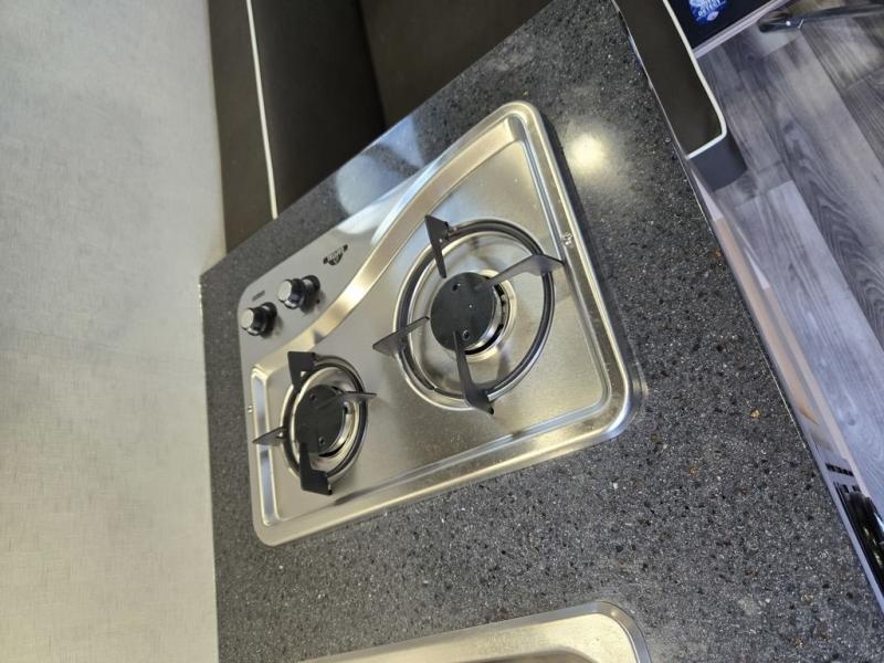 The Up Country 775 has everything you will need to get away! A cozy sleeping space features a roomy bed. Tuck your things away in the storage areas including dual footlockers with integrated USB ports so you can charge your electronics while you snooze. A shelving unit also has room for an optional TV. The kitchen has a dinette which can be converted for additional sleeping space as needed. Enjoy meals cooked on your two-burner stainless steel stove, and clean up in the sink with high rise faucet. A 12V refrigerator keeps your food fresh and cold. As if that's not enough, there's even a bathroom with a 23" x 32" shower!